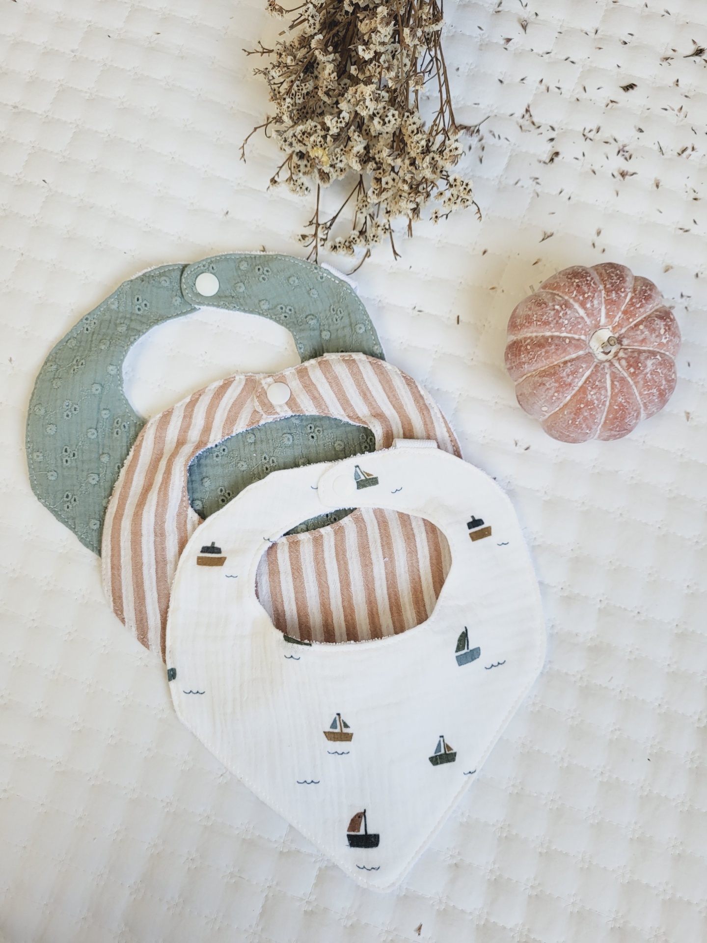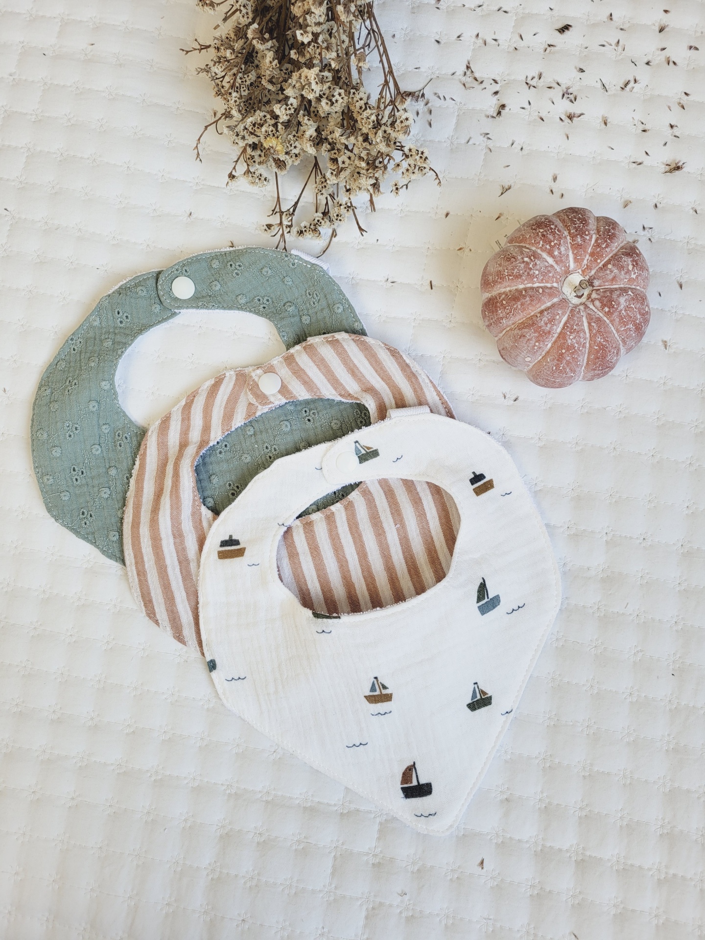 Bandanas coleção barquinhos 9,00 € Desconto de %. Partilhar Padrão Barquinhos Riscas tijolo Bordado inglês verde Pack 3 bandanas Comprar Contactar Banadas em musselina 100% algodão. Tecido muito suave e absorvente, são os babetes ideias para as babinhas do seu bebé. O interior é plastificado e a parte de trás do babete em turco macio.