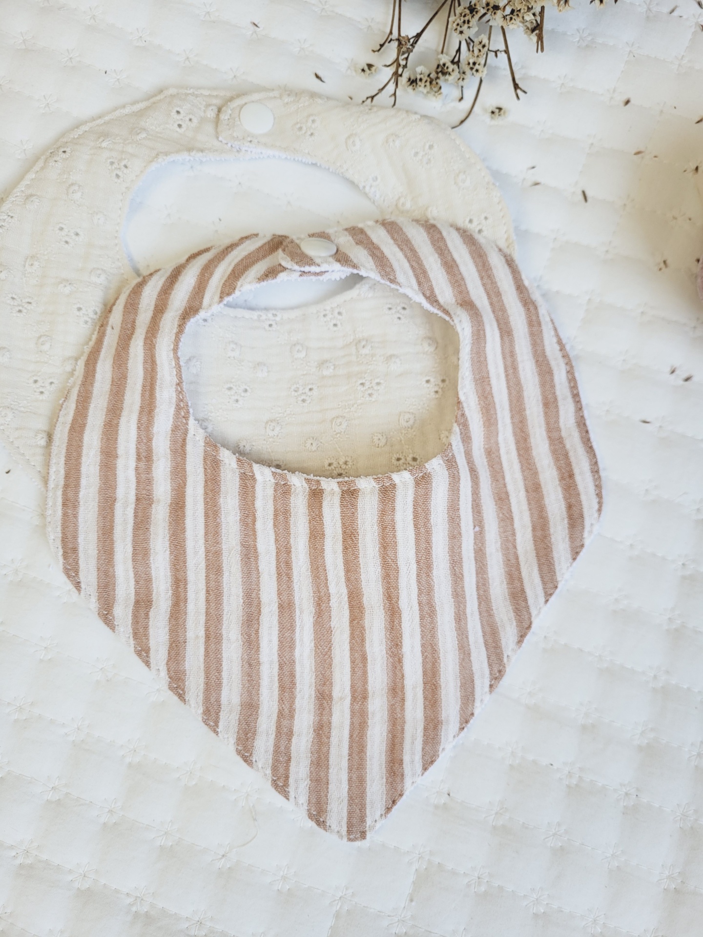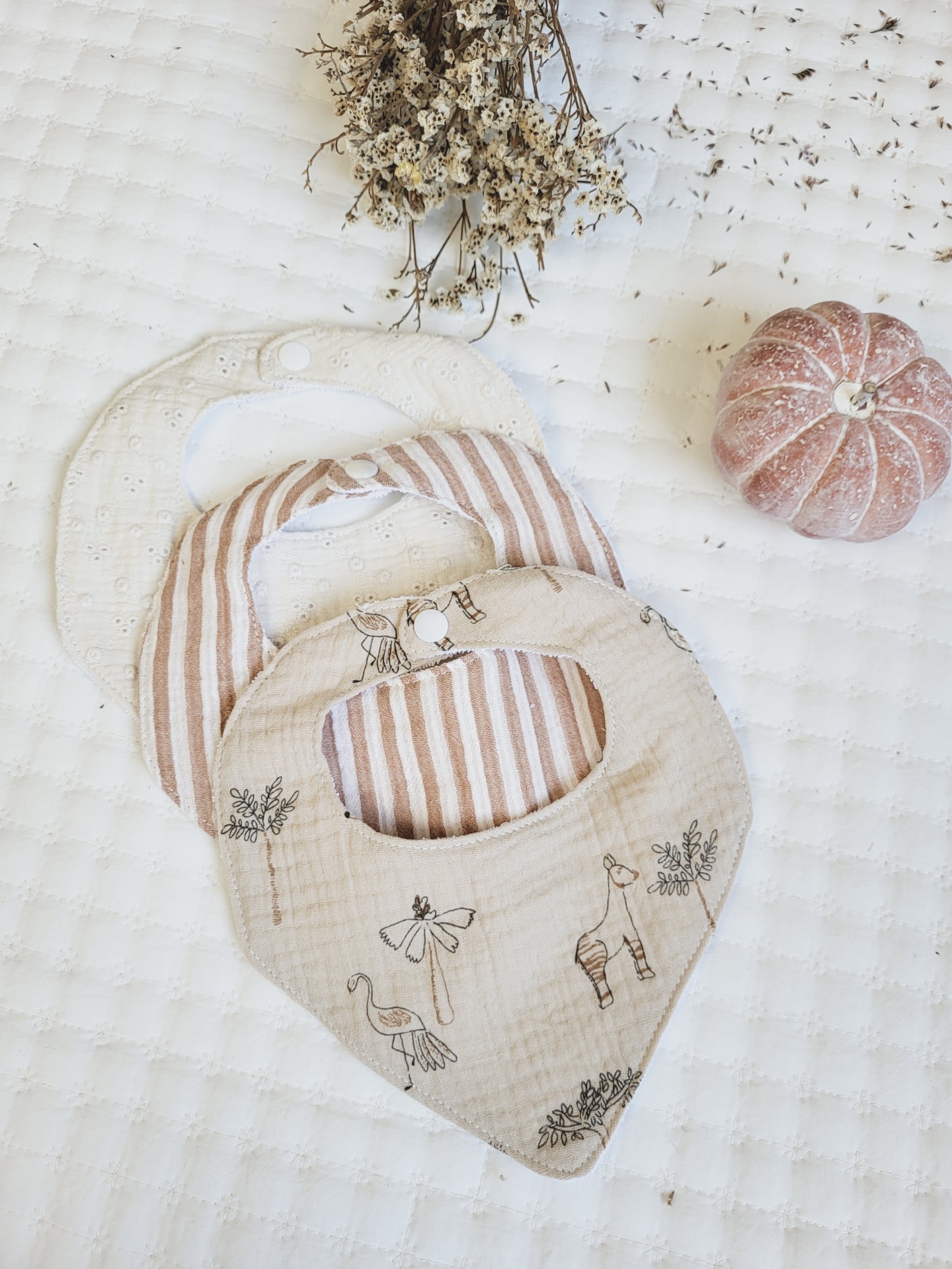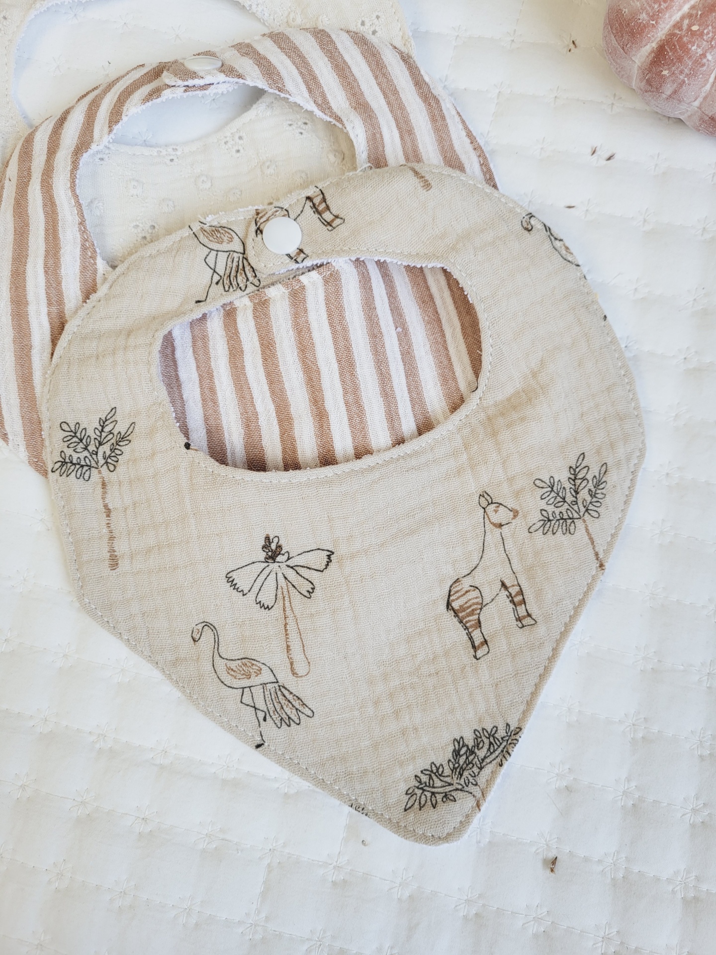 Bandanas coleção savana 9,00 € Desconto de %. Partilhar Padrão Savana Riscas tijolo Bordado inglês cru Pack de 3 bandanas Comprar Contactar Banadas em musselina 100% algodão. Tecido muito suave e absorvente, são os babetes ideias para as babinhas do seu bebé. O interior é plastificado e a parte de trás do babete em turco macio.