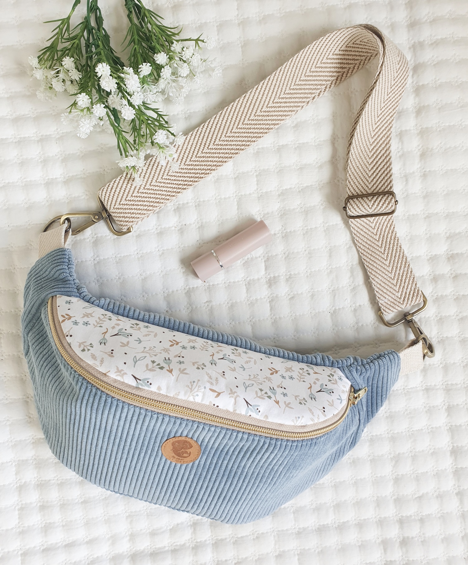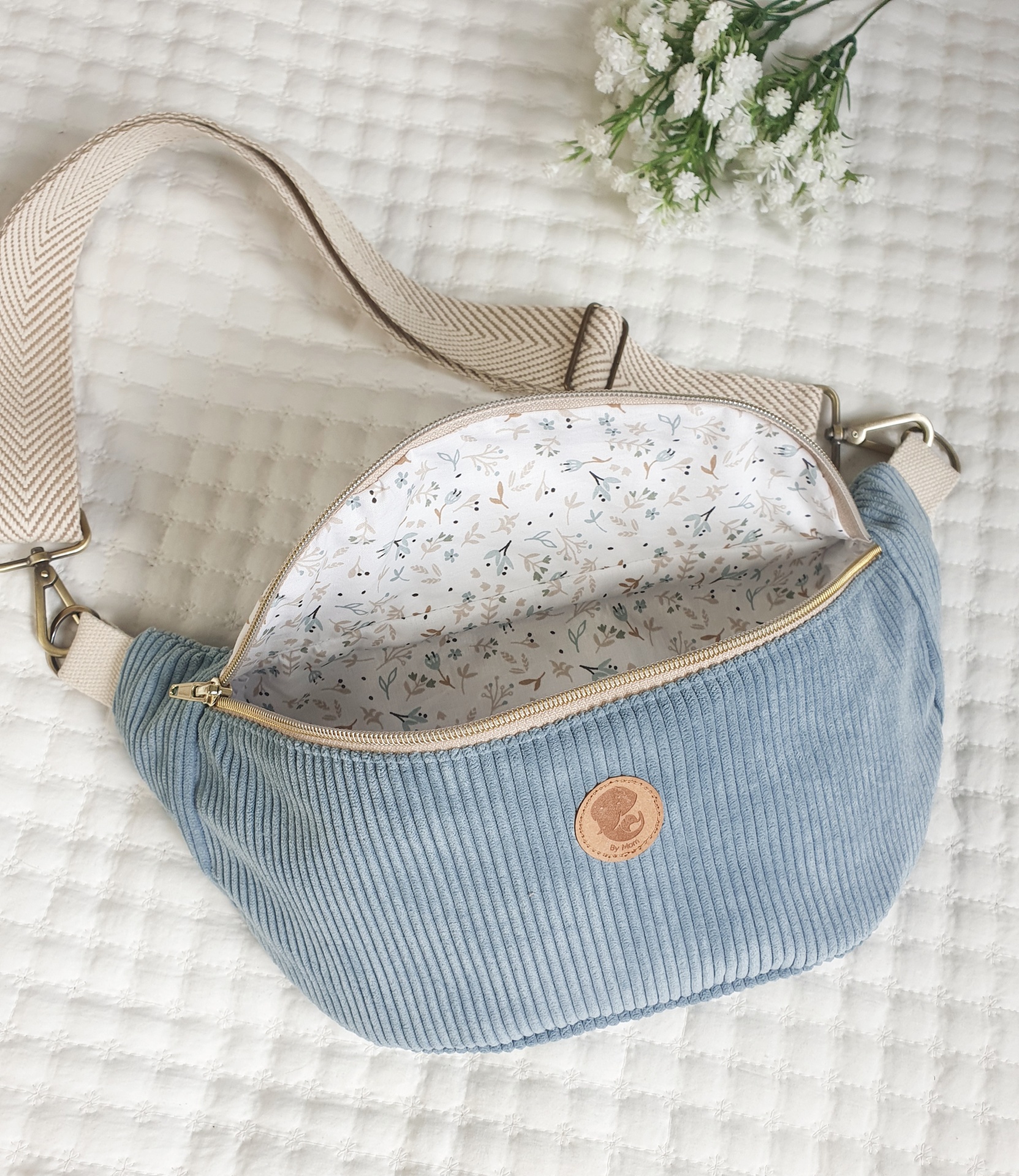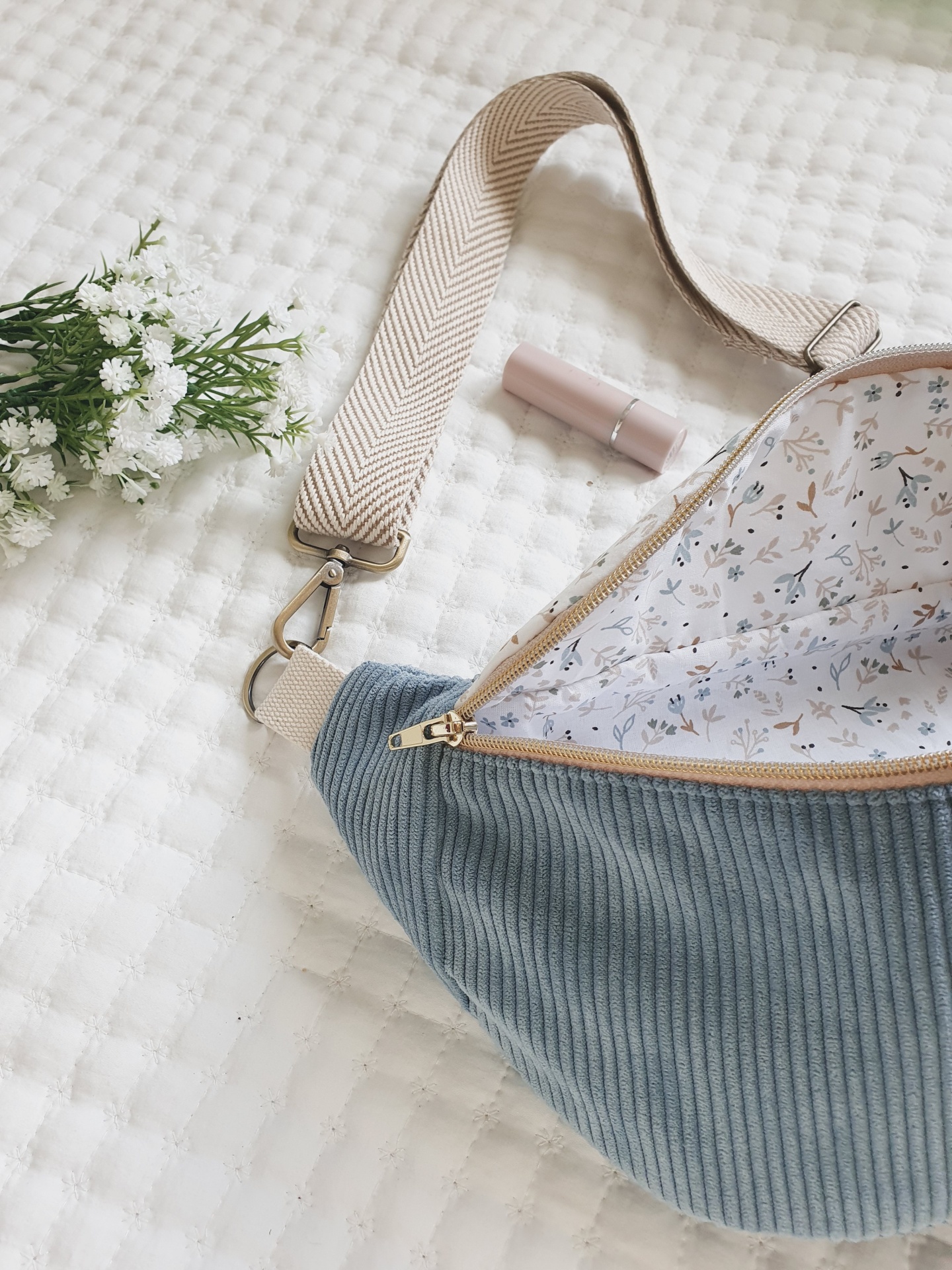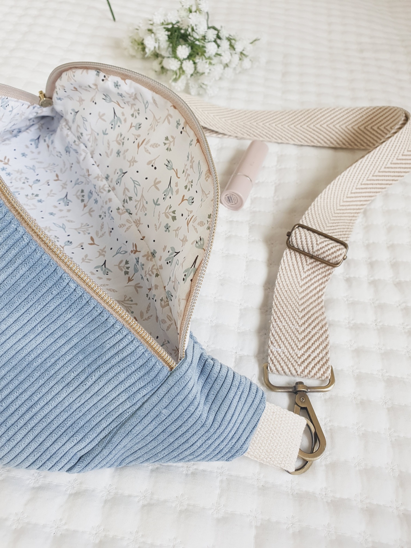 • Bolsa azul tipo pochete em veludo cotelê com alça bege ajustável e interior floral