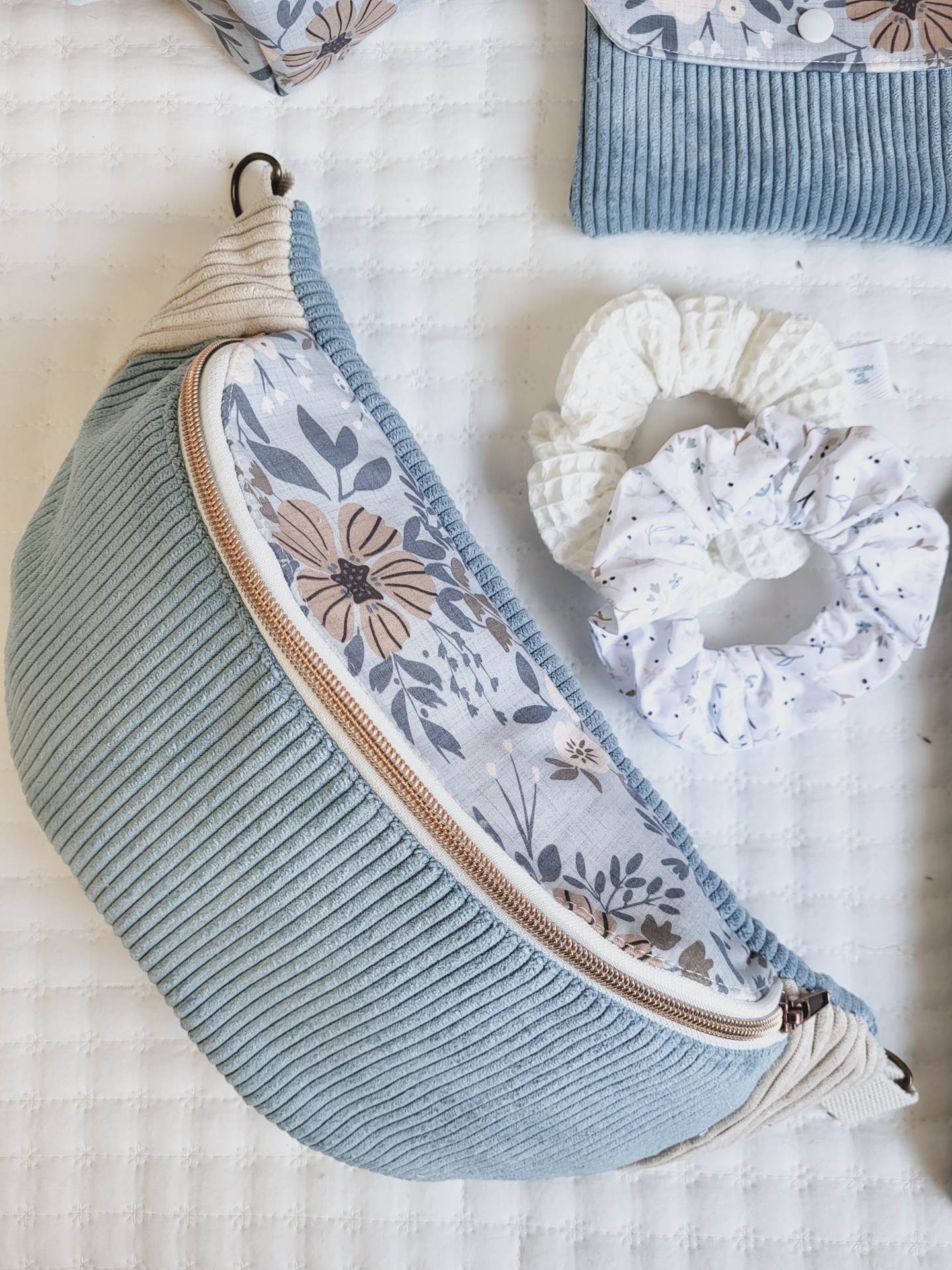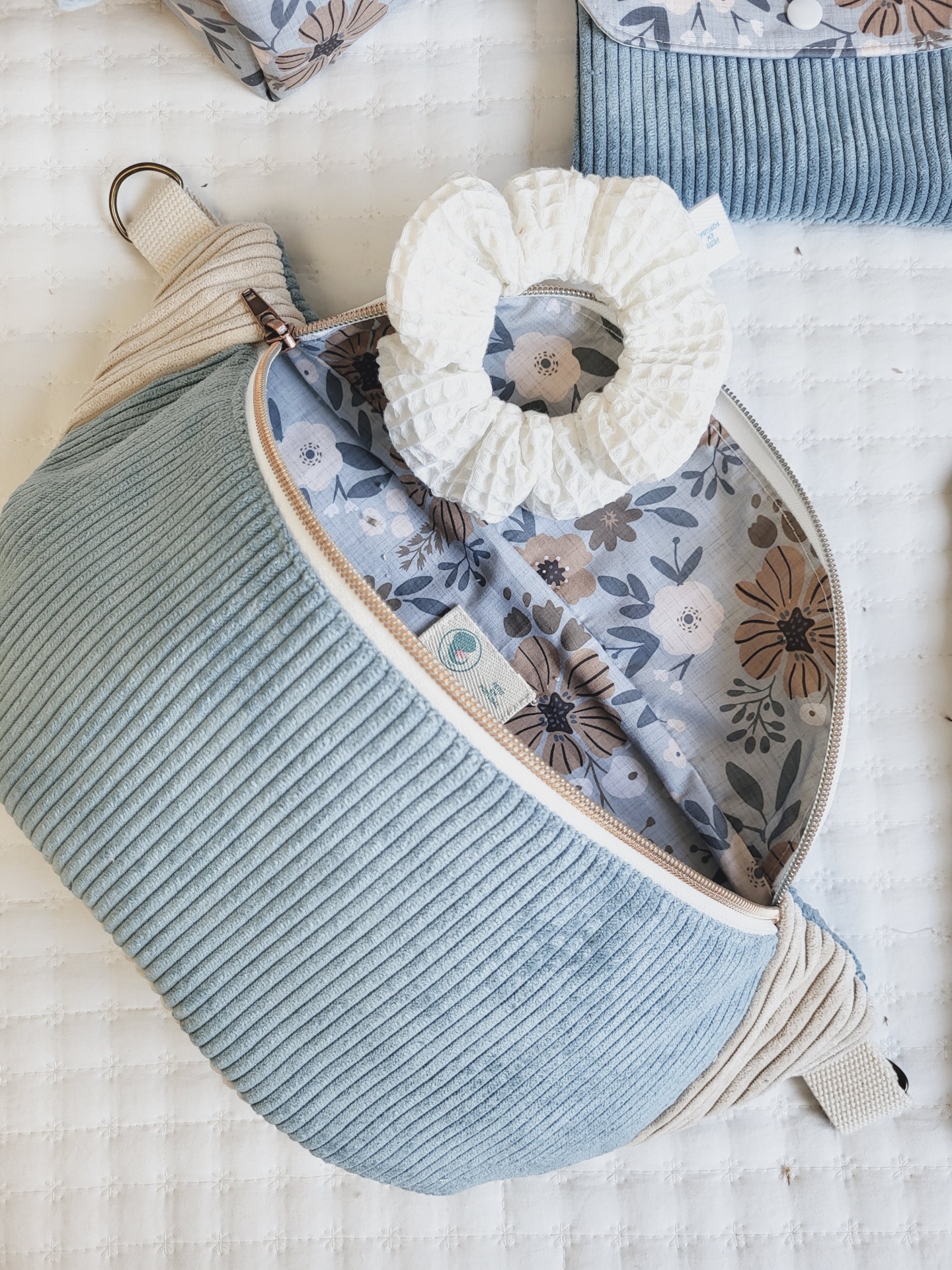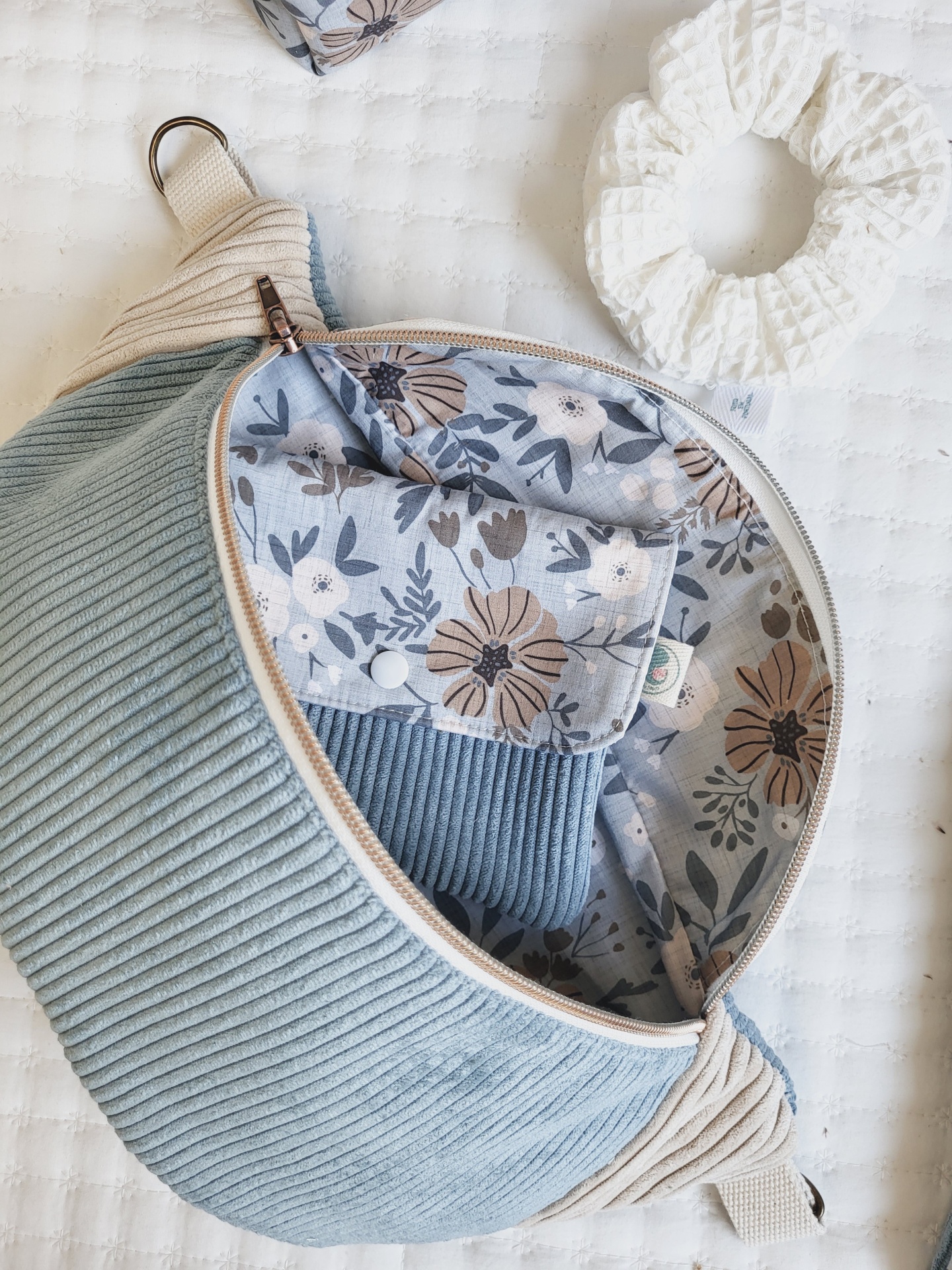 • Bolsa azul claro e bege com padrão floral interior e scrunchie branco sobre colcha branca