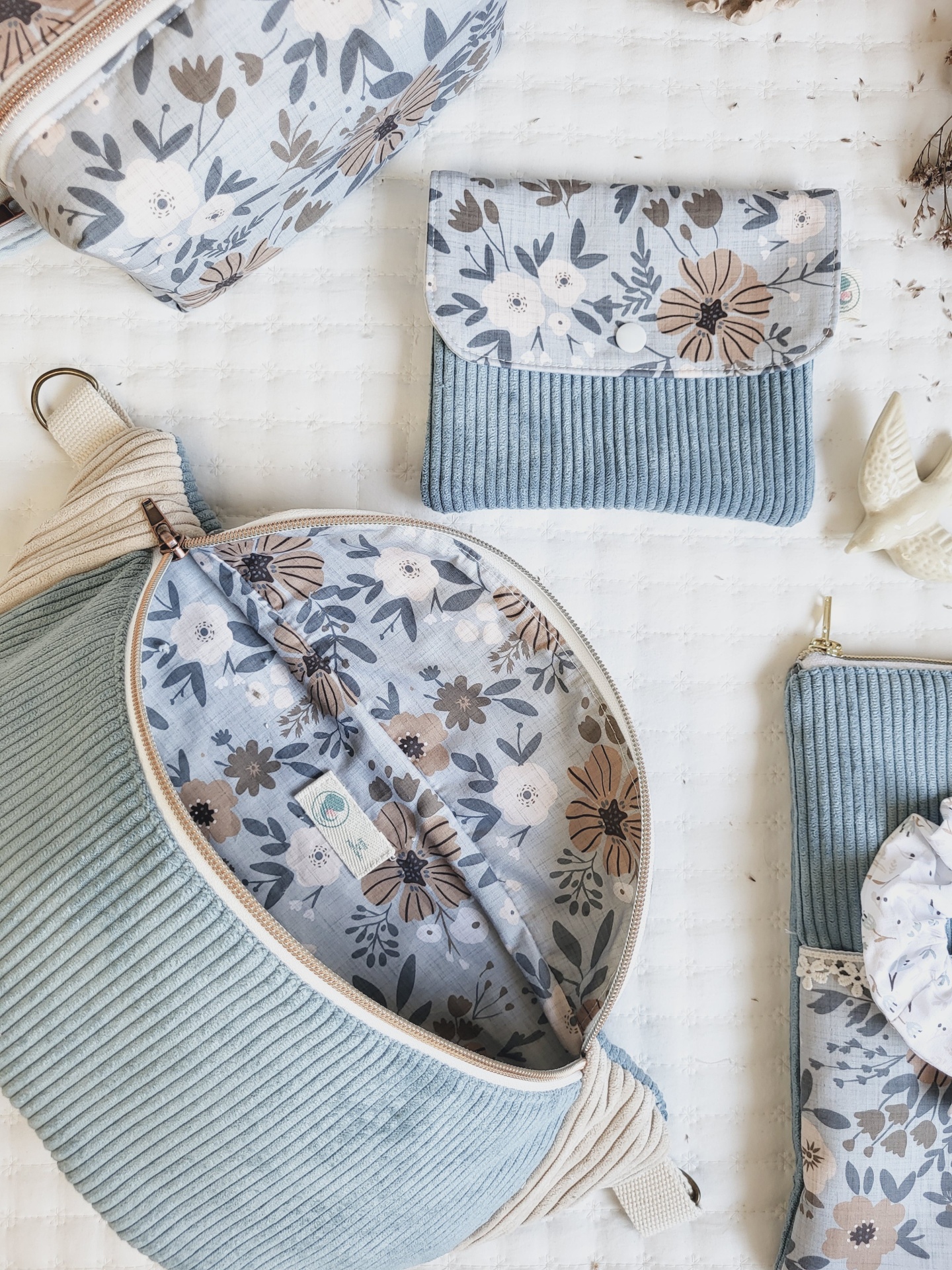 • conjunto de acessórios de tecido floral azul, bege e castanho sobre manta branca com flores secas