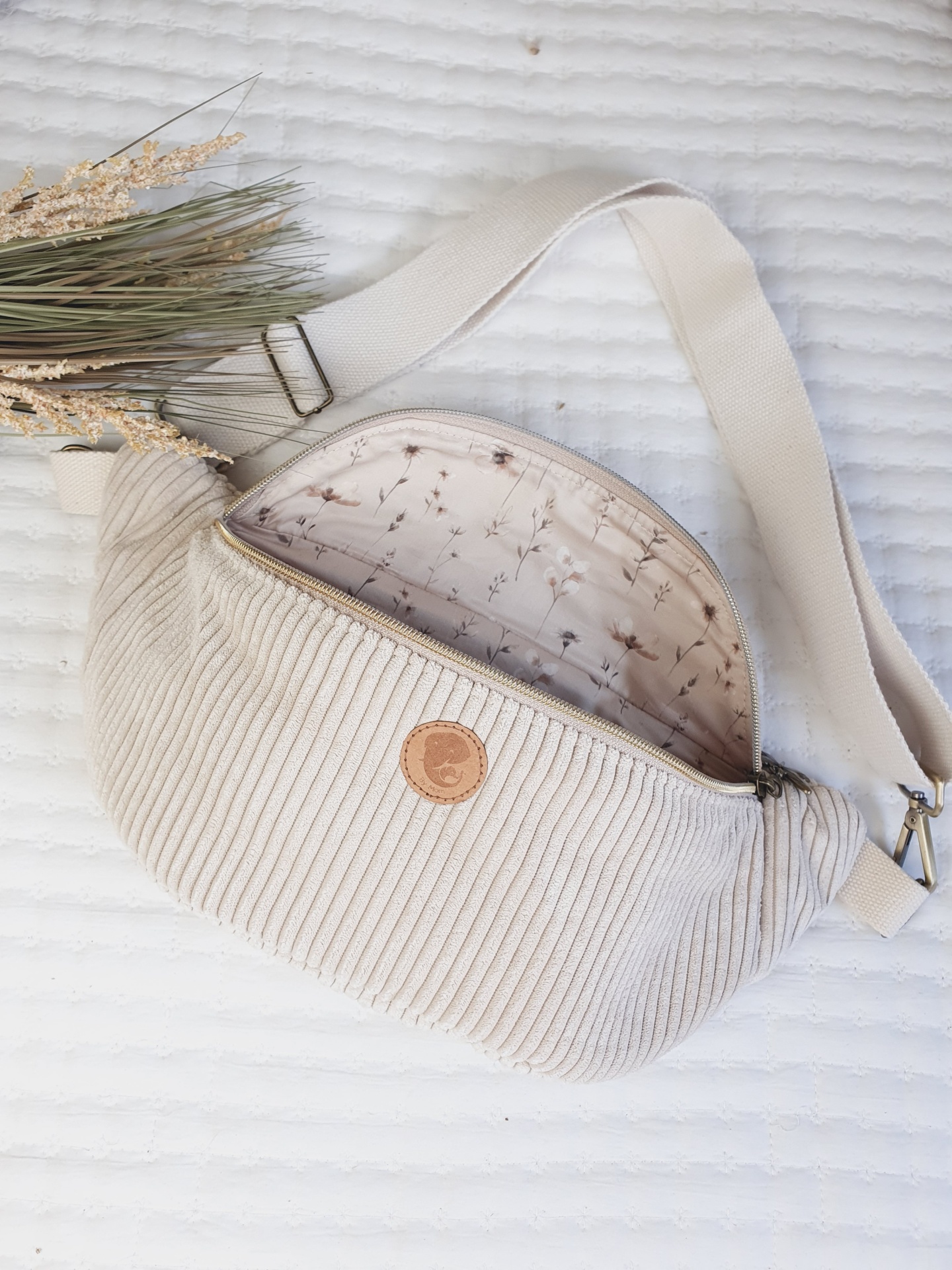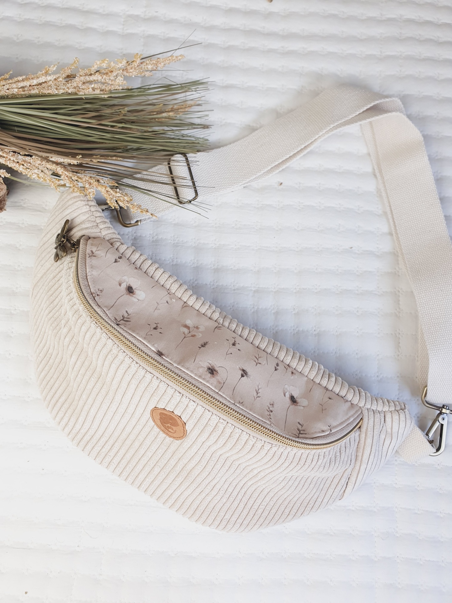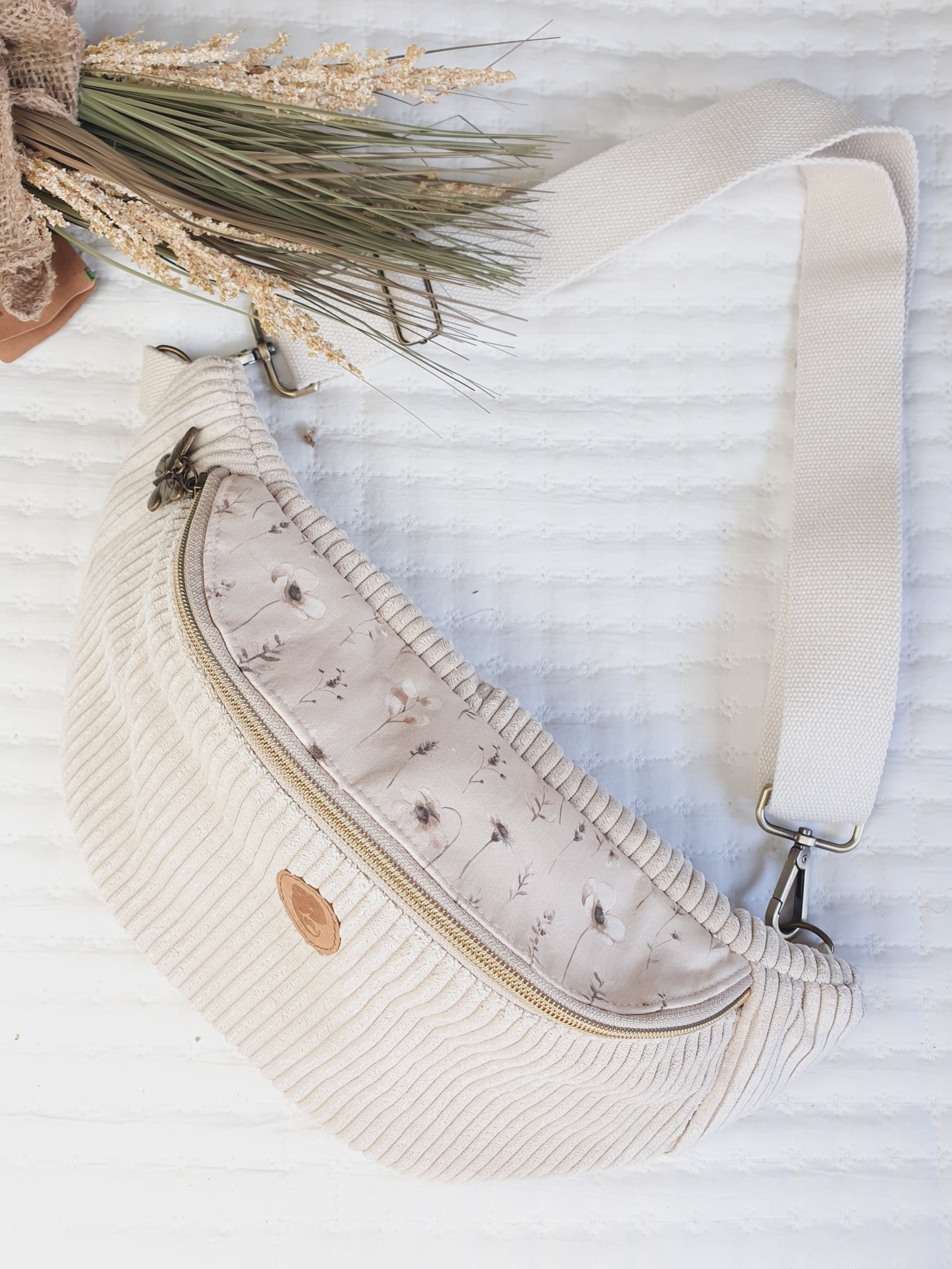 • Bolsa tipo pochete bege em tecido canelado com interior floral e alça ajustável