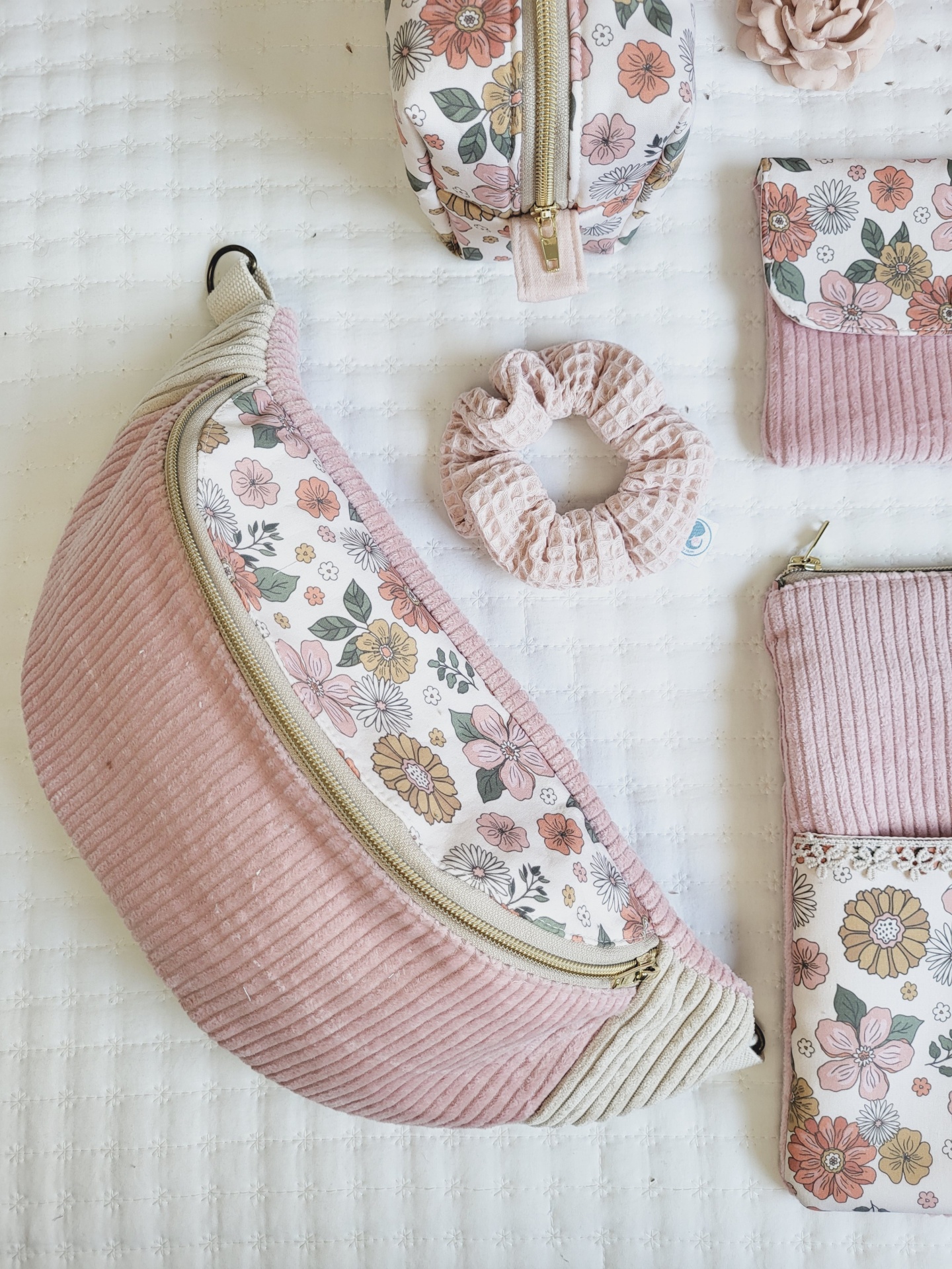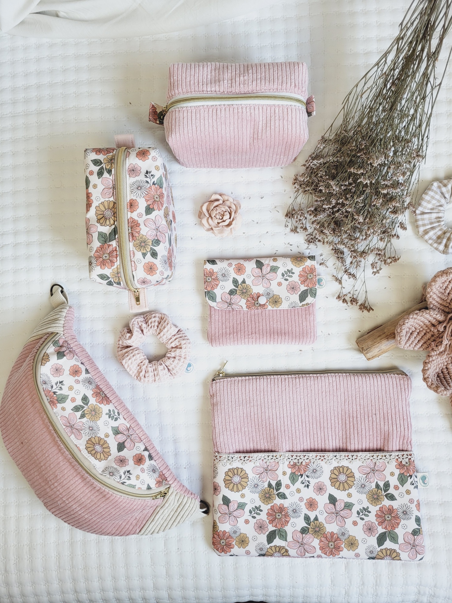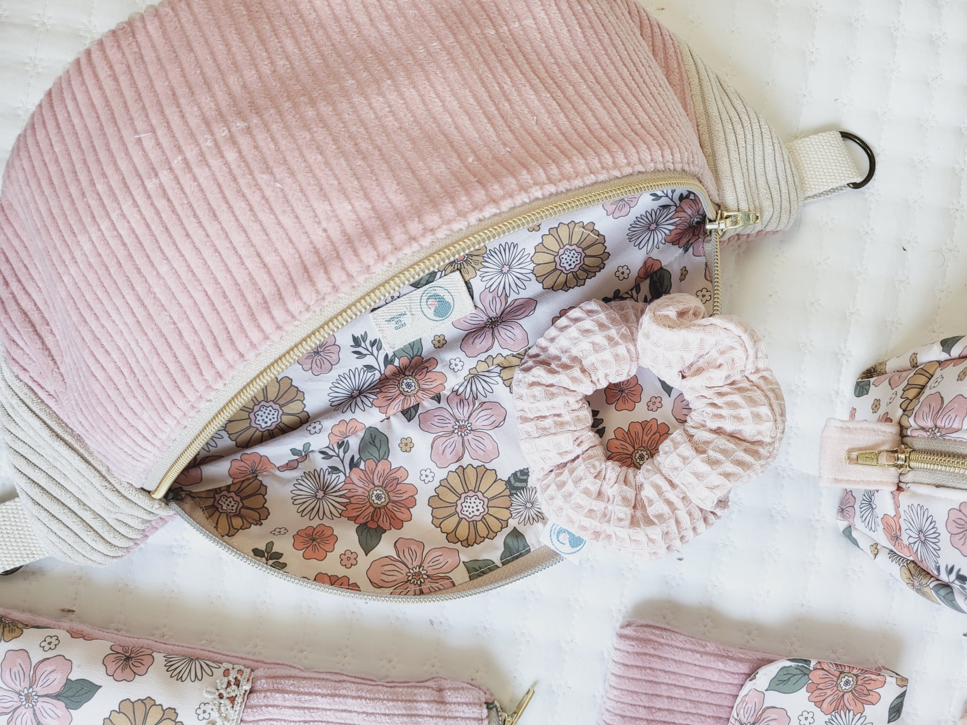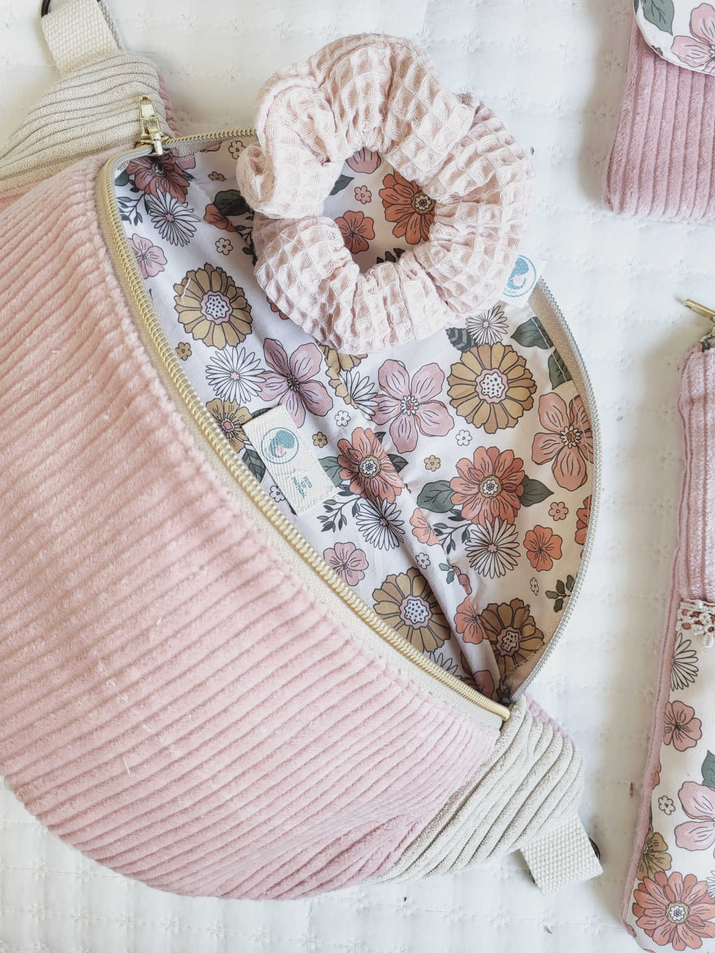 • Mala rosa e creme de veludo cotelê aberta mostrando interior floral com scrunchie rosa