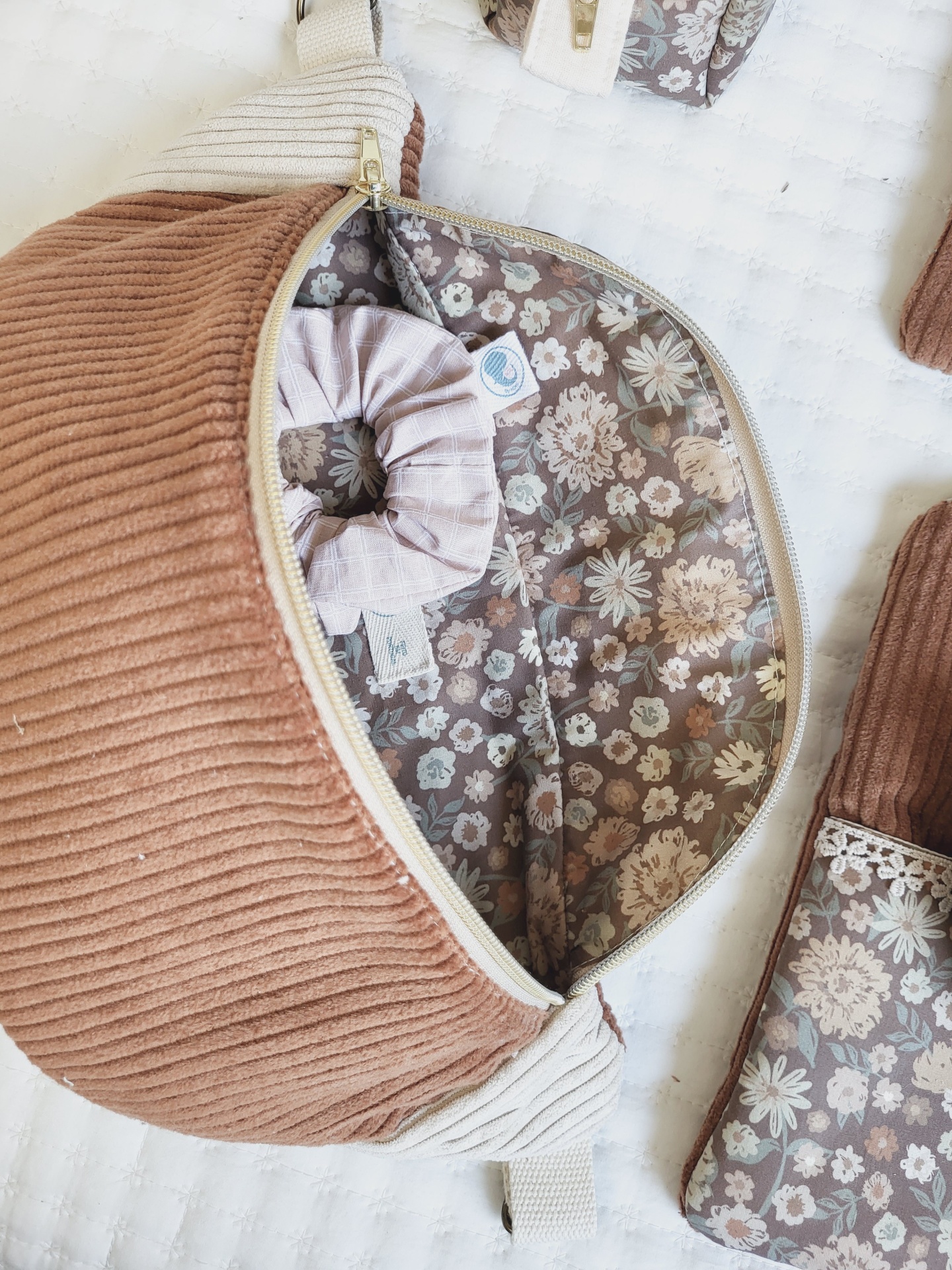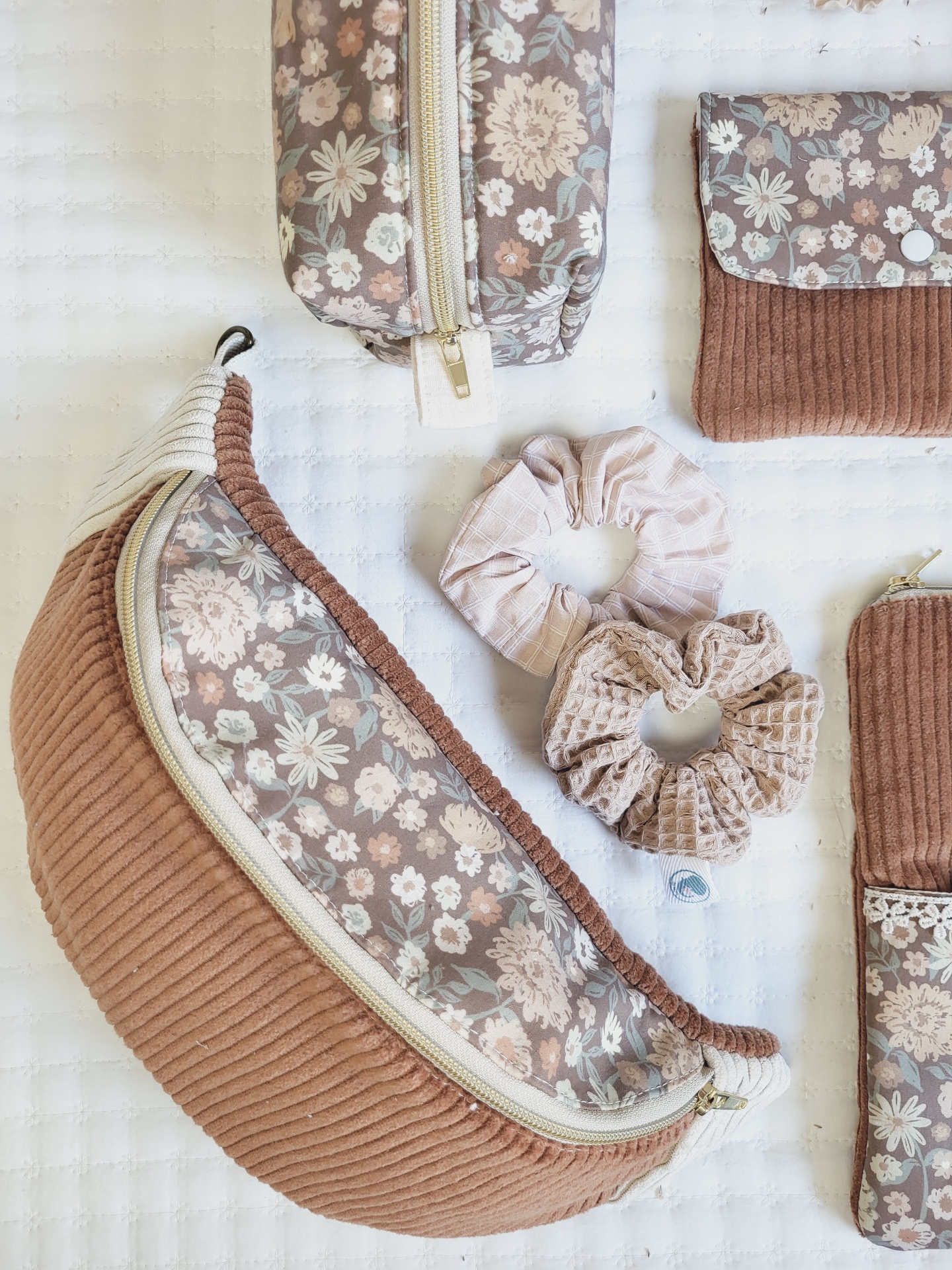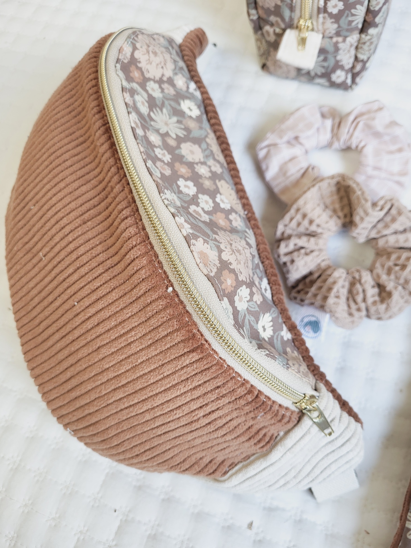 • Bolsa de mão de veludo cotelê castanho e bege com padrão floral e dois elásticos de cabelo