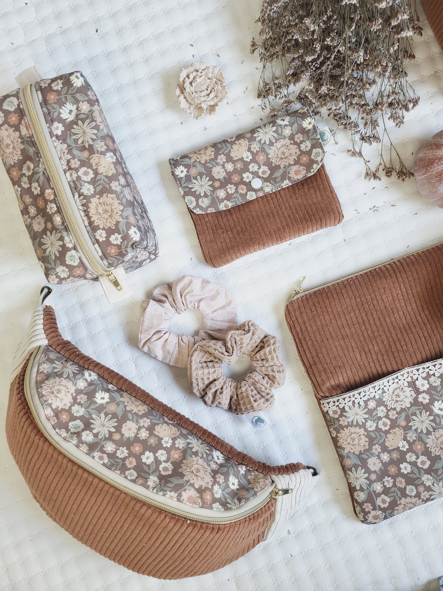 Conjunto de acessórios com textura canelada e padrão floral em tons castanho e bege
