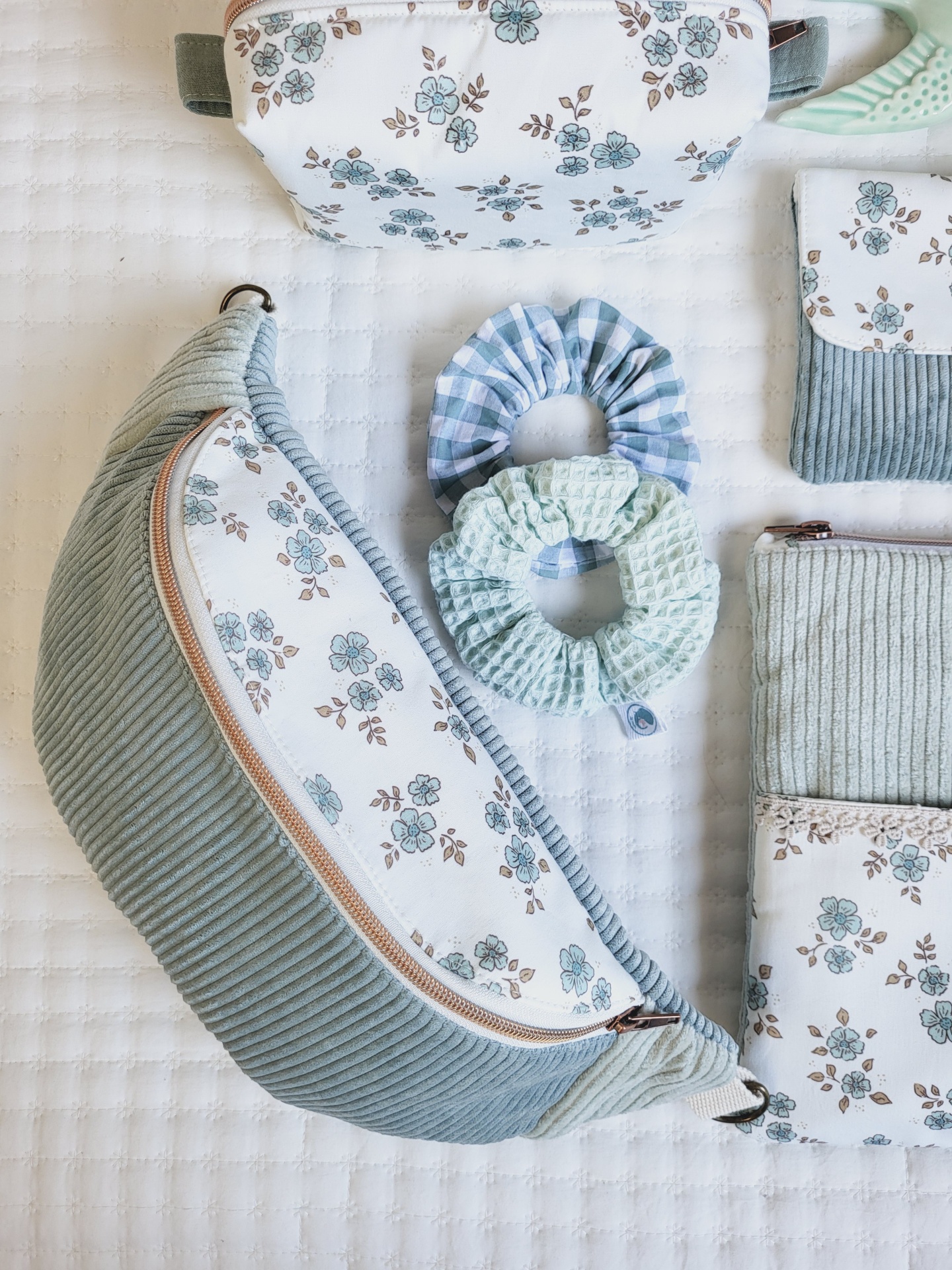 Conjunto de acessórios azul com padrão floral e tecidos variados.