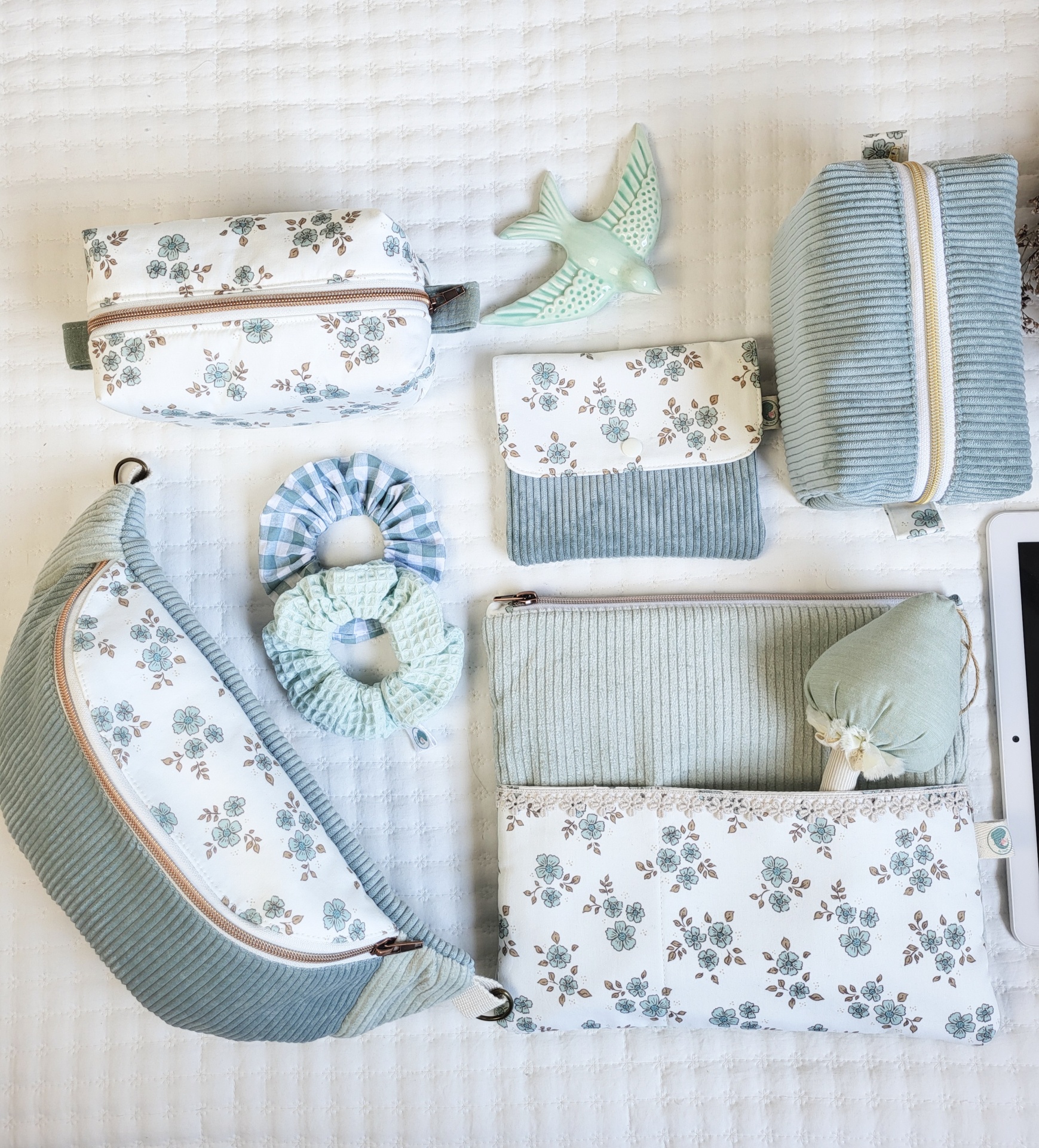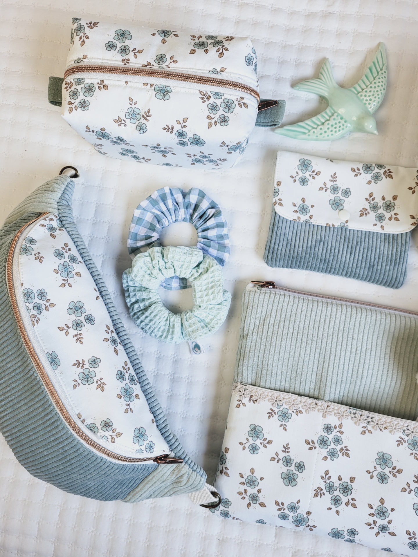 • Conjunto de acessórios de tecido com padrão floral azul, scrunchies, necesseire e pássaro decorativo em verde.