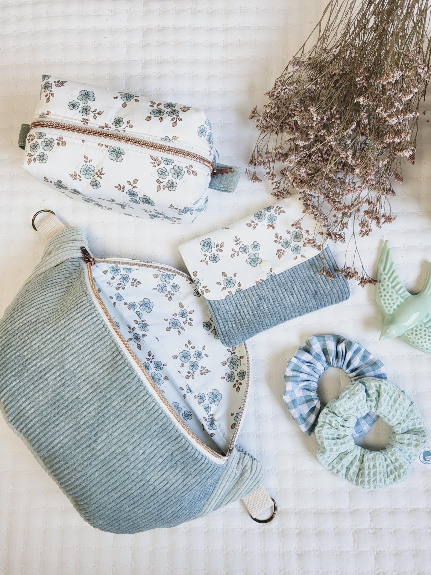 • Conjunto de acessórios azul com padrão floral e tecidos variados.
