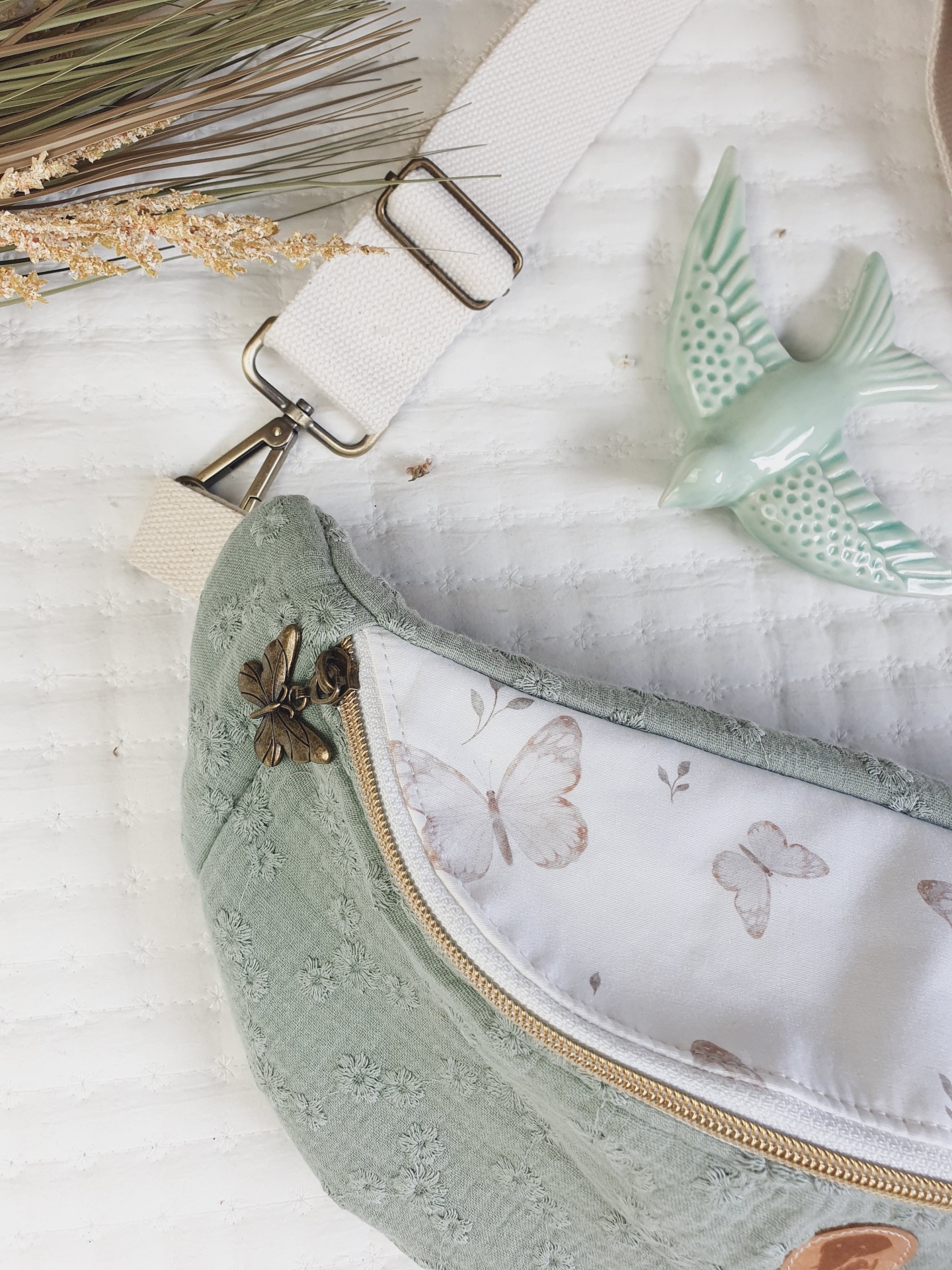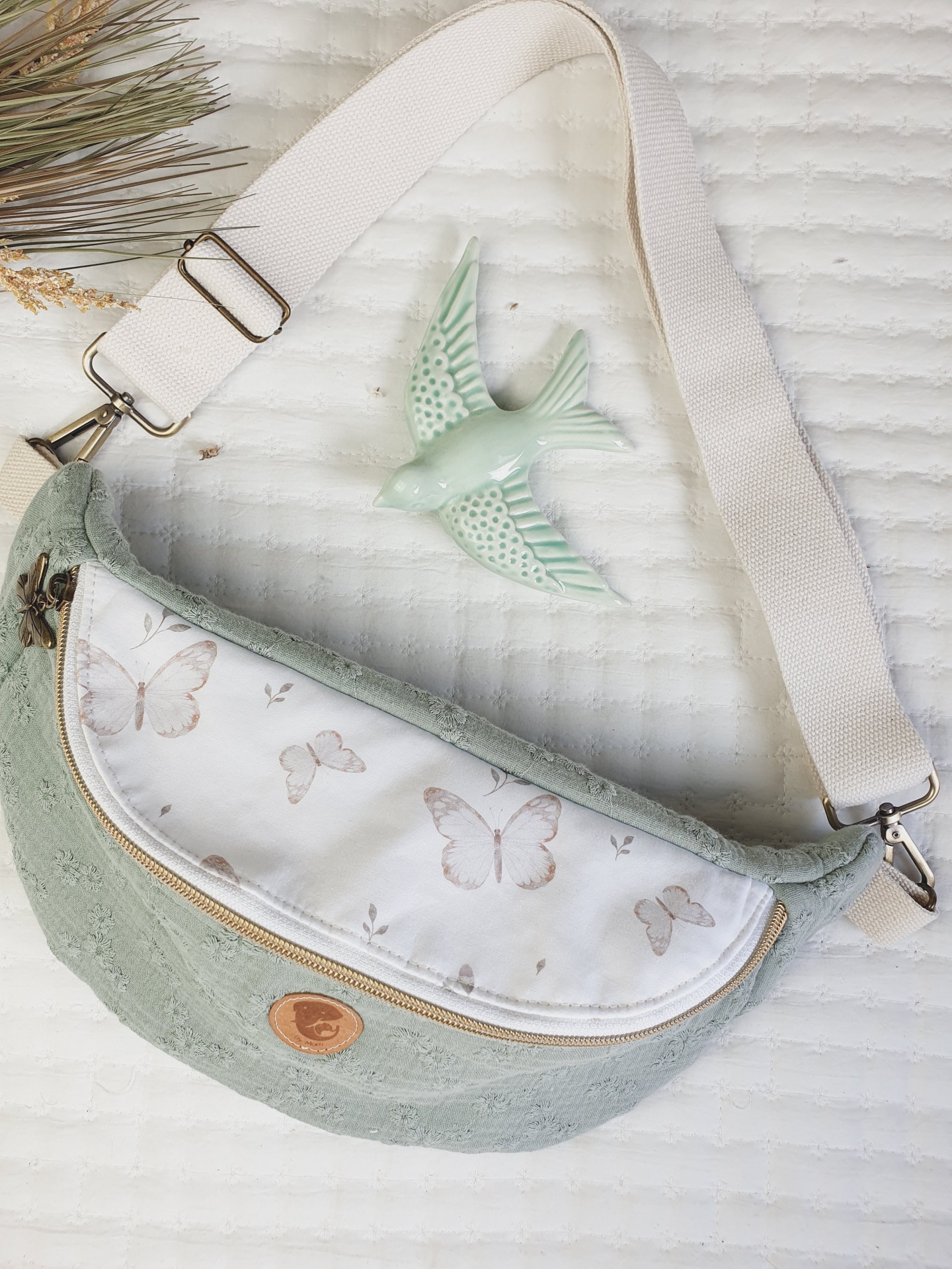 • Bolsa pochete verde clara com padrão de borboletas e alça branca ajustável