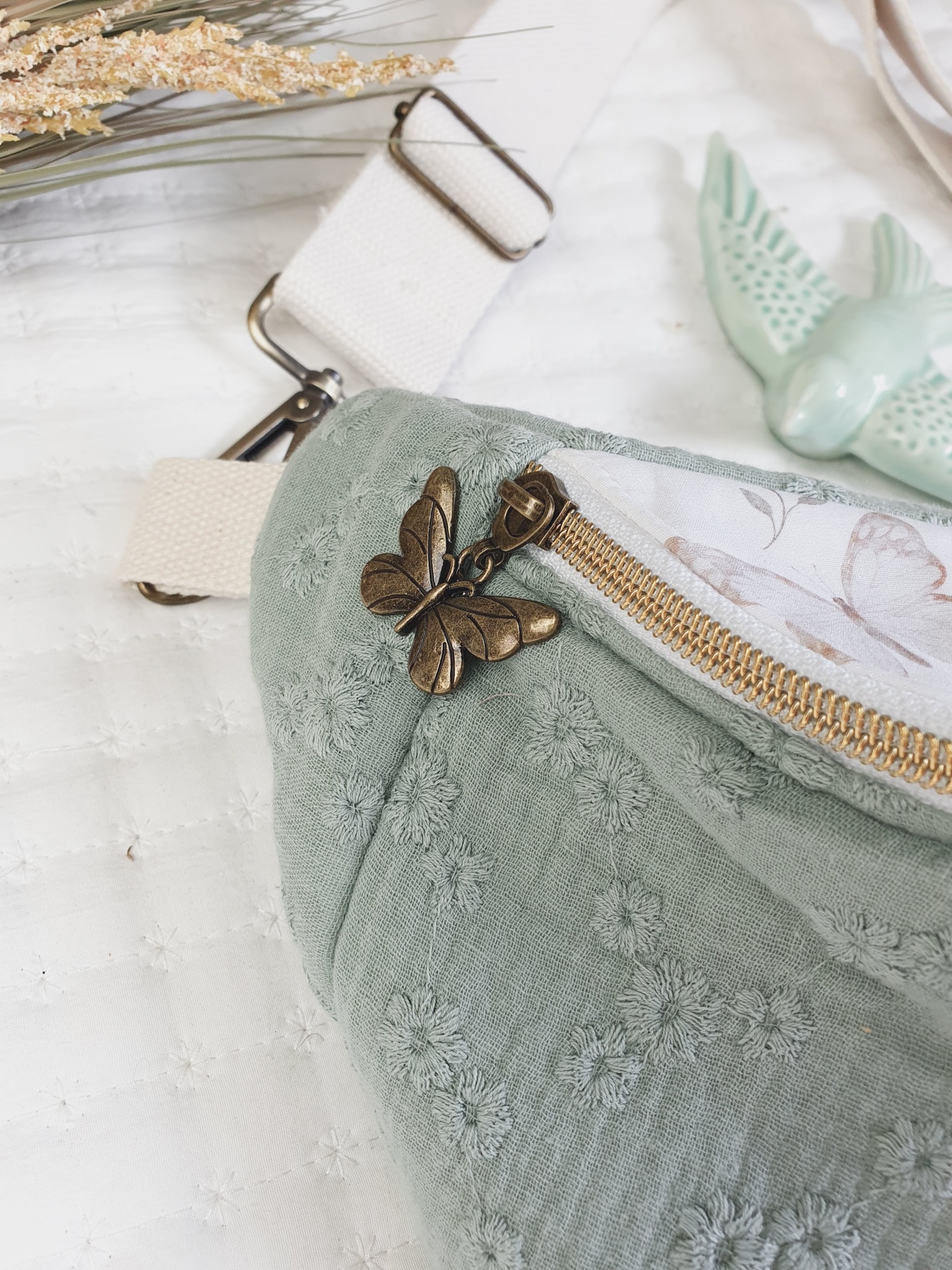 Bolsa cintura bordado inglês verde seco