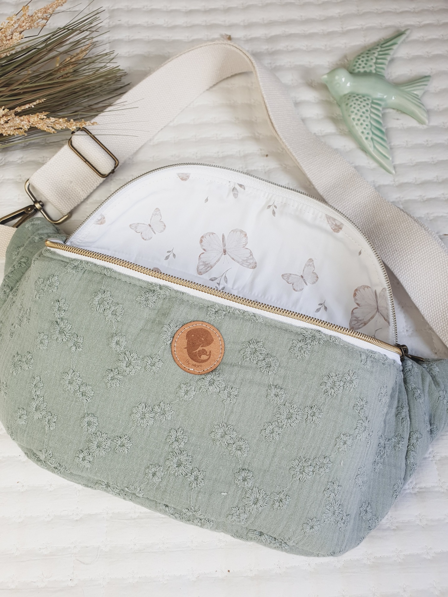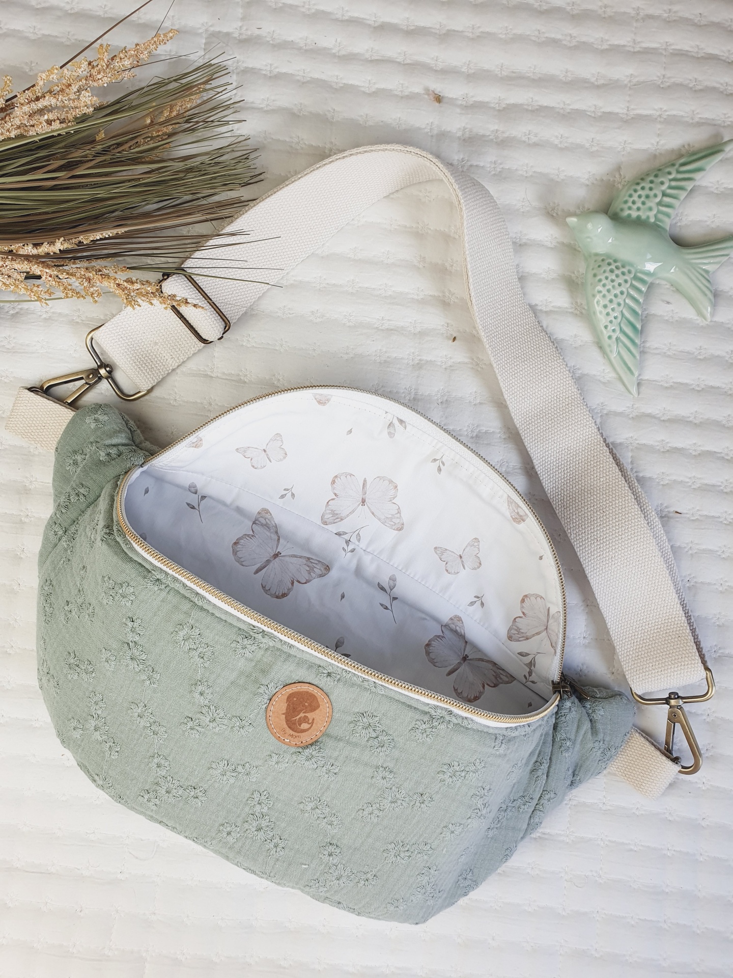 • Bolsa verde com padrão de borboletas e alça branca ajustável sobre superfície branca