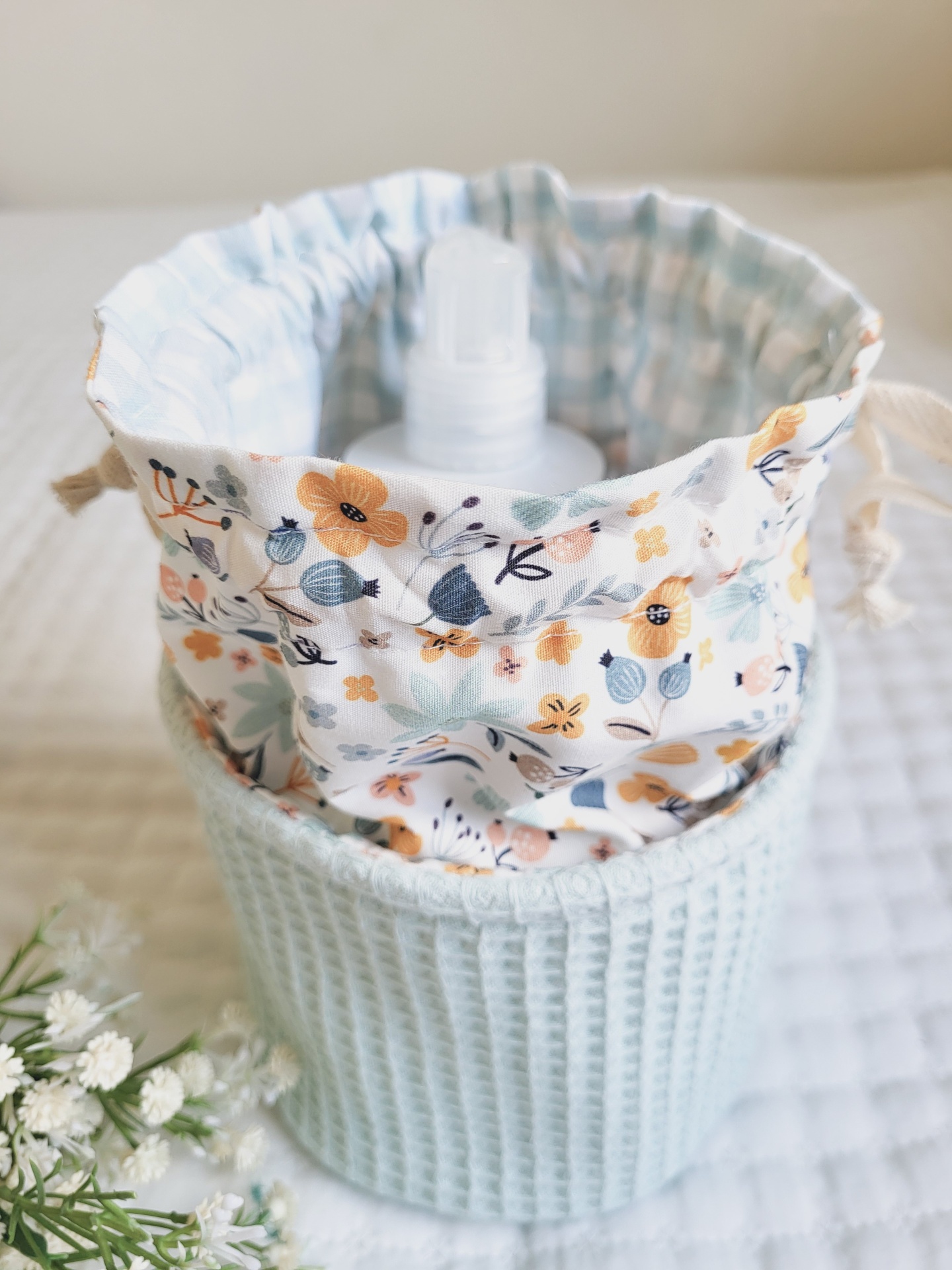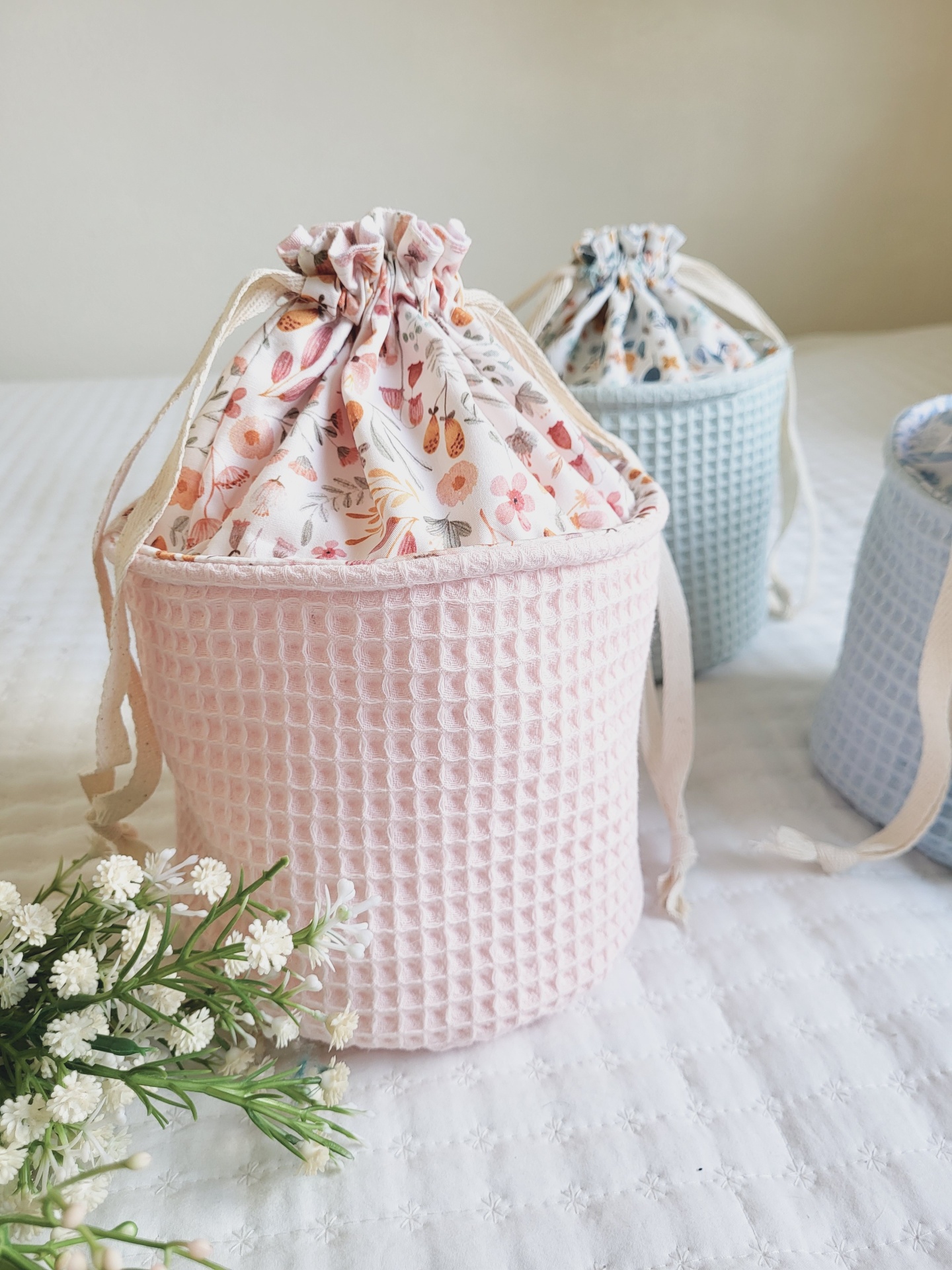 • Três sacos organizadores de tecido com padrão waffle, em rosa e azul, com estampados florais no fecho e cordão, sobre colchão branco com flores artificiais.