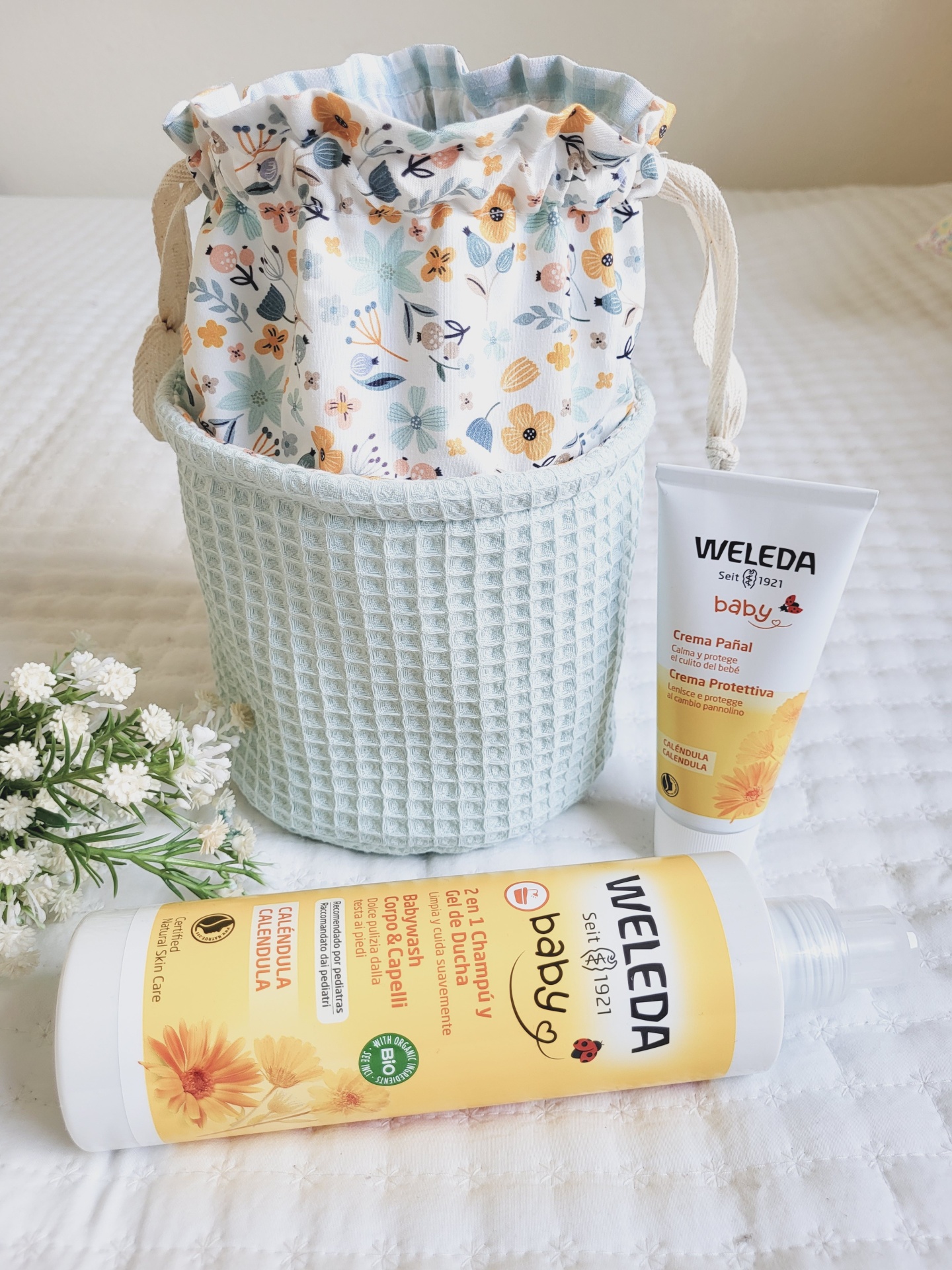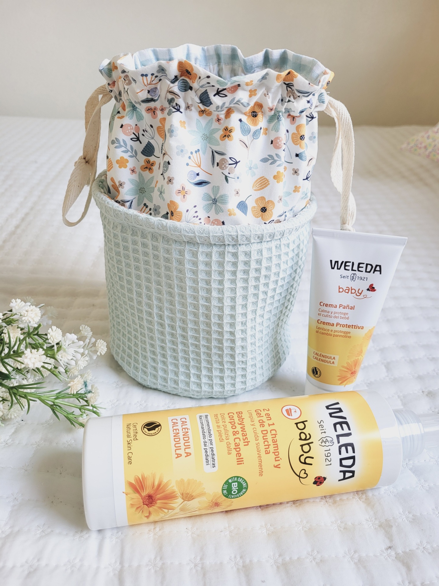 • Produtos para bebé Weleda com embalagem amarela e branca ao lado de cesto têxtil cinza claro com saco floral colorido