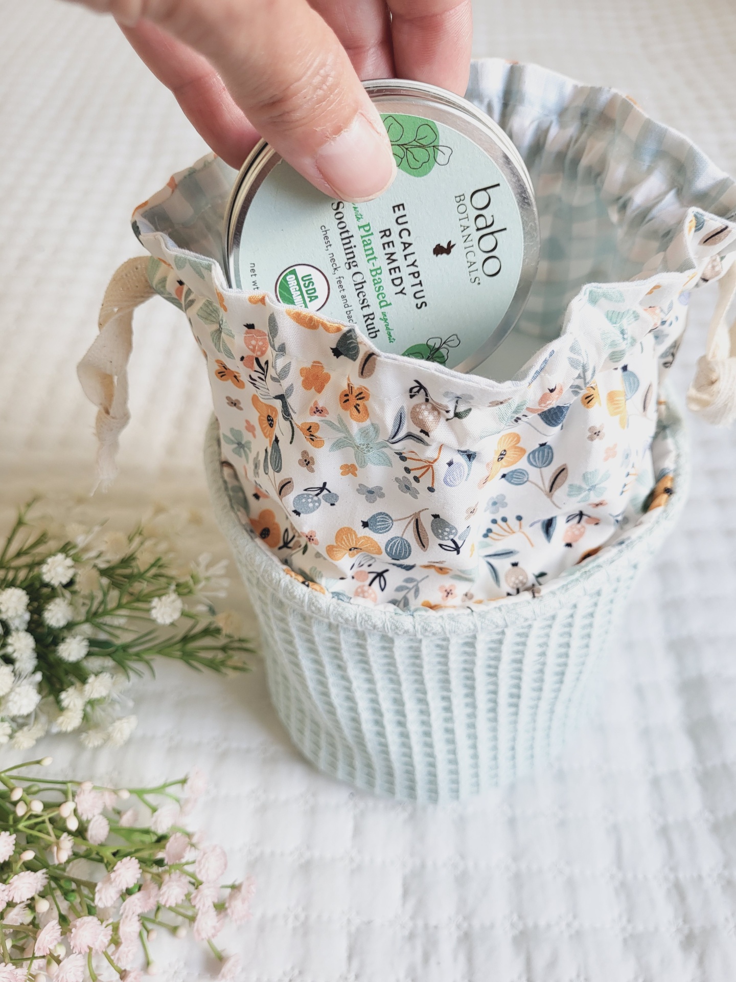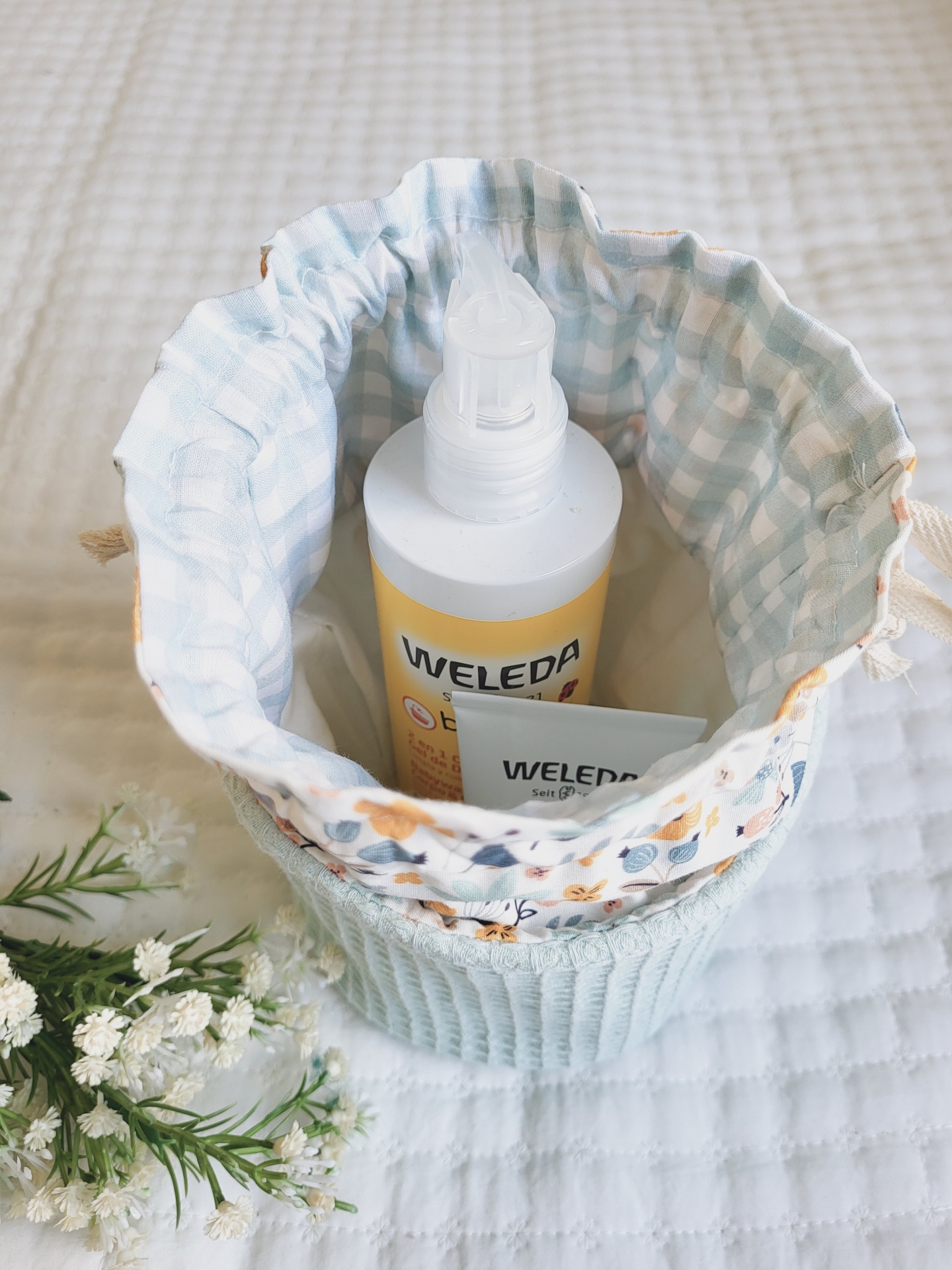 • Pote tecido azul claro com padrão floral e interior xadrez azul e branco contendo produtos WELEDA