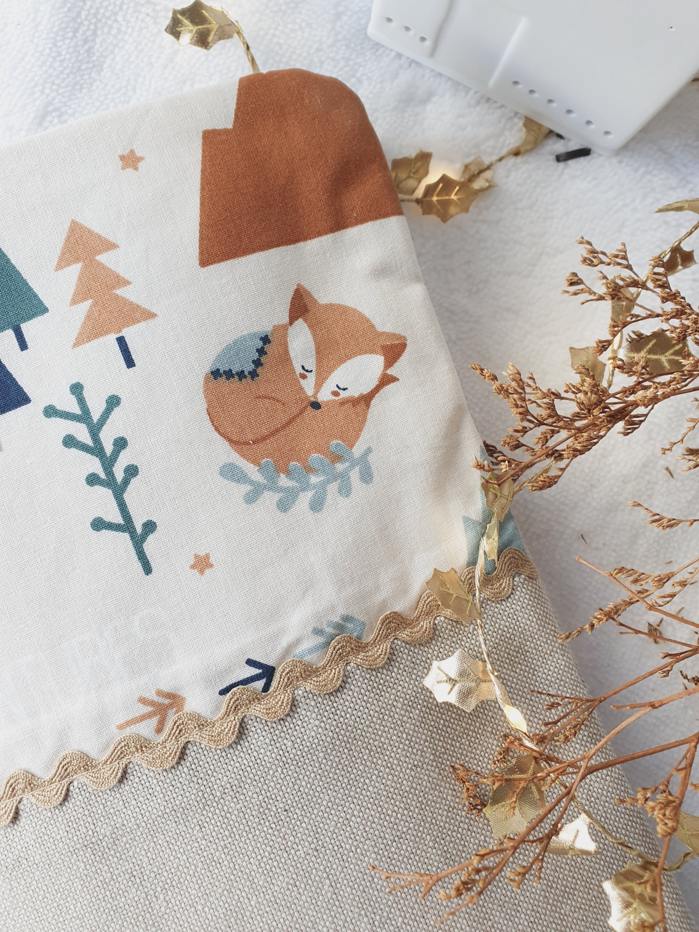 • Pano de cozinha com estampa de raposa e árvores junto a decoração seca dourada