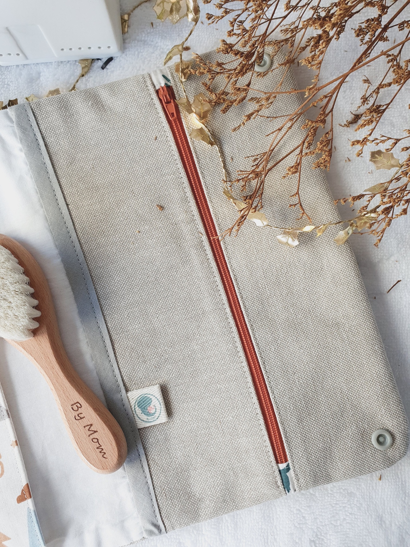 • Estojo cinzento claro com fecho laranja e escova de madeira junto a flores secas