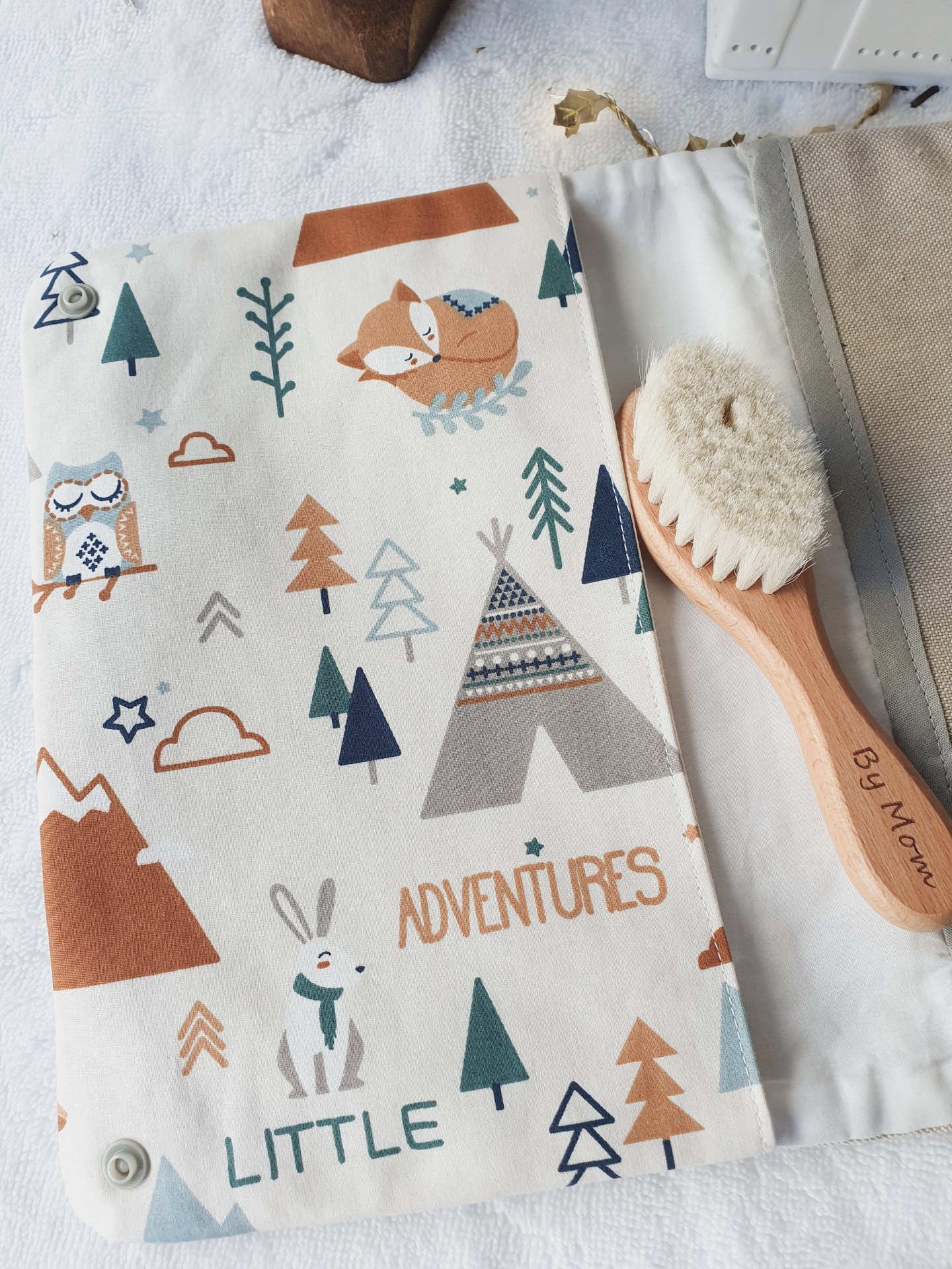• Toalha infantil estampada com animais e texto, escova de madeira ao lado