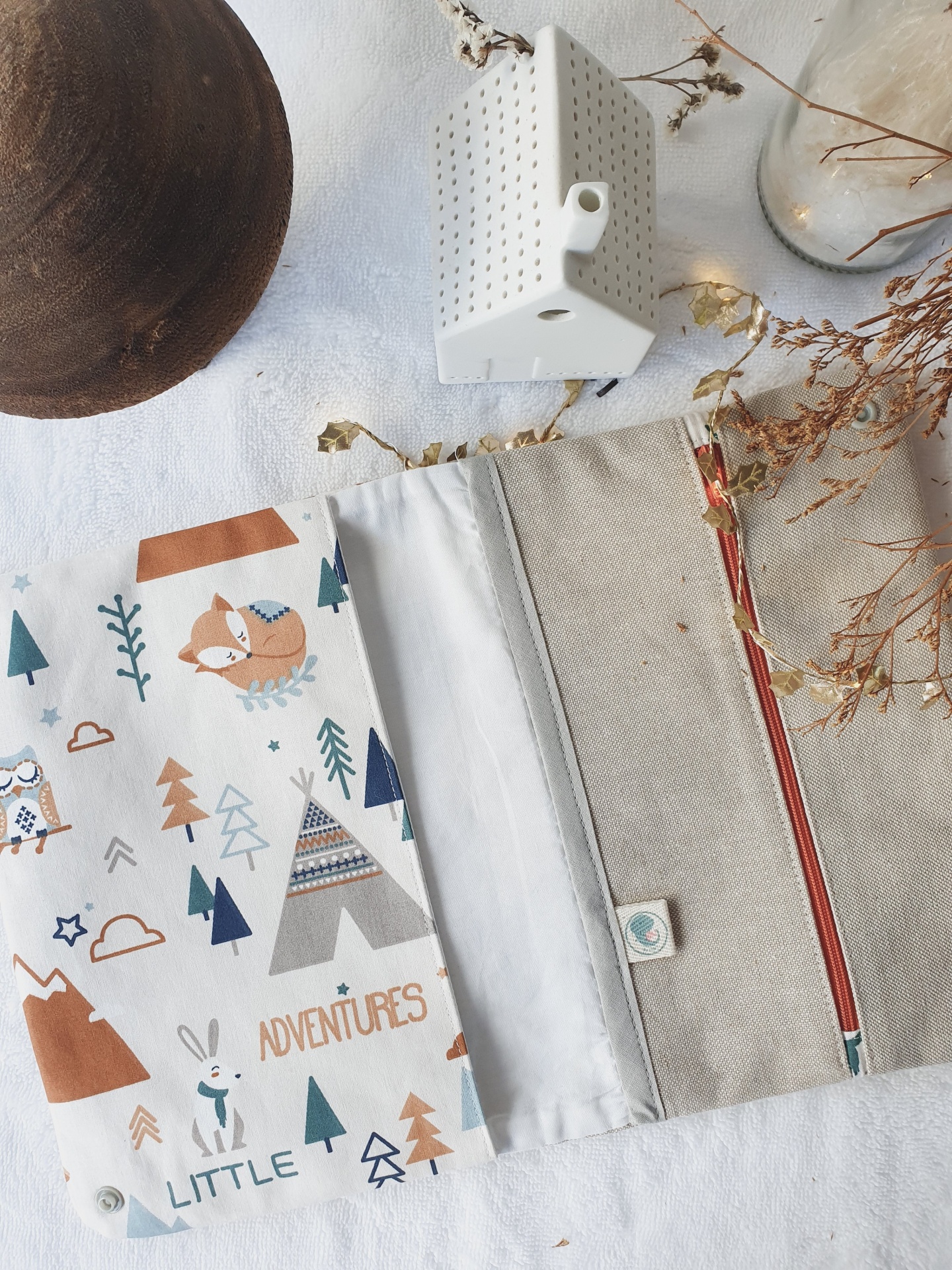 • Bolsa ou estojo infantil aberto com estampado de animais e árvores, com fecho vermelho, em ambiente decorativo com casa branca, prato de madeira e flores secas