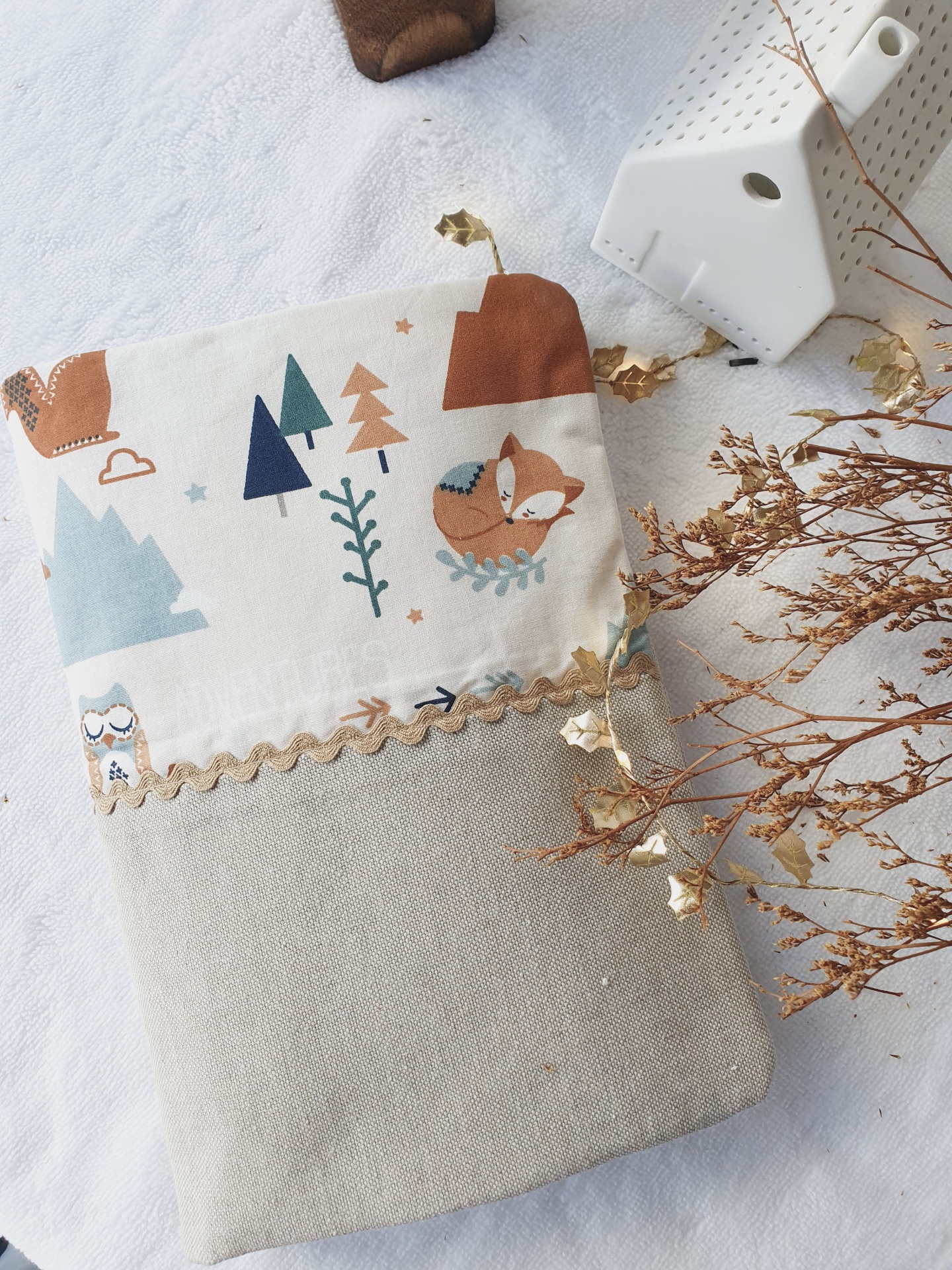 • Estojo de tecido com padrão de animais e árvores, e acabamento em renda