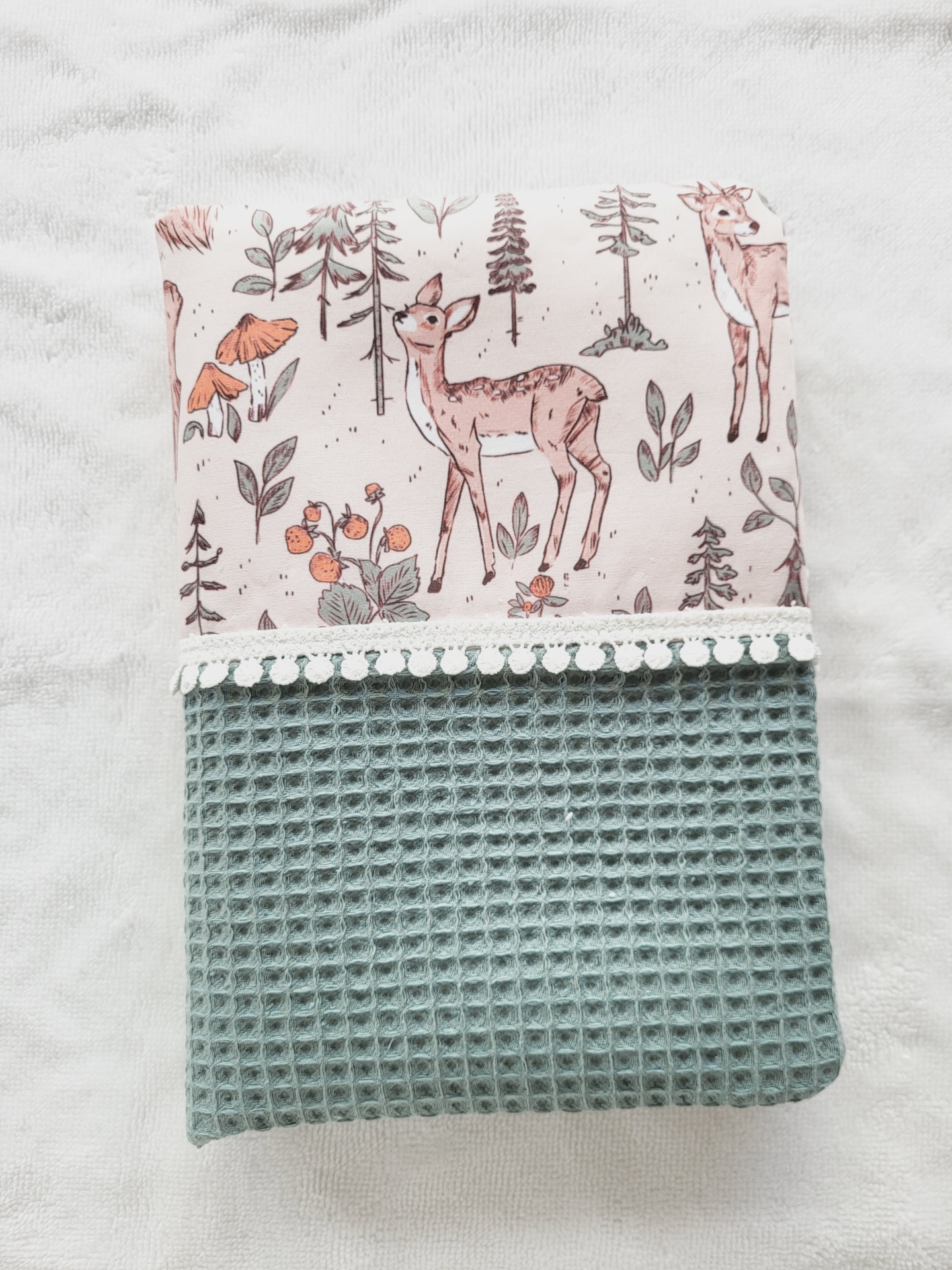 • Toalha de cozinha com estampado de veados e fundo verde texturizado com renda branca
