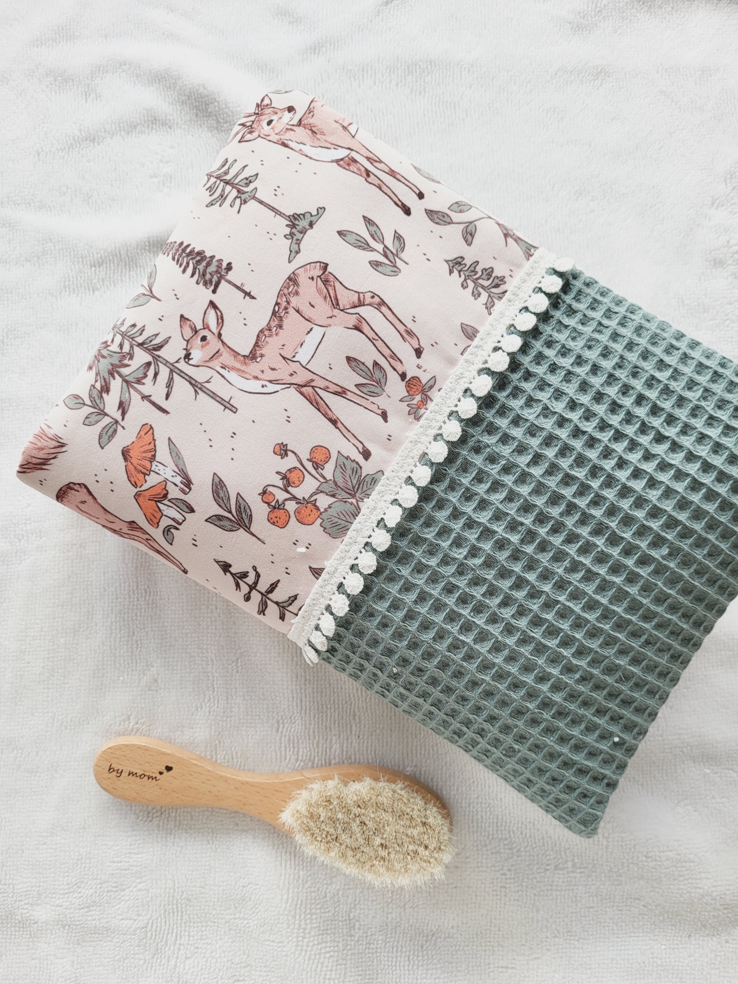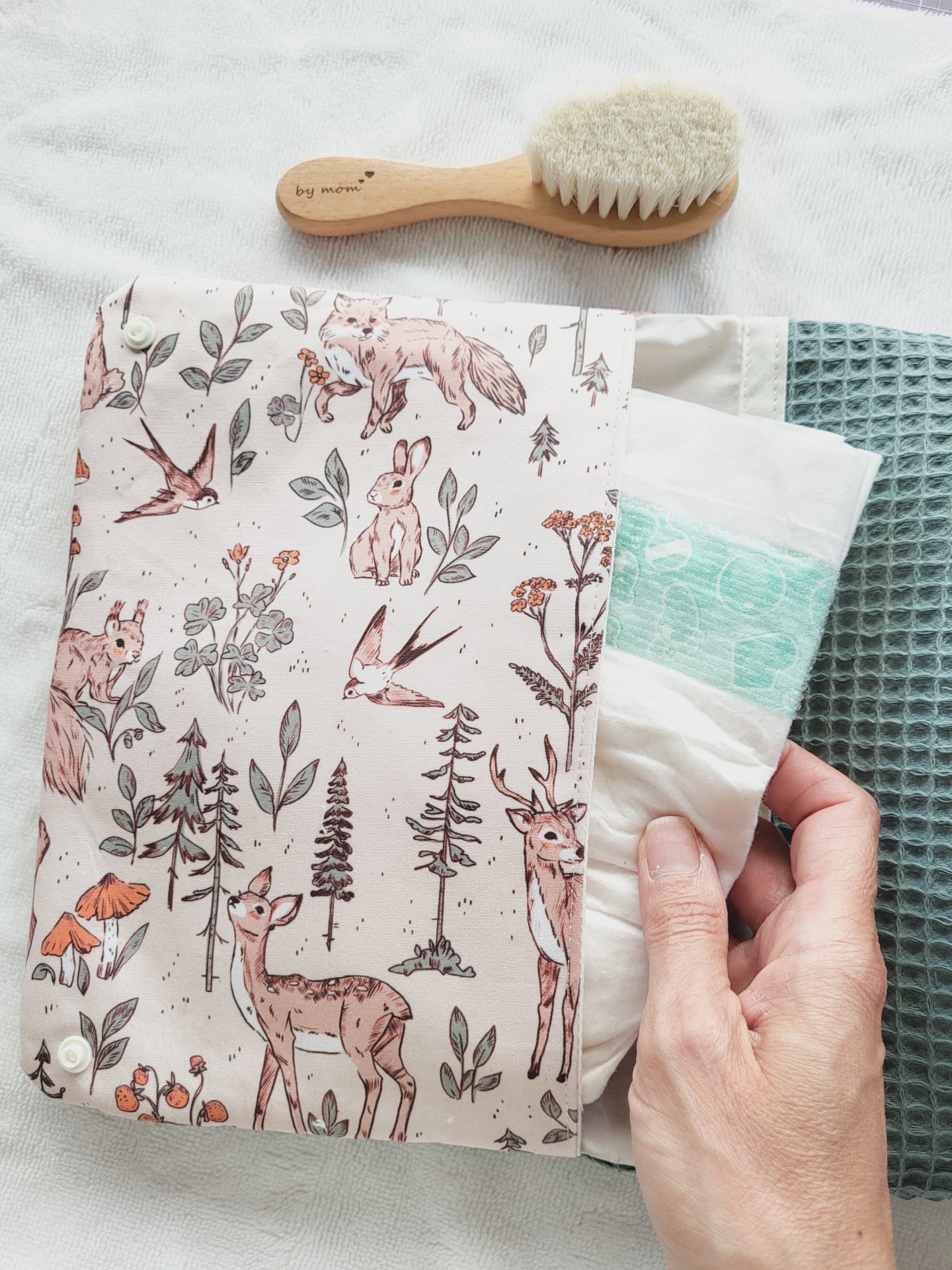 • Estojo estampado com animais da floresta a segurar uma fralda, com escova de cabelo ao fundo