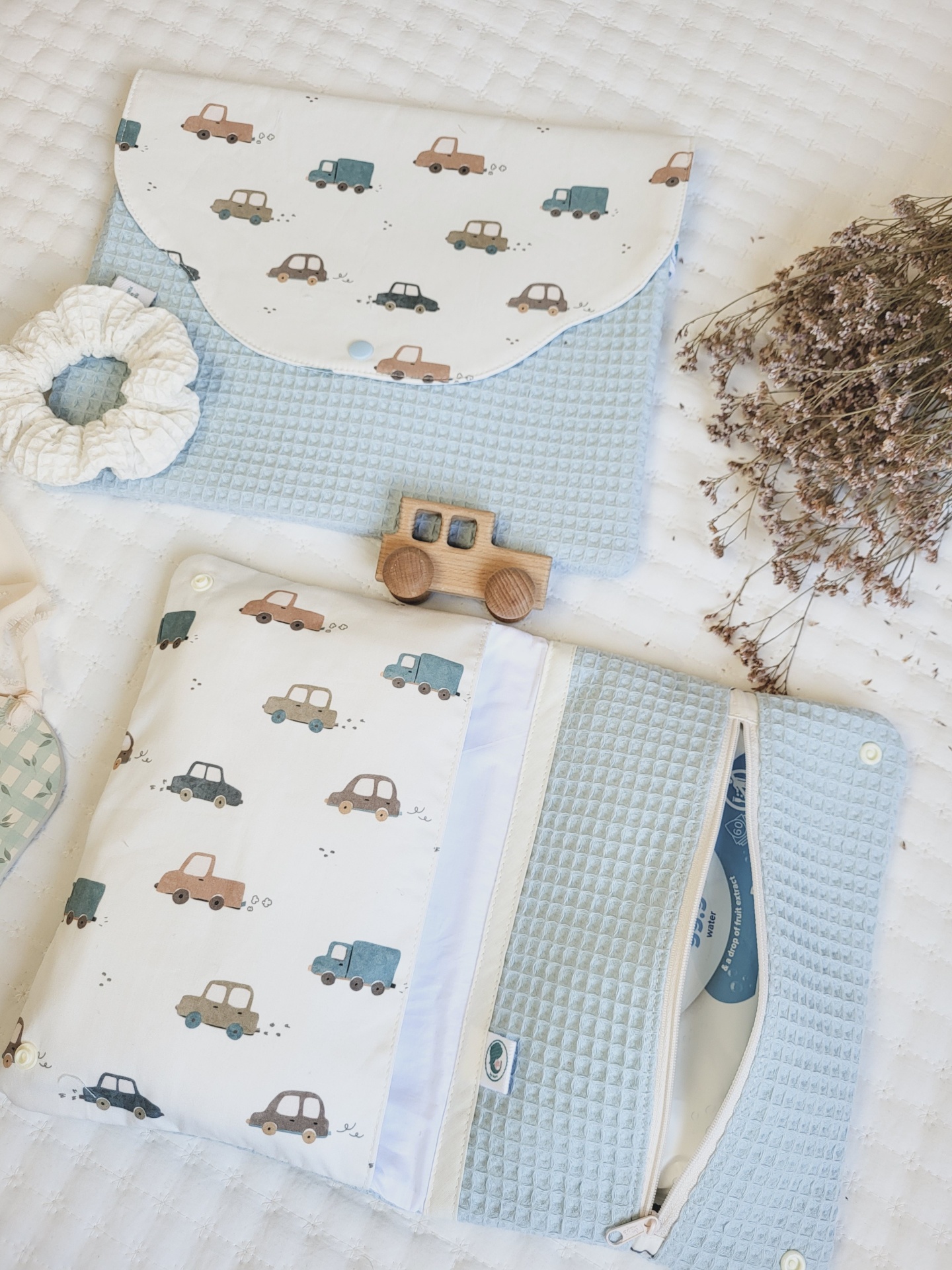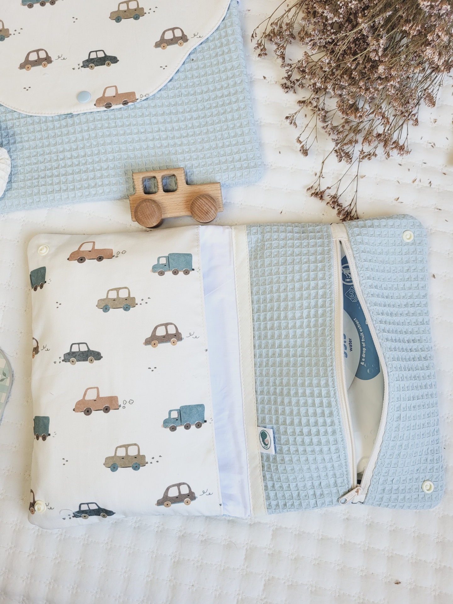 • Duas bolsas azuis texturizadas com padrão de carros e um elástico branco em manta branca acolchoada com flores secas