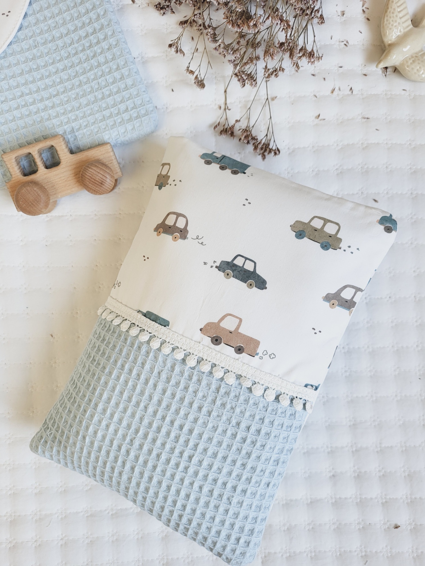 Travesseiro com estampa de carros e tecido azul em padrão colmeia sobre roupa de cama branca com textura, com brinquedo de madeira e flores secas ao lado.