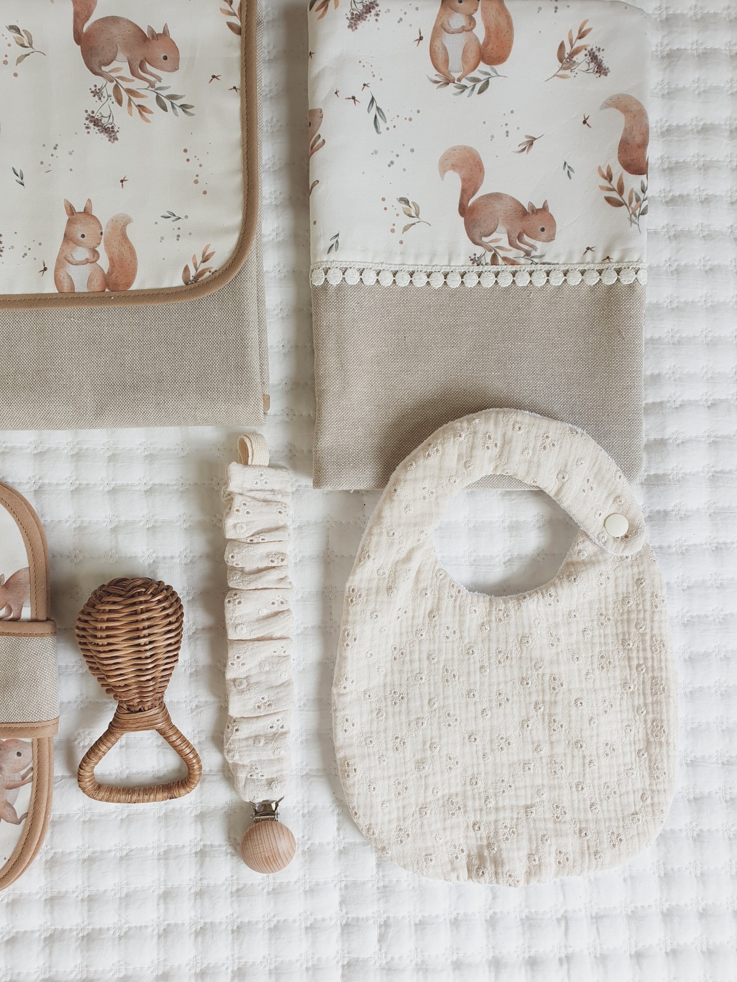• Toalhas de bebé com padrão de esquilos, babete creme e chocalho em rattan