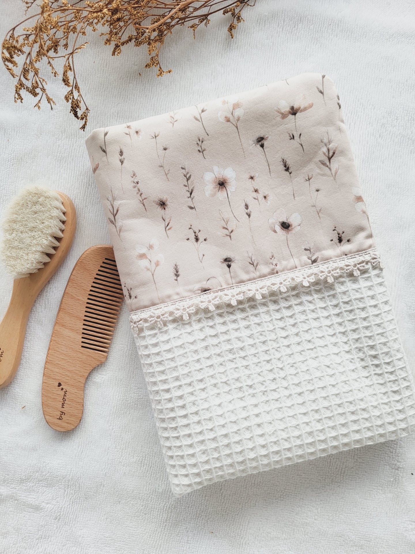 • Toalha de banho com padrão floral e tecido waffle com escova e pente de madeira