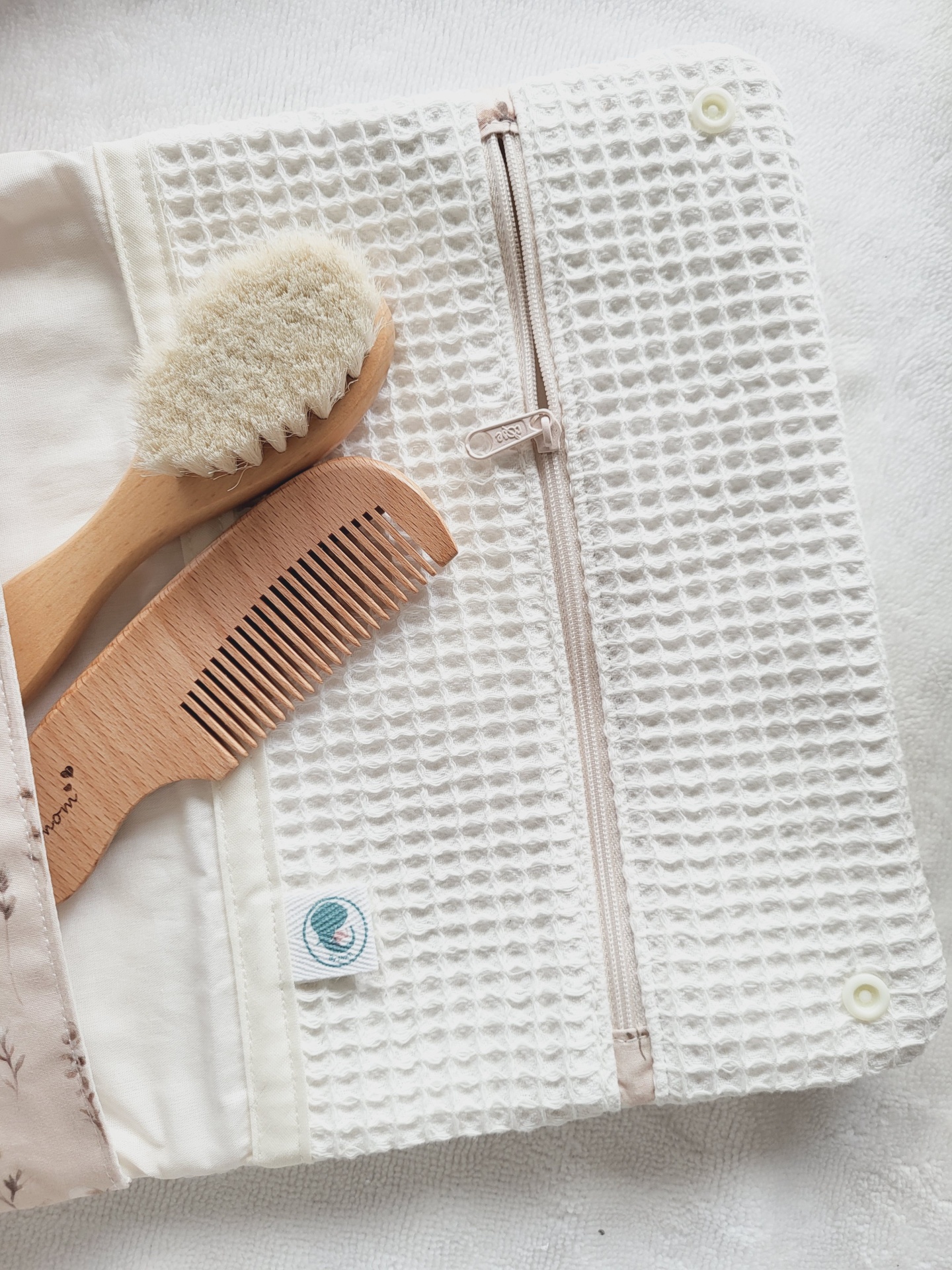 • Estojo branco texturizado com pincel e pente de madeira