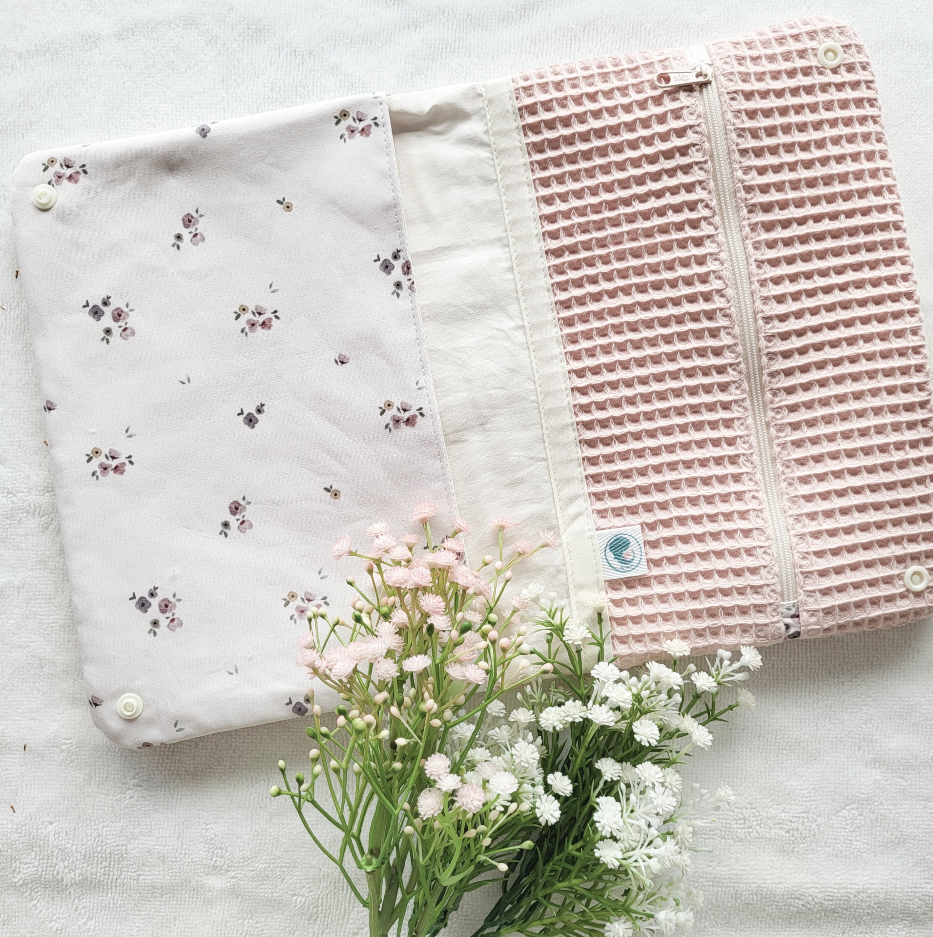 Com dois bolsos laterais. Um dos bolsos com fecho zipper e impermeável para não deixar secar as toalhitas, nem molhar a bolsa.