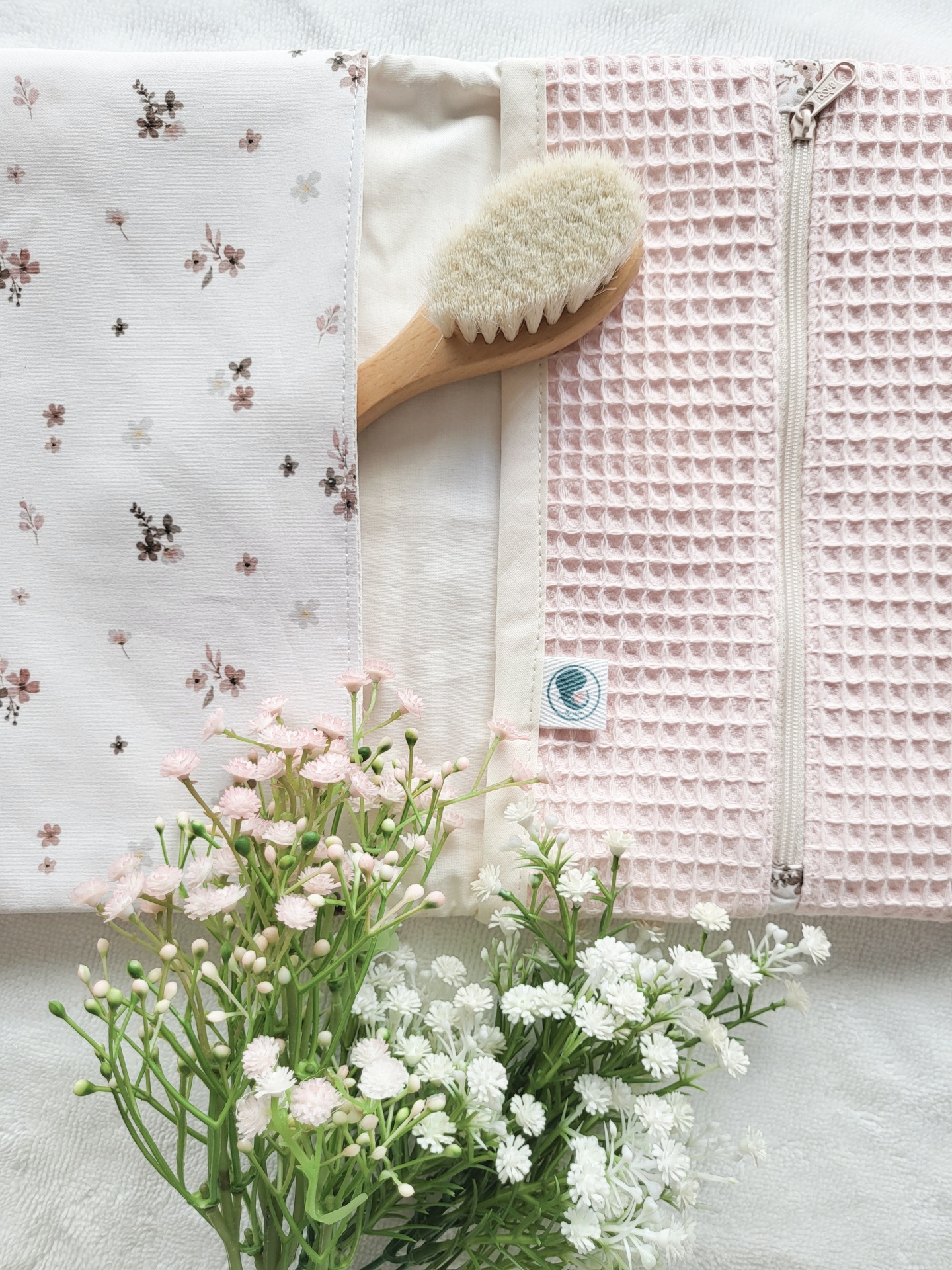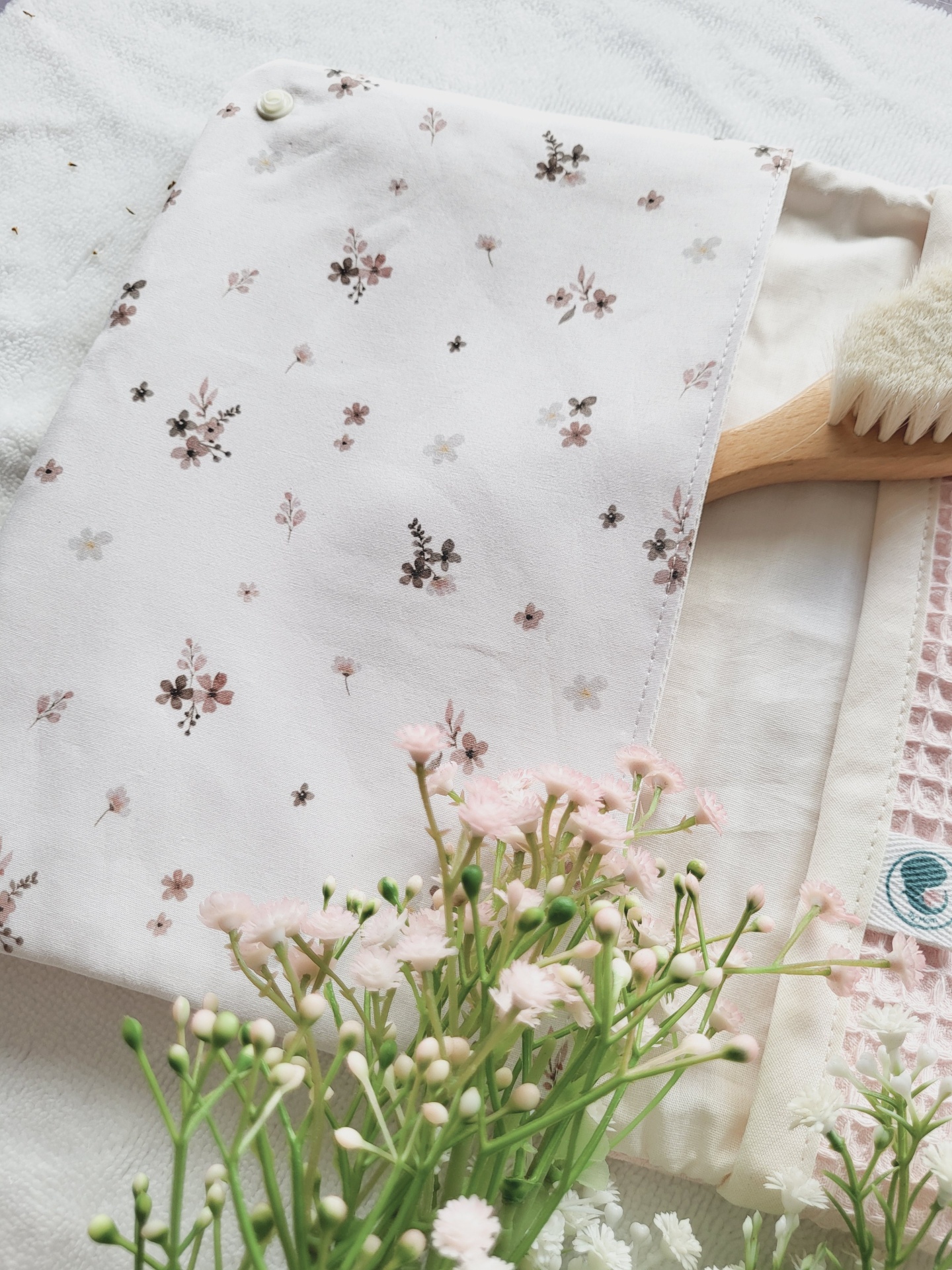 • Três panos claros com padrão waffle, flores e liso, escova de cerdas naturais e flores brancas e cor-de-rosa