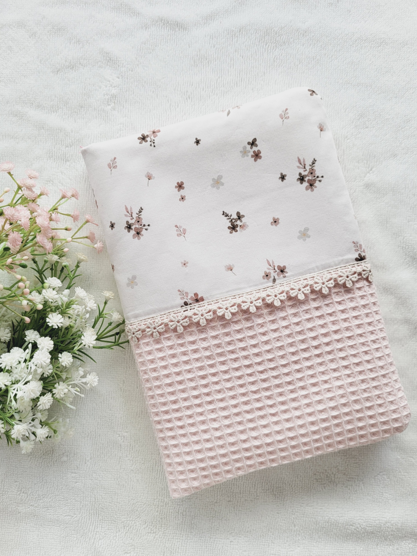 • Toalha branca com padrão floral e textura rosa claro com renda sobre superfície cinza claro e flores ao lado