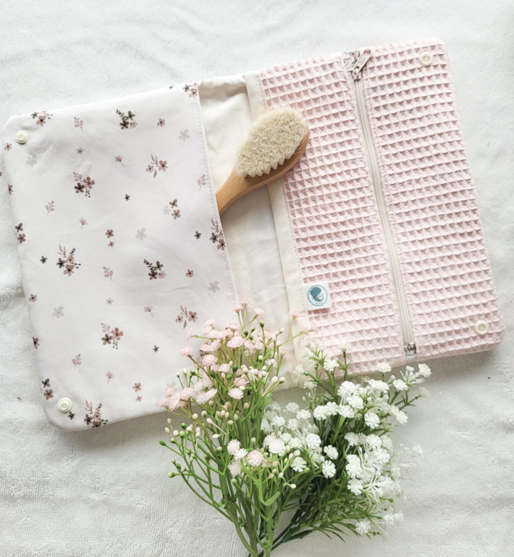 • Estojo aberto de tecido com padrão floral rosa, malha rosa e pincel de cerdas naturais sobre superfície branca com flores.