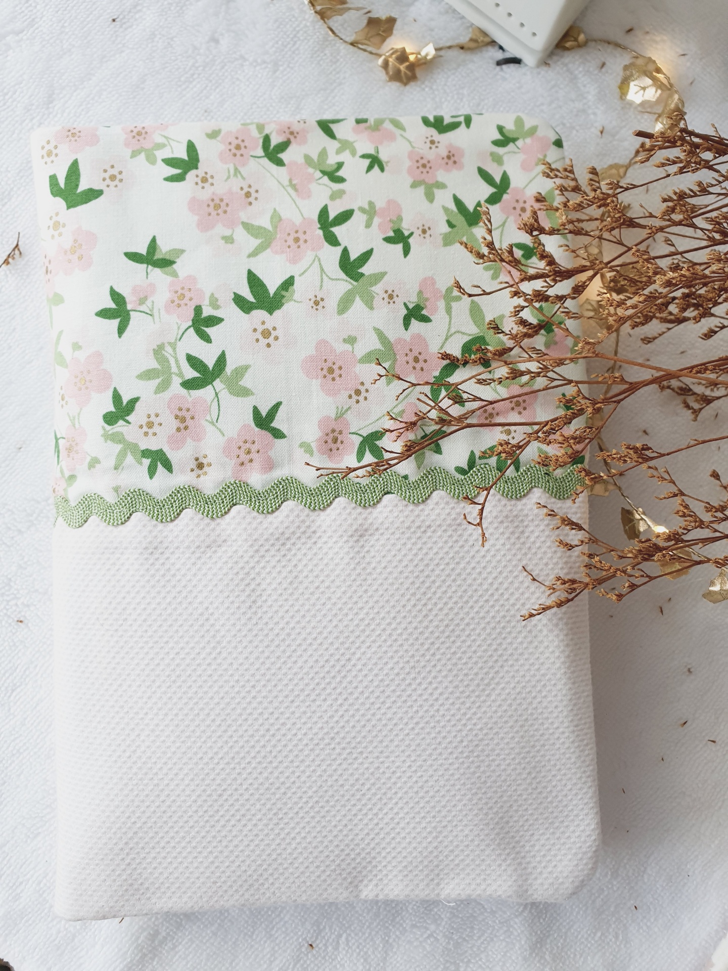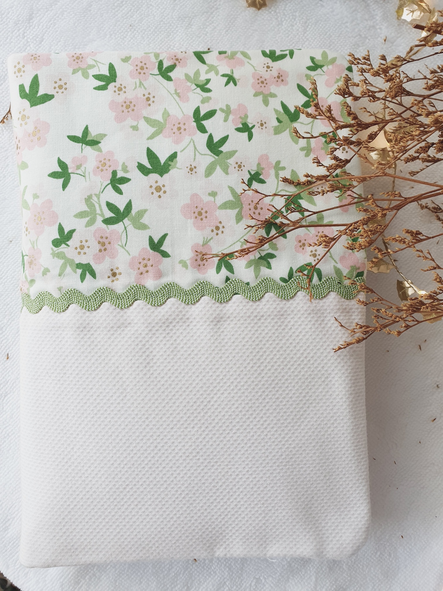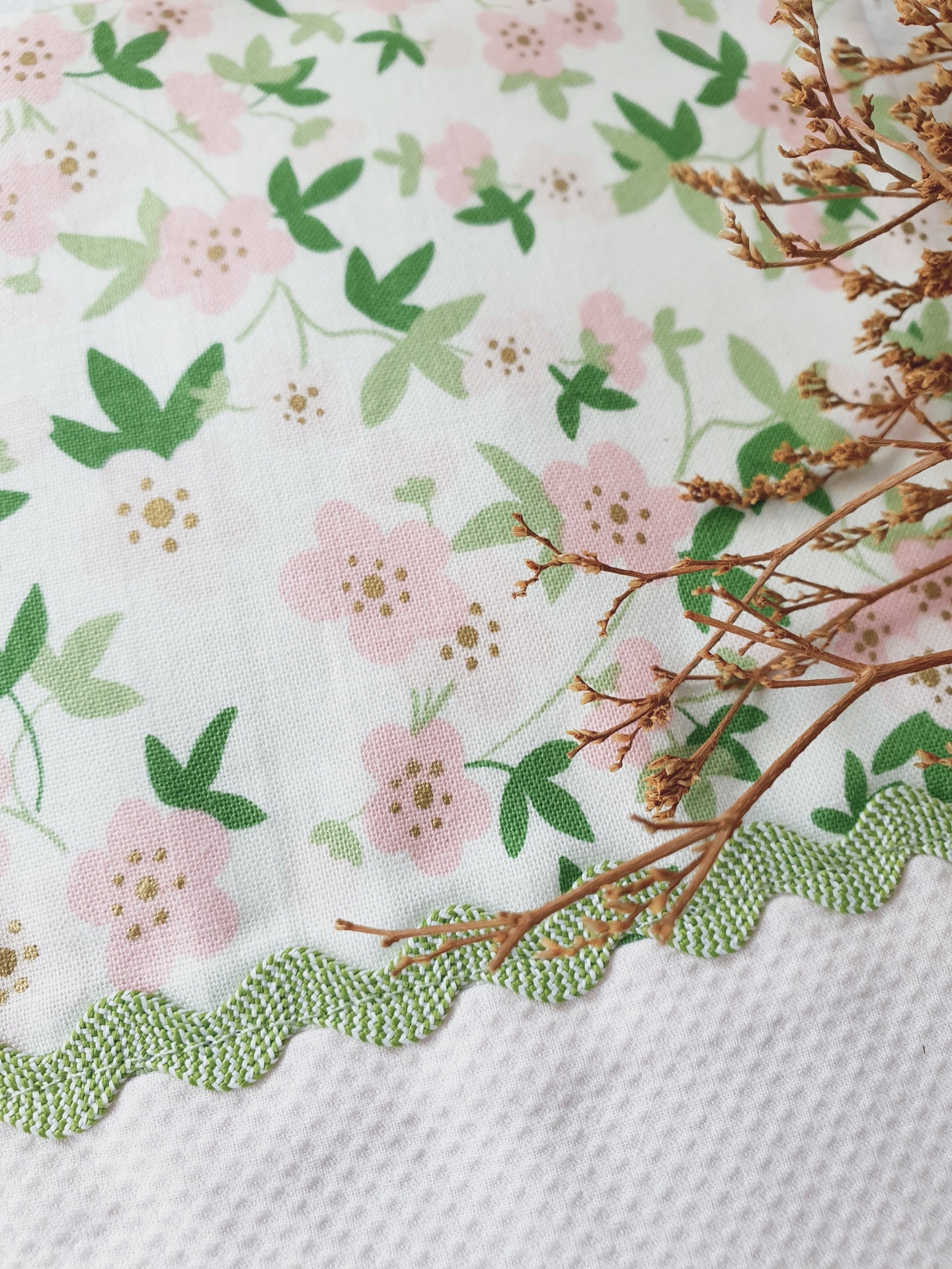 • Toalha branca com padrão floral rosa e verde e fita verde ondulada