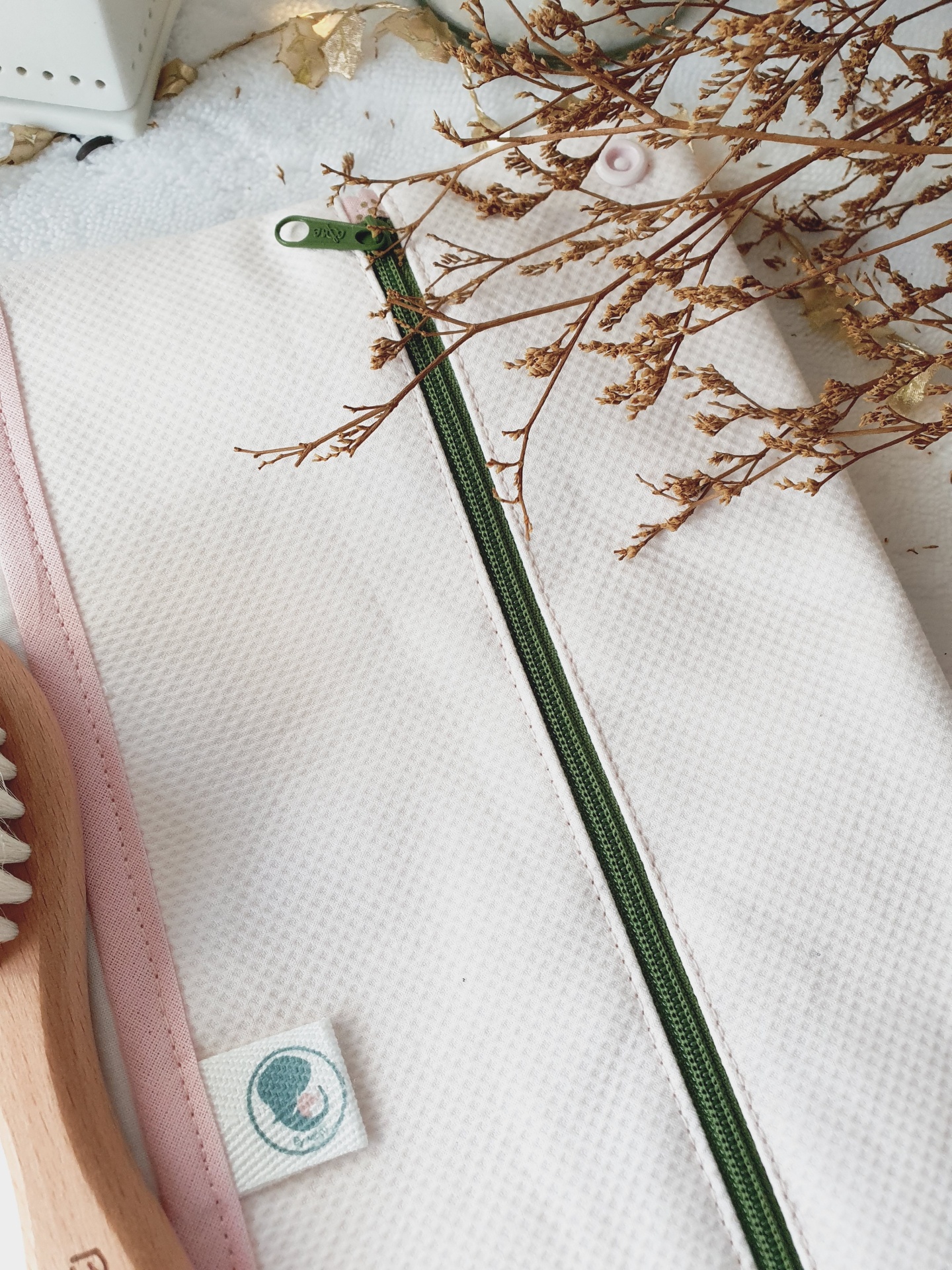 Com dois bolsos laterais. Um dos bolsos com fecho zipper e impermeável para não deixar secar as toalhitas, nem molhar a bolsa.