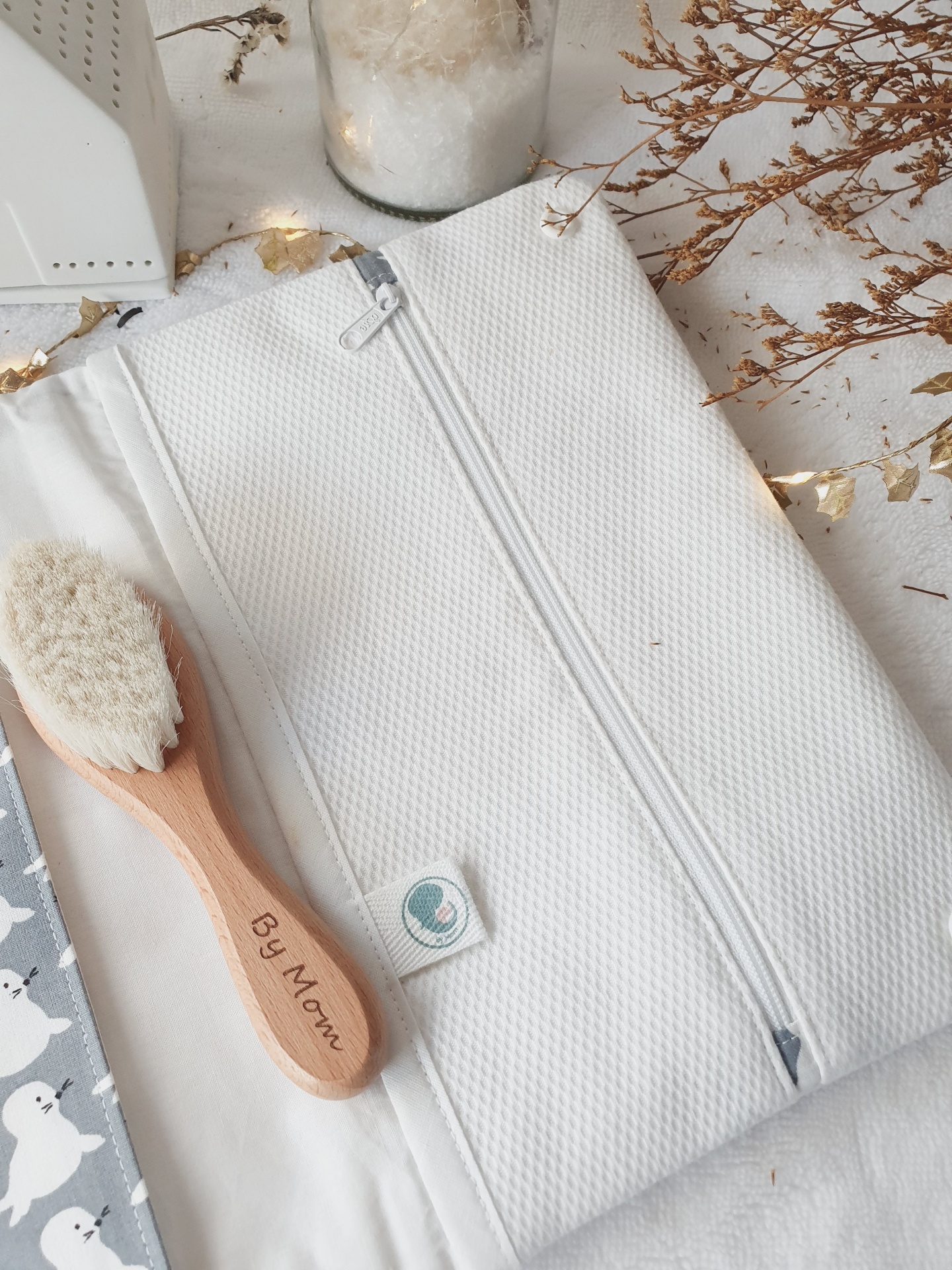 • Estojo branco texturizado com fecho zip e escova de madeira com cerdas brancas