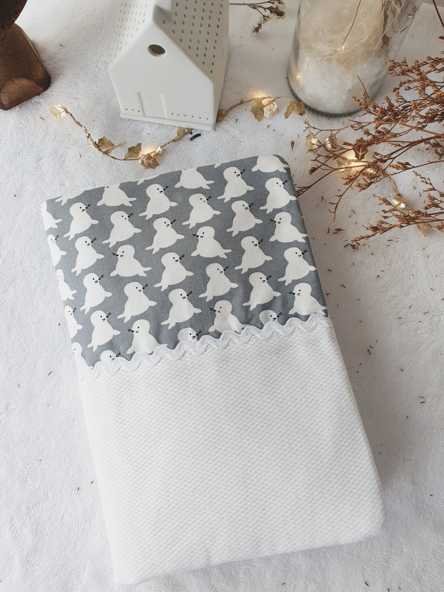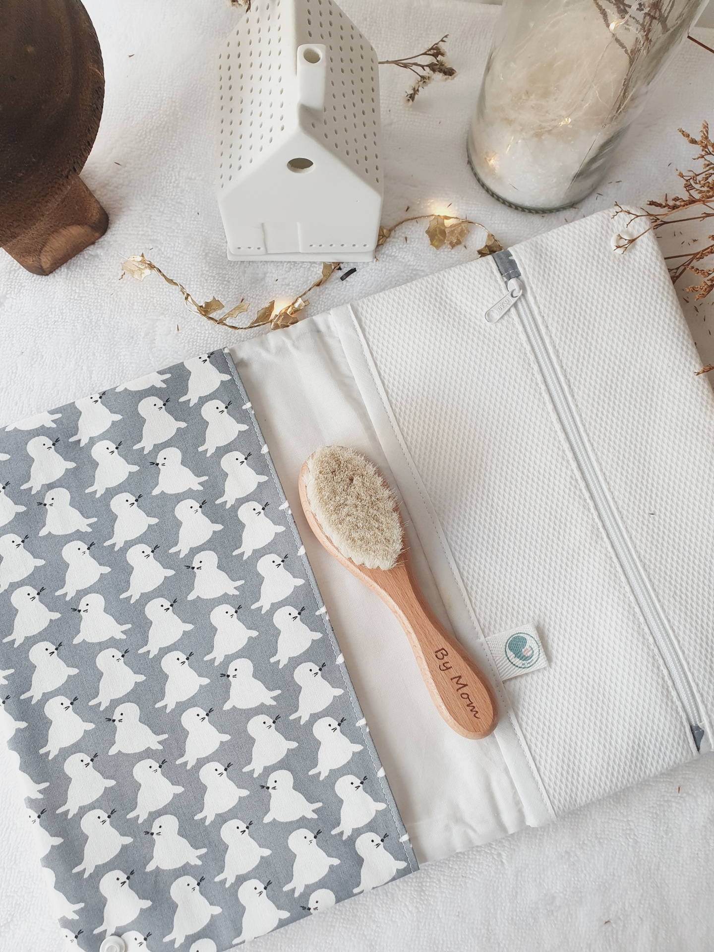 • Escova de madeira com cerdas brancas sobre toalha branca e tecido cinzento com pinguins, junto a casa cerâmica branca e frasco de vidro