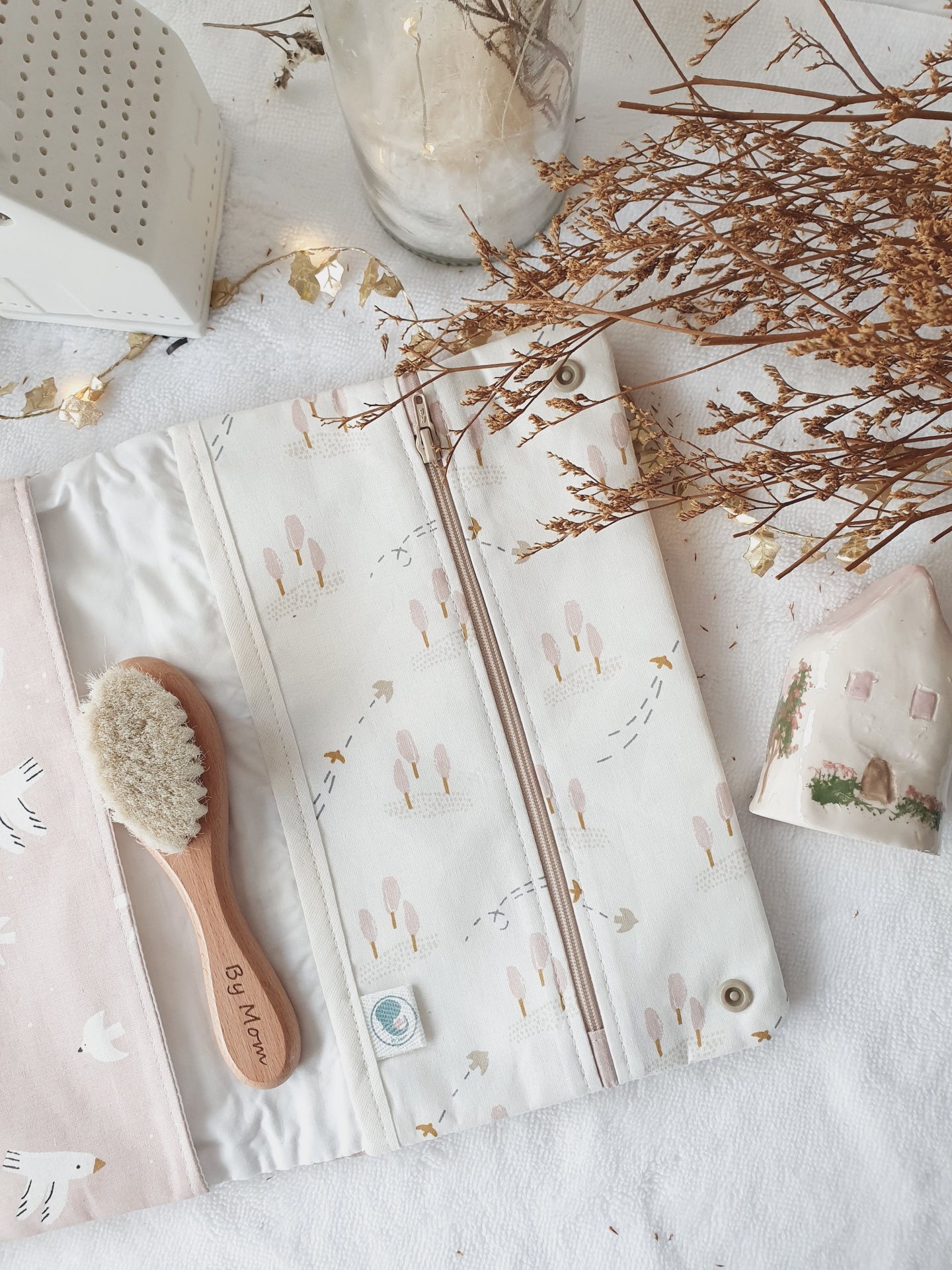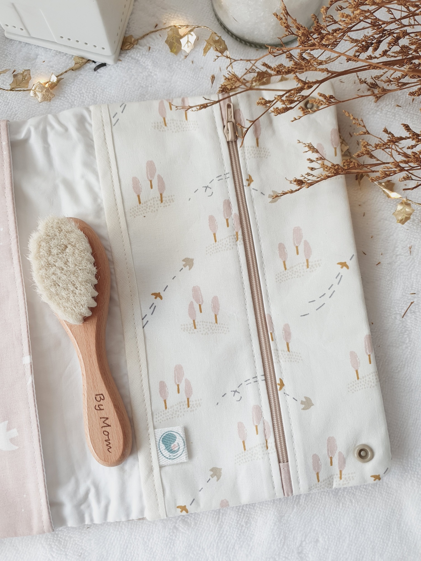 • Estojo de tecido com padrão de árvores e escova de madeira com cerdas brancas