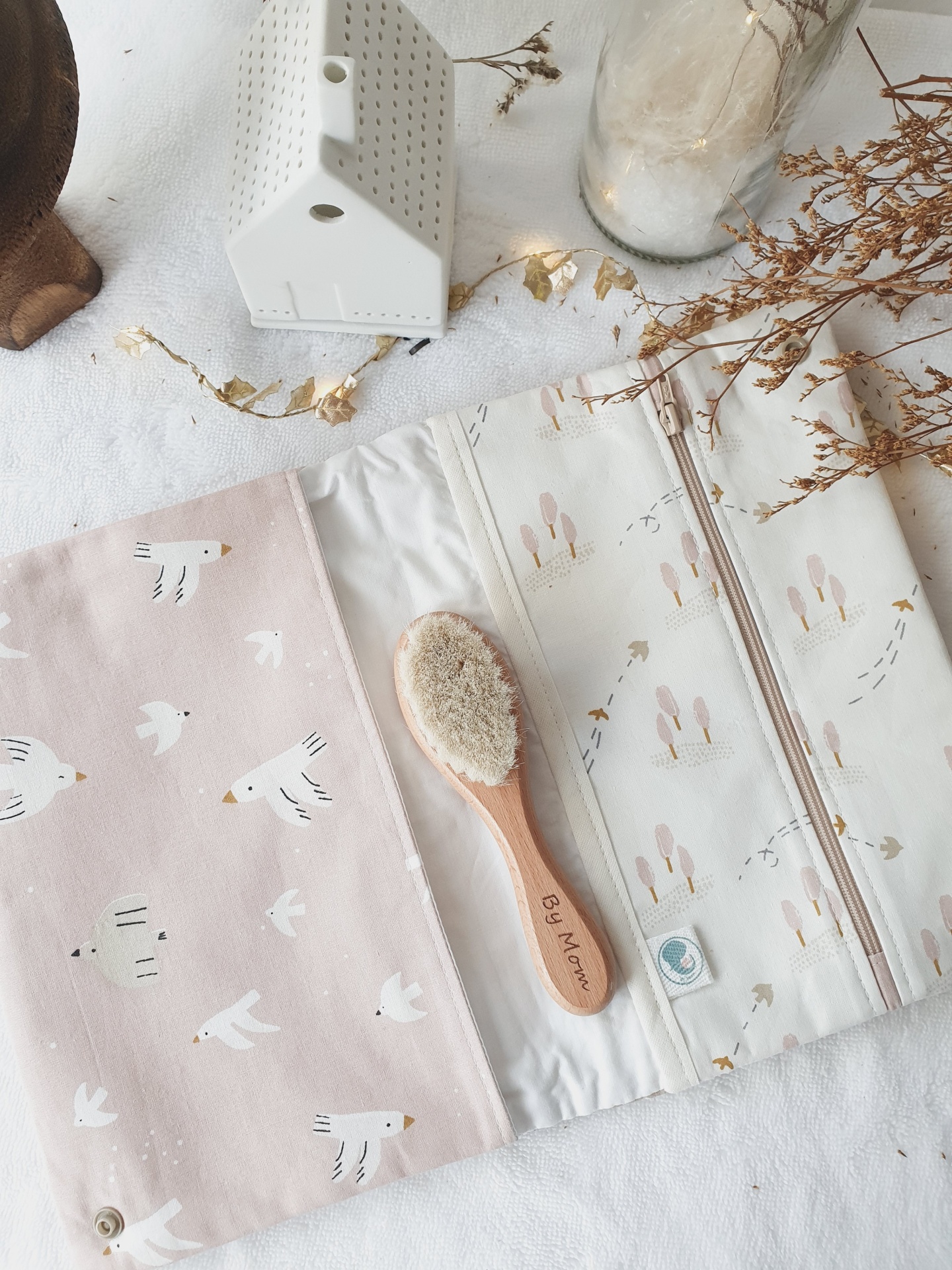 Capa de tecido bege e rosa com padrões de aves e pontos, decorada com fita ondulada bege, sobre superfície branca com elementos secos
