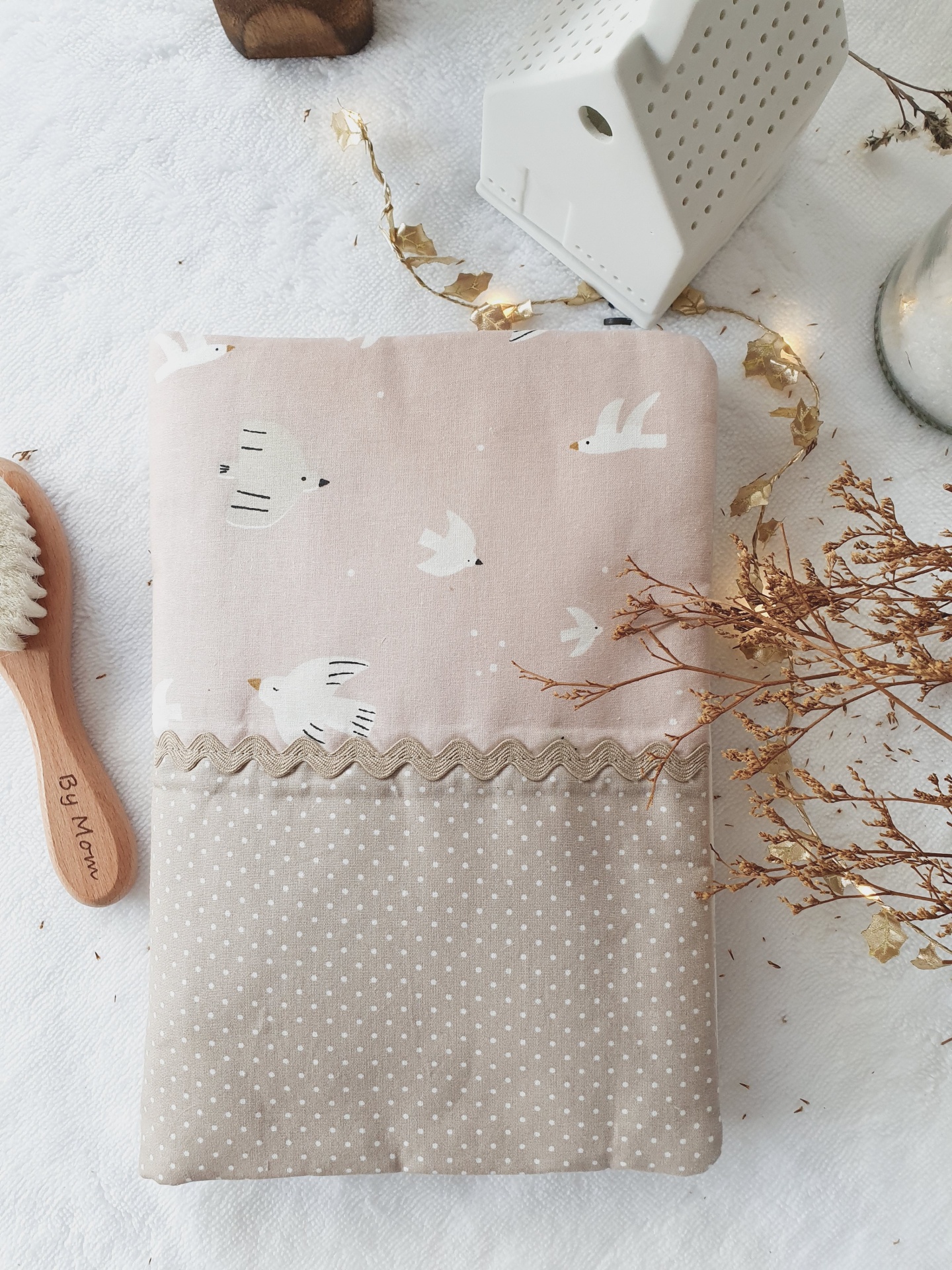 • Capa de tecido bege e rosa com padrões de aves e pontos, decorada com fita ondulada bege, sobre superfície branca com elementos secos