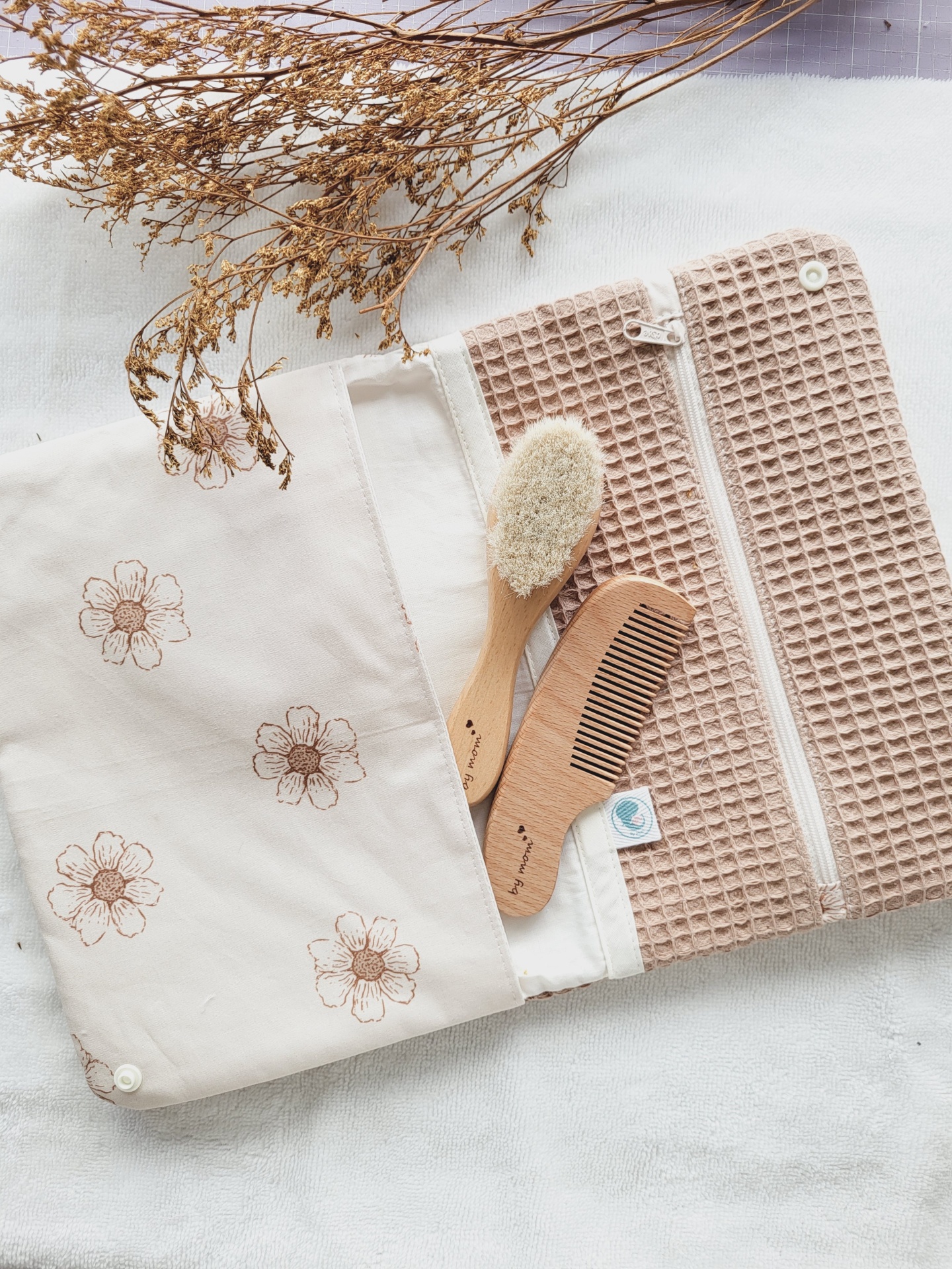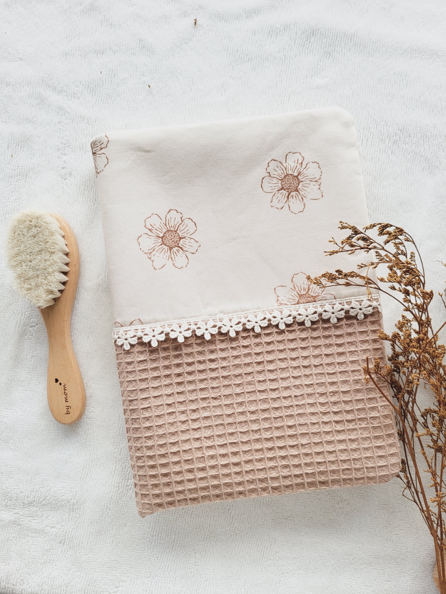 Toalha com flores castanhas e padrão waffle, escova de madeira, raminho seco