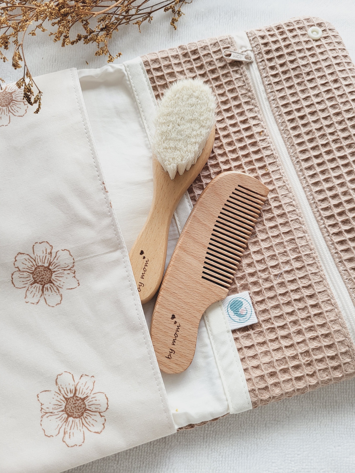 • Kit de cuidados para bebé com escova, pente e estojo em tecido bege