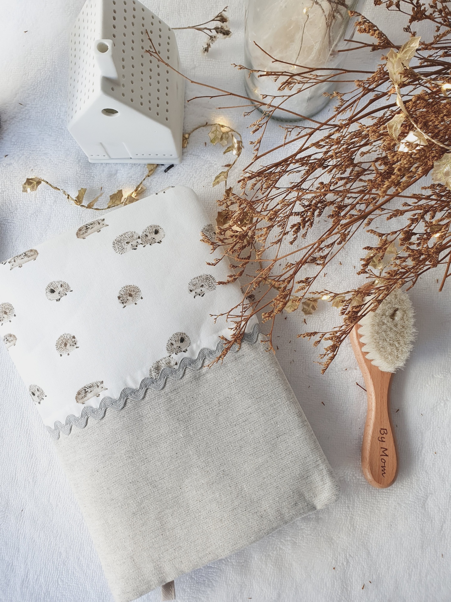 • Manta bege com padrão de ovelhas e escova de cabelo em madeira junto a casa decorativa branca e plantas secas.