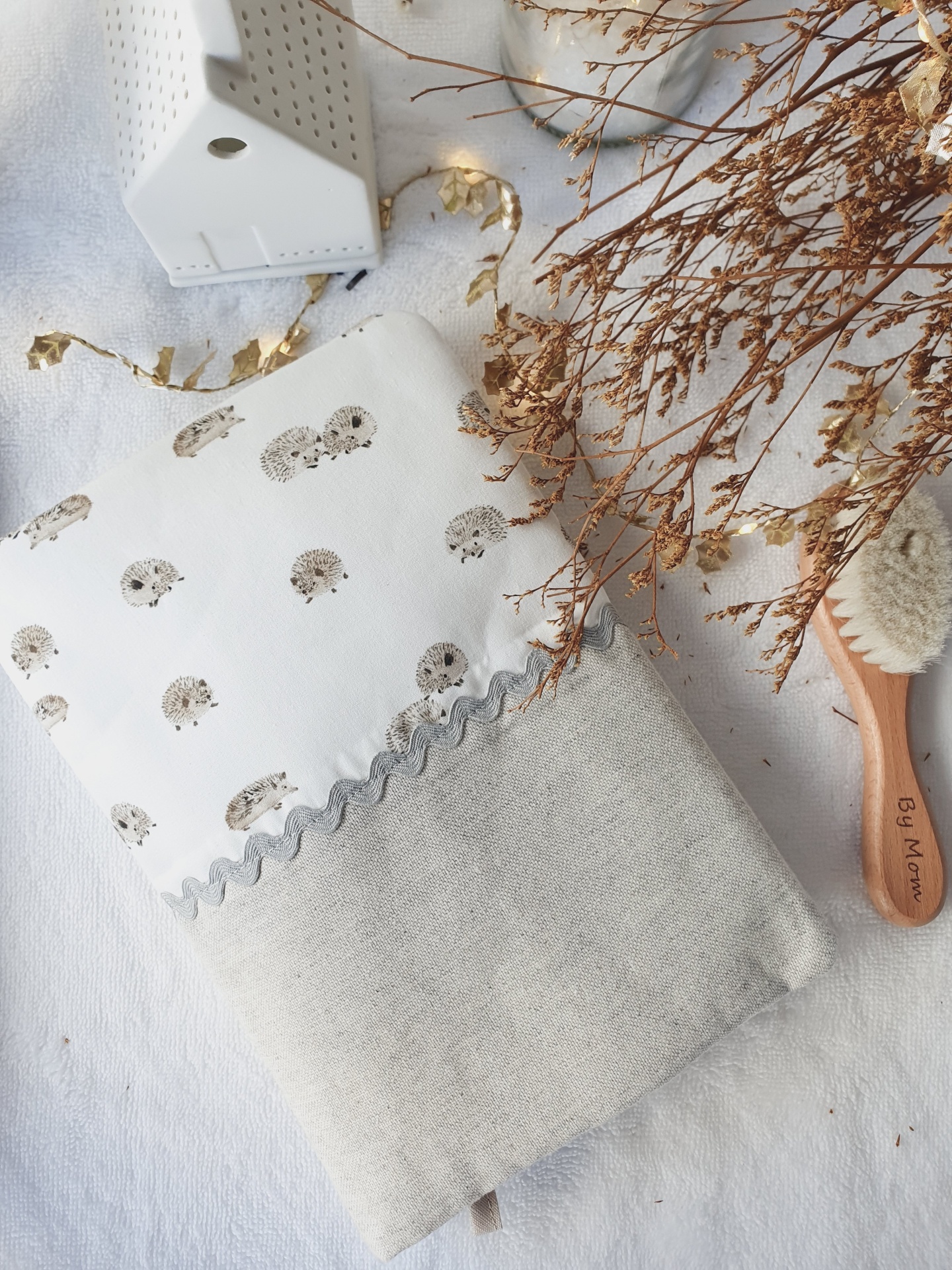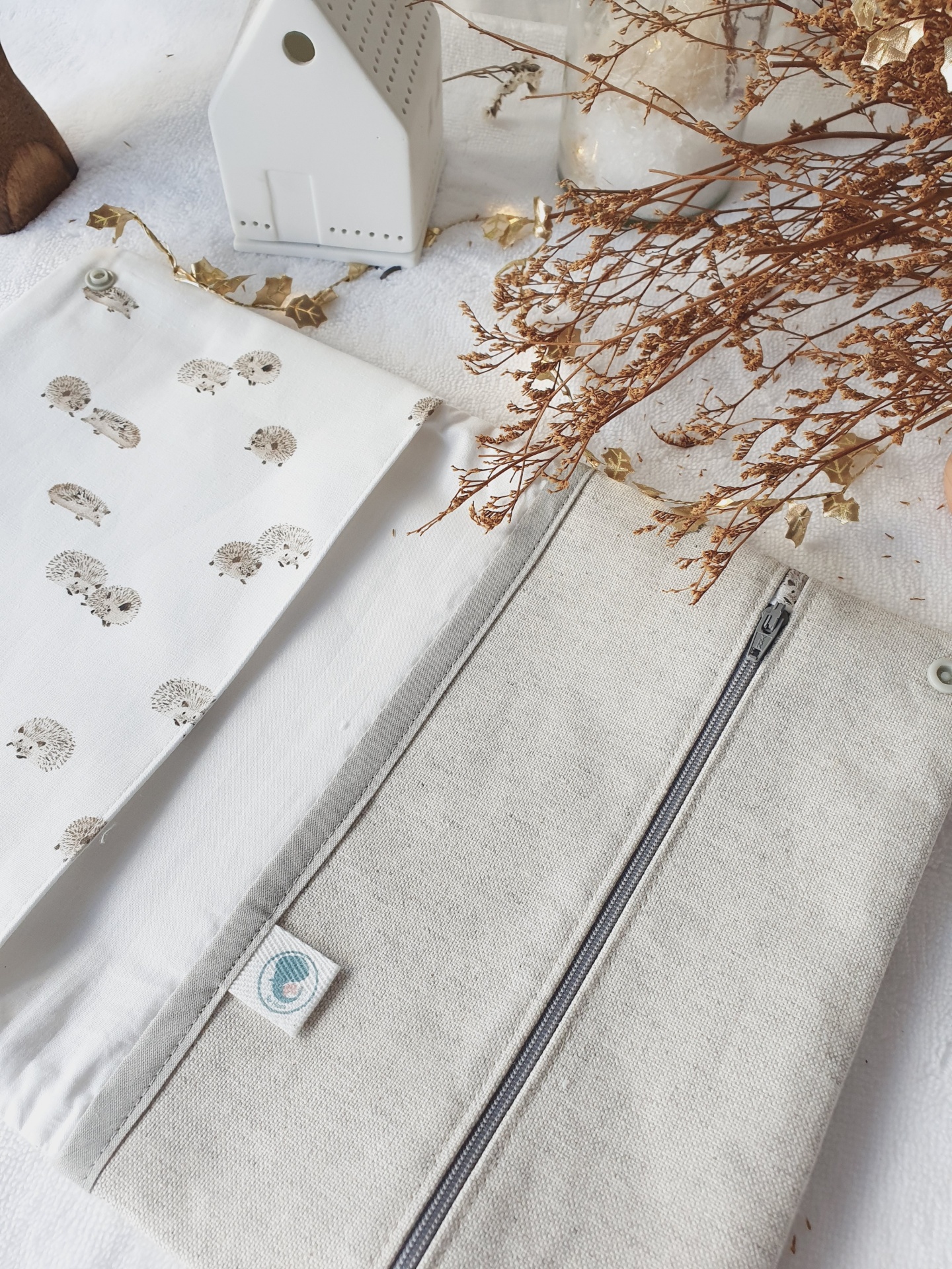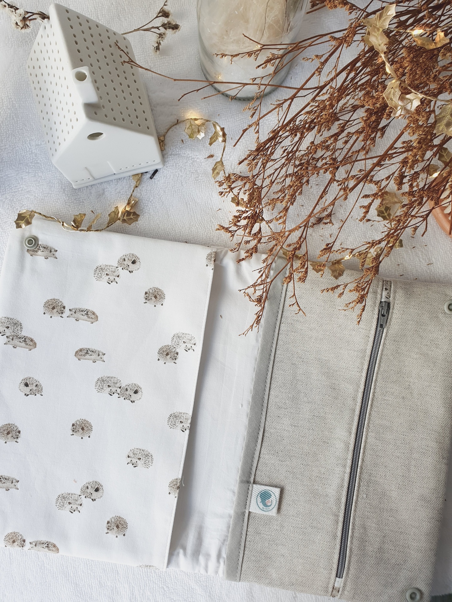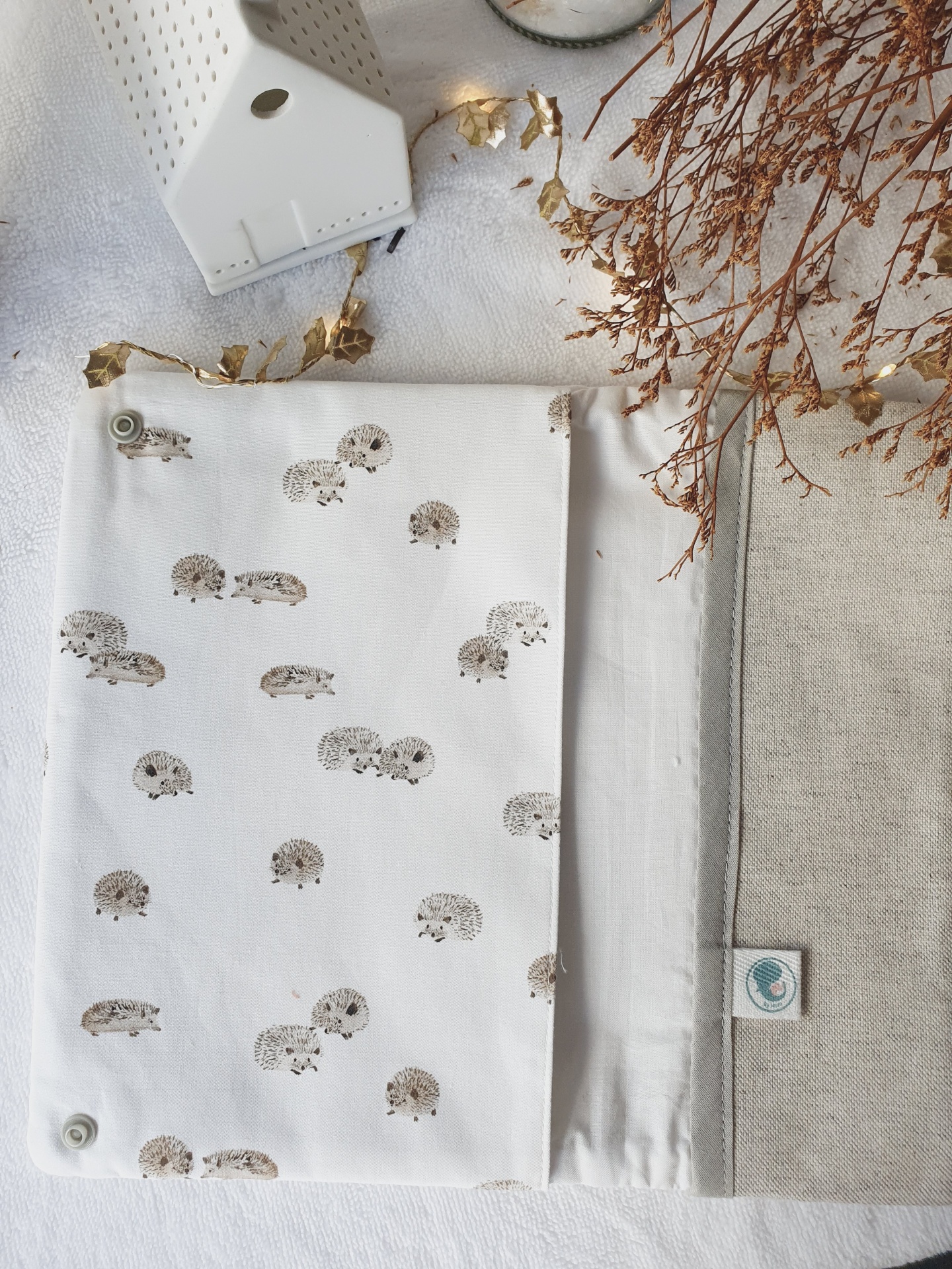 • Estojo de tecido branco com desenhos de ouriços castanhos e interior bege, com botões pressões, sobre superfície clara com flores secas e casa decorativa.