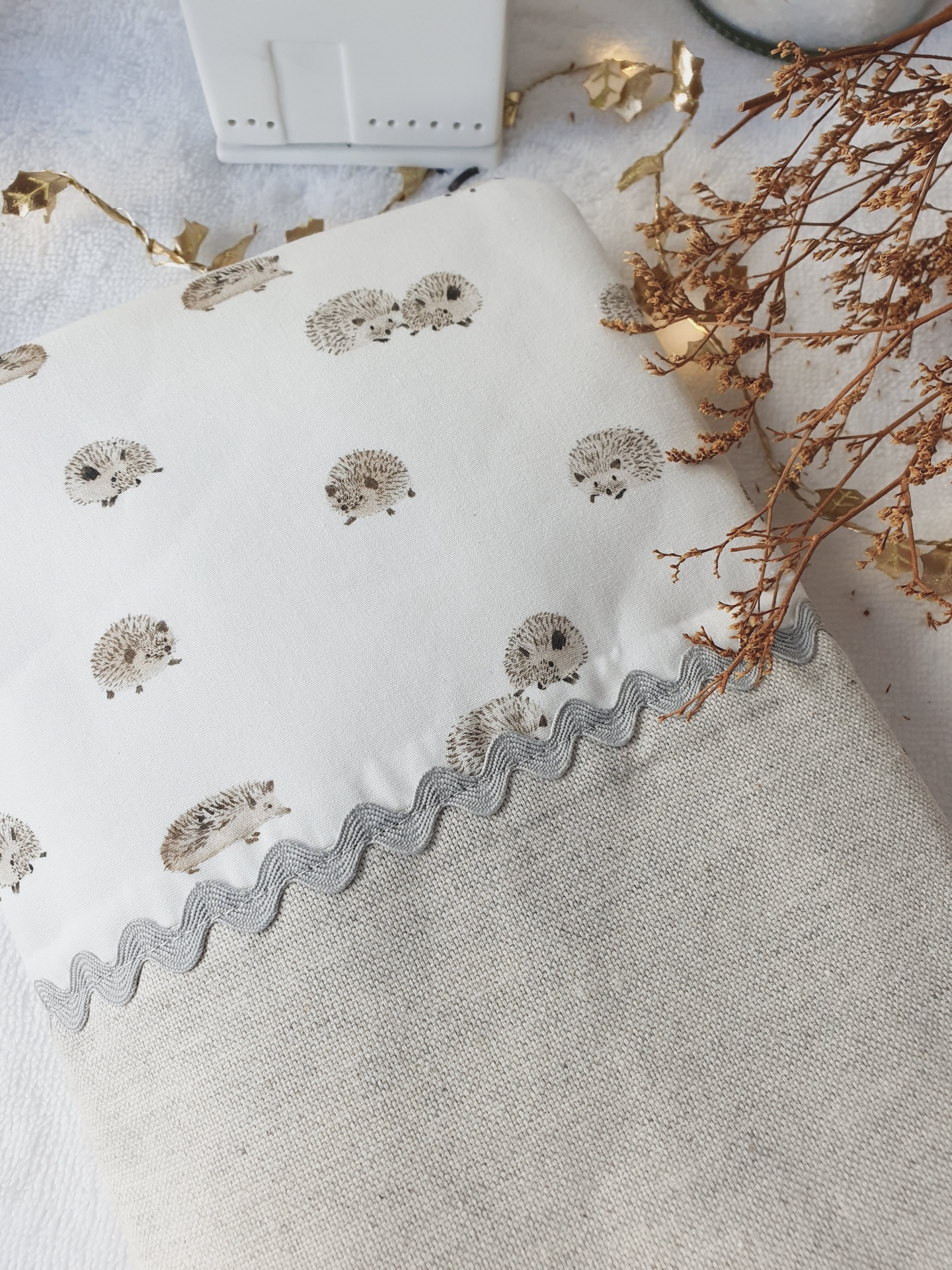 • Almofada decorativa branca com estampado de ouriços e tecido bege com fita cinzenta em ambiente decorativo