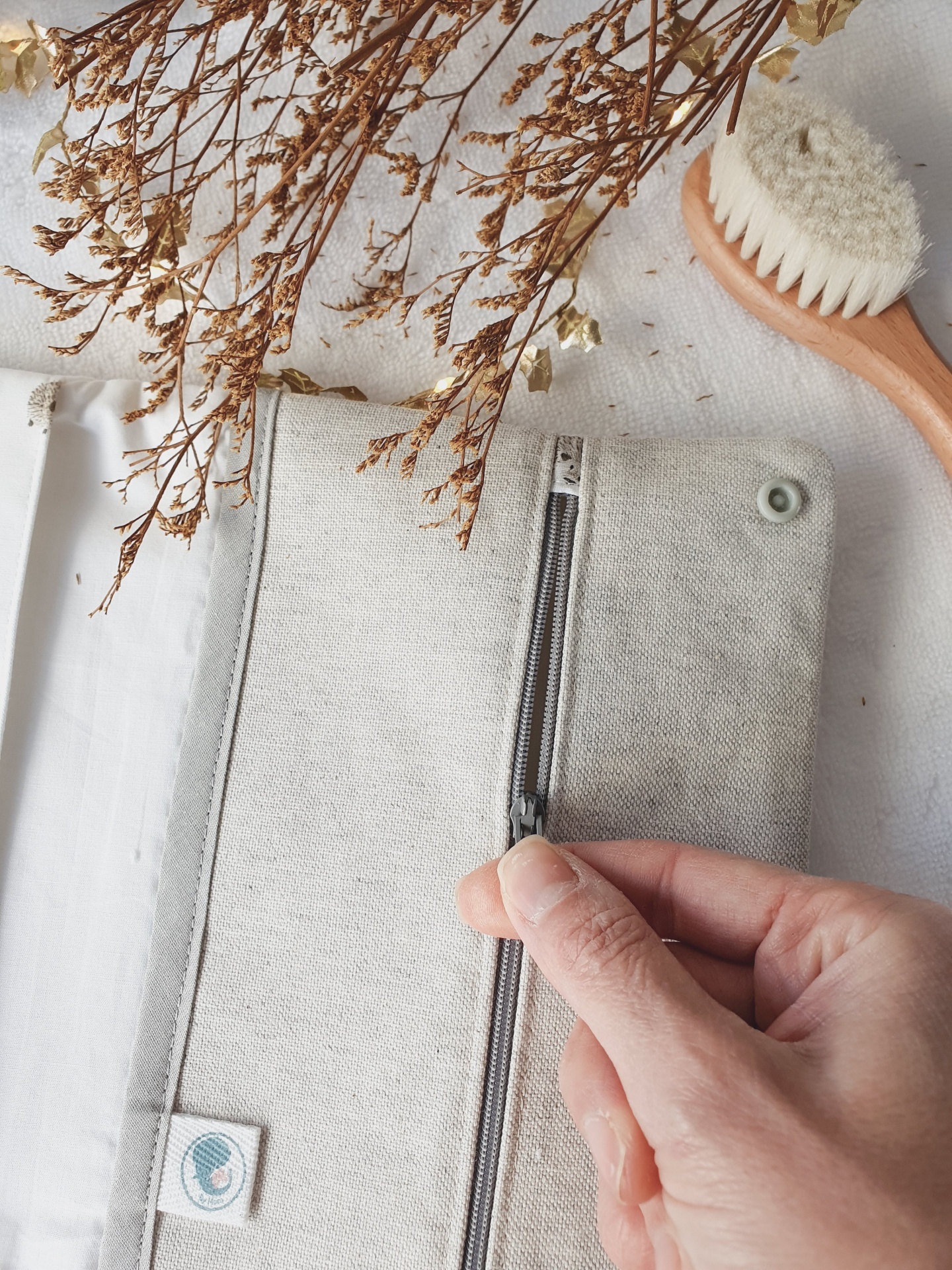 • Bolsa cinza claro com fecho de correr, escova de madeira e ramos secos sobre superfície branca