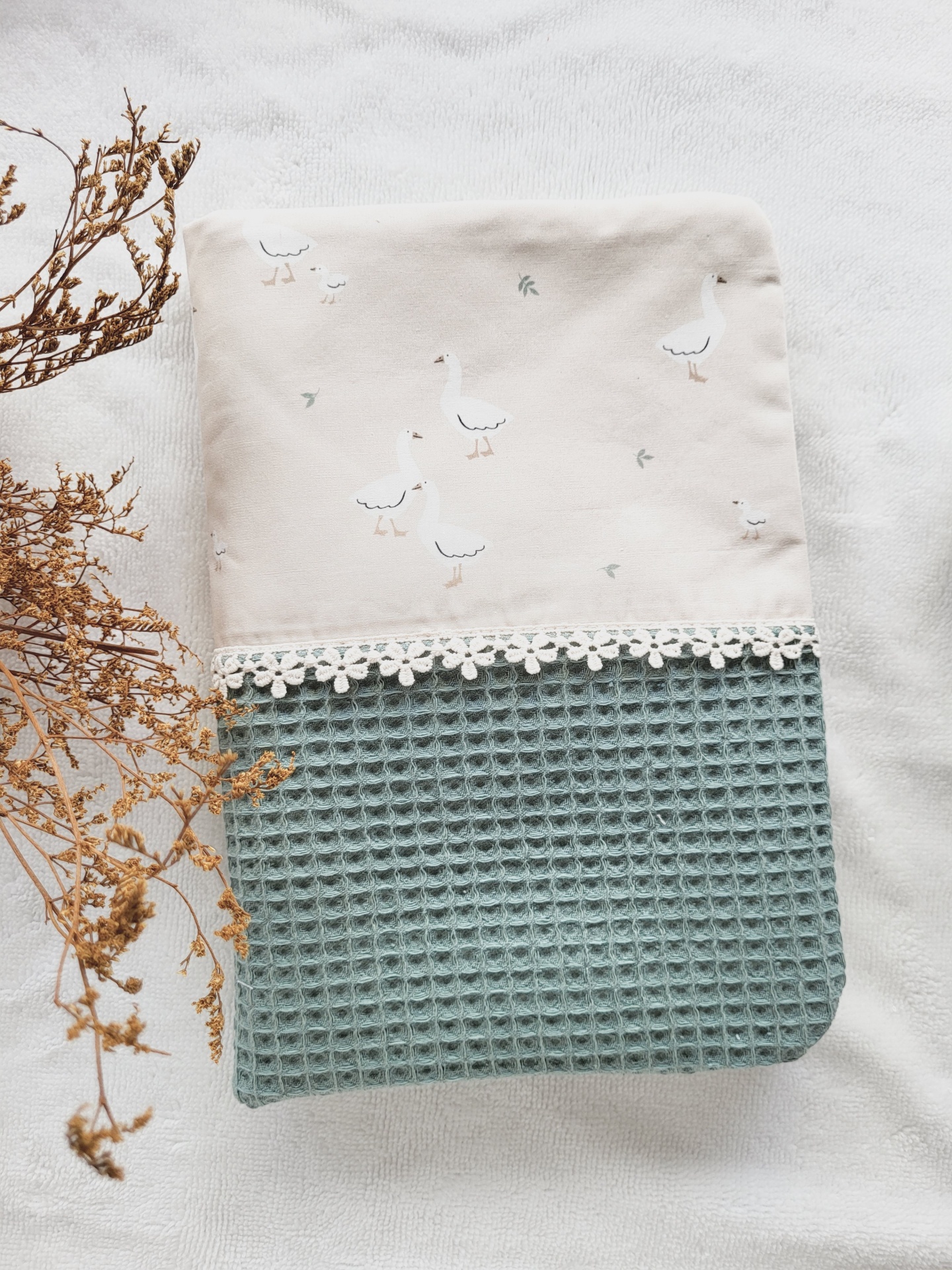 • Toalha ou capa de tecido bege com gansos brancos, parte inferior verde textura waffle, detalhe renda branca, sobre fundo branco com ramos secos