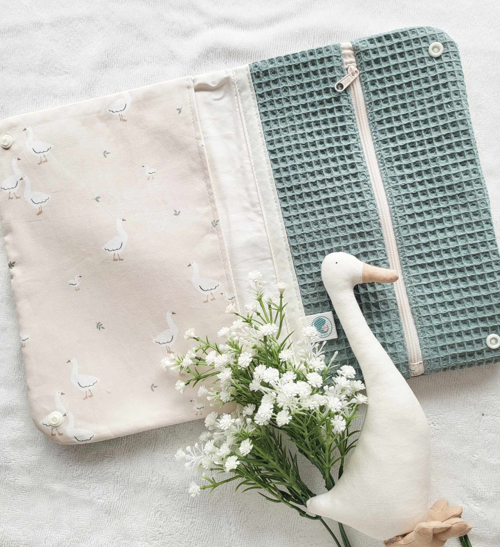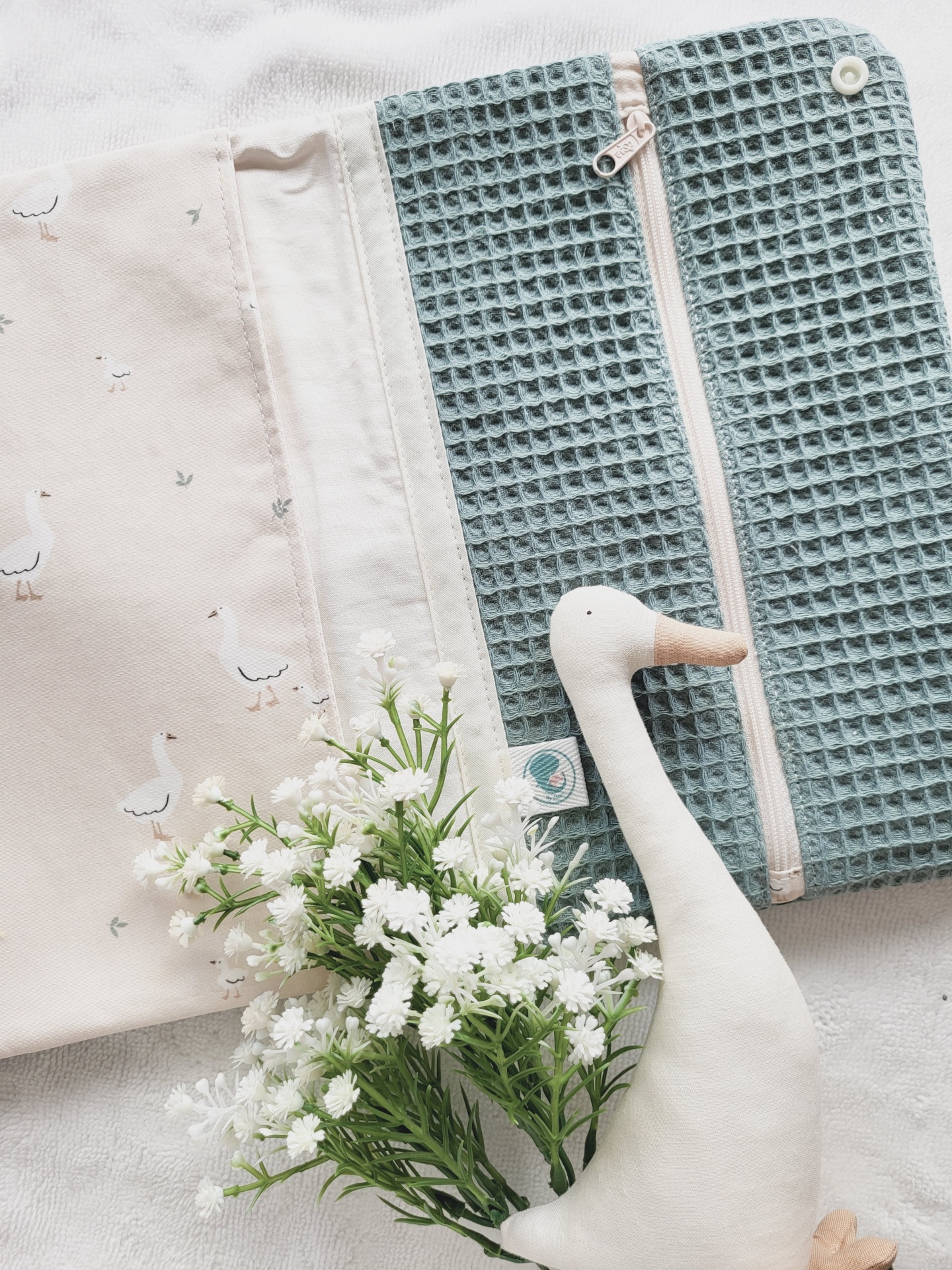 • Estojo estampado com gansos aberto, tecido azul texturizado com fecho, ramo de flores brancas e boneco de pato de tecido