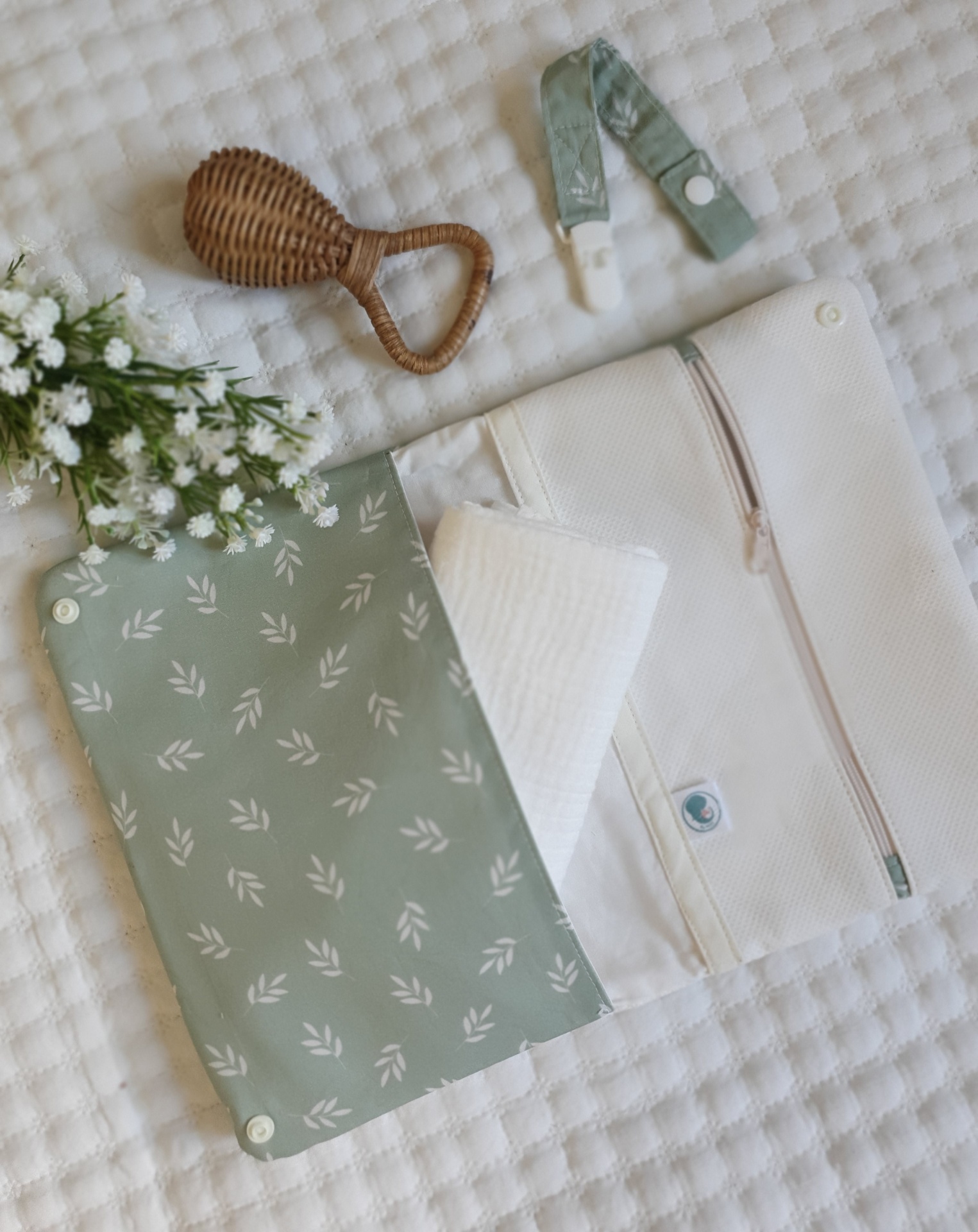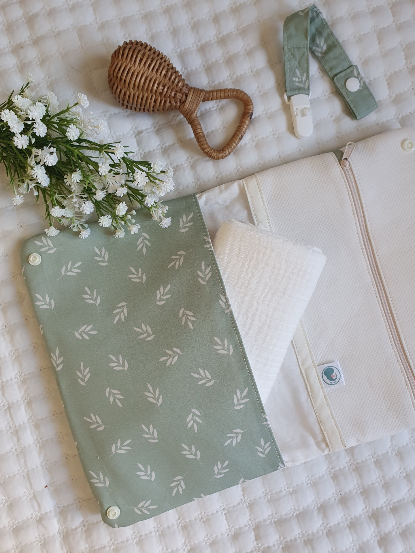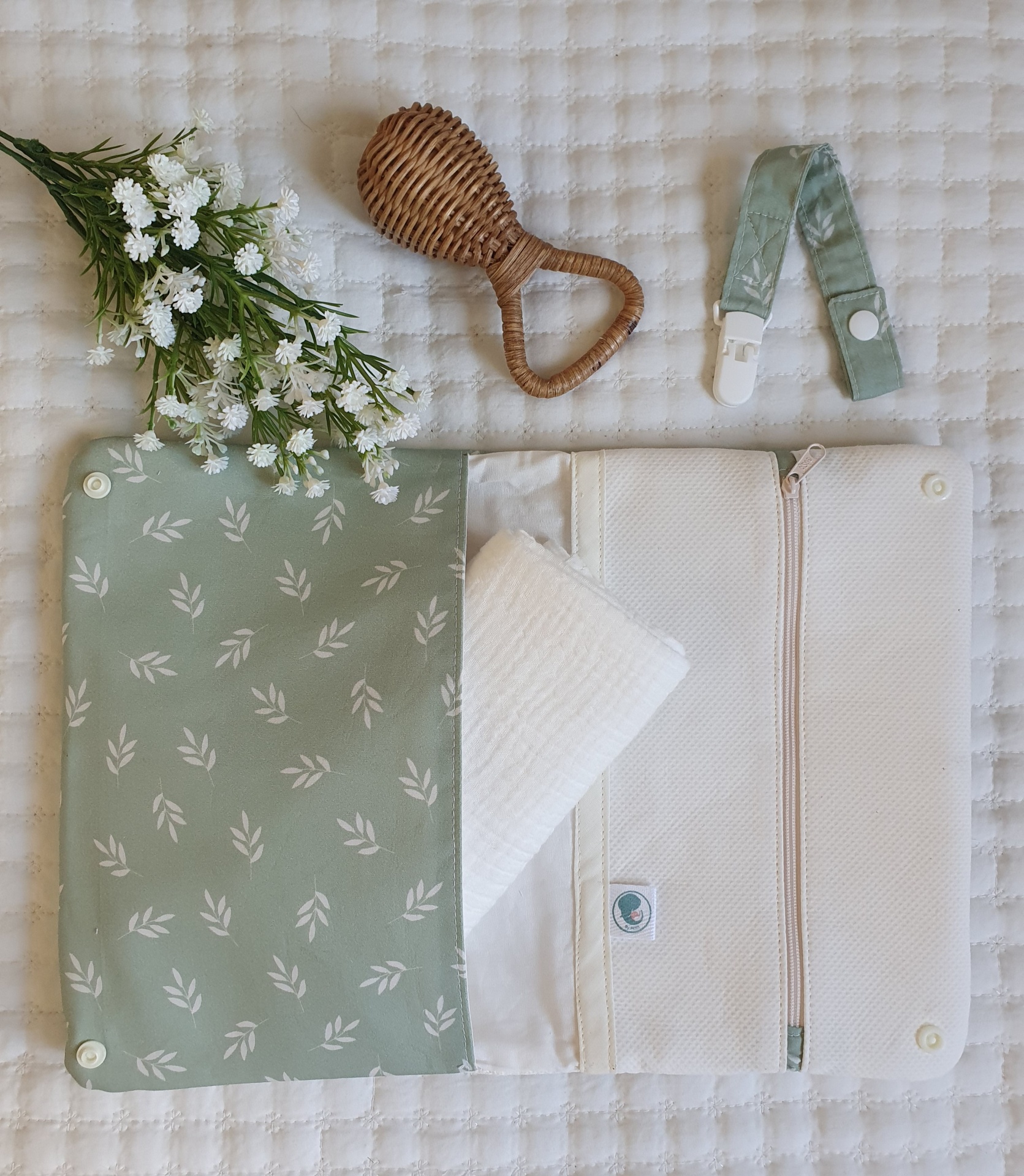Bolsa para fraldas e toalhitas Primavera verde seco 26,00 € Desconto de %. Partilhar Comprar Contactar Bolsa muito prática para levar as fraldas e toalhitas para qualquer lado e facilitar a mudança da fralda. Com dois bolsos laterais. Um dos bolsos com fecho zipper e impermeável para não deixar secar as toalhitas, nem molhar a bolsa. Feito com tecidos 100% algodão. Medidas: 25x18cm Tags Verdefloralflorestoalhitasfraldasbolsa Características